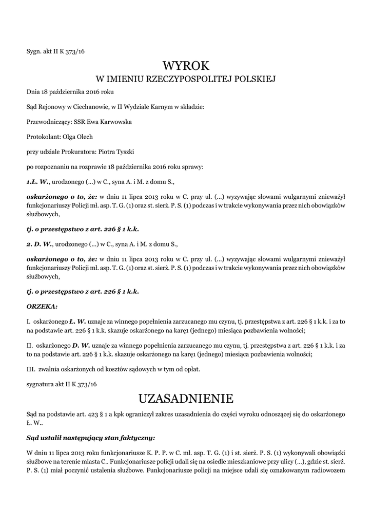 Sygn. akt II K 373/16 WYROK W IMIENIU RZECZYPOSPOLITEJ POLSKIEJ Dnia 18 października 2016 roku Sąd Rejonowy w Ciechanowie, w II Wydziale Karnym w składzie: Przewodniczący: SSR Ewa Karwowska Protokolant: Olga Olech przy udziale Prokuratora: Piotra Tyszki po rozpoznaniu na rozprawie 18 października 2016 roku sprawy: 1.Ł. W., urodzonego (...) w C., syna A. i M. z domu S., oskarżonego o to, że: w dniu 11 lipca 2013 roku w C. przy ul. (...) wyzywając słowami wulgarnymi znieważył funkcjonariuszy Policji mł. asp. T. G. (1) oraz st. sierż. P. S. (1) podczas i w trakcie wykonywania przez nich obowiązków służbowych, tj. o przestępstwo z art. 226 § 1 k.k. 2. D. W., urodzonego (...) w C., syna A. i M. z domu S., oskarżonego o to, że: w dniu 11 lipca 2013 roku w C. przy ul. (...) wyzywając słowami wulgarnymi znieważył funkcjonariuszy Policji mł. asp. T. G. (1) oraz st. sierż. P. S. (1) podczas i w trakcie wykonywania przez nich obowiązków służbowych, tj. o przestępstwo z art. 226 § 1 k.k. ORZEKA: I. oskarżonego Ł. W. uznaje za winnego popełnienia zarzucanego mu czynu, tj. przestępstwa z art. 226 § 1 k.k. i za to na podstawie art. 226 § 1 k.k. skazuje oskarżonego na karę1 (jednego) miesiąca pozbawienia wolności; II. oskarżonego D. W. uznaje za winnego popełnienia zarzucanego mu czynu, tj. przestępstwa z art. 226 § 1 k.k. i za to na podstawie art. 226 § 1 k.k. skazuje oskarżonego na karę1 (jednego) miesiąca pozbawienia wolności; III. zwalnia oskarżonych od kosztów sądowych w tym od opłat. sygnatura akt II K 373/16 UZASADNIENIE Sąd na podstawie art. 423 § 1 a kpk ograniczył zakres uzasadnienia do części wyroku odnoszącej się do oskarżonego Ł. W.. Sąd ustalił następujący stan faktyczny: W dniu 11 lipca 2013 roku funkcjonariusze K. P. P. w C. mł. asp. T. G. (1) i st. sierż. P. S. (1) wykonywali obowiązki służbowe na terenie miasta C.. Funkcjonariusze policji udali się na osiedle mieszkaniowe przy ulicy (...), gdzie st. sierż. P. S. (1) miał poczynić ustalenia służbowe. Funkcjonariusze policji na miejsce udali się oznakowanym radiowozem ubrani w mundury policyjne. Radiowóz policyjny zaparkowali przy ulicy (...) pomiędzy blokami numer (...) i numer (...). Radiowóz zaparkowany został od tyłu bloku numer (...). St. sierż. P. S. (1) udał się do pobliskiego bloku celem wykonania czynności służbowych, podczas gdy drugi z funkcjonariuszy pozostał w radiowozie. Policjant T. G. (1) siedząc w radiowozie usłyszał przez otwartą szybę głośną rozmowę trzech mężczyzn, który byli na balkonie w bloku numer (...), na (...) piętrze, przynależnym do mieszkania numer (...). Mężczyznami tymi byli Ł. W., D. W., P. G.. Mężczyźni ci używali słów powszechnie uważanych za obelżywe i kierowali je stosunku do policjanta, jak też osób postronnych. Funkcjonariusz policji T. G. (1) wysiadł z radiowozu i zwrócił mężczyznom uwagę. W tym samym czasie do radiowozu wrócił drugi z policjantów st. sierż. P. S. (1). Mężczyźni nadal zachowywali się niewłaściwie. W dalszym ciągu kierowali do policjantów słowa wulgarne i obraźliwe. Mężczyźni obrzucali wyzwiskami policjantów, wyzywali ich wypowiadając słowa "wy (...), (...) nam zrobicie, pozwalniamy was, (...)". Słowa te mężczyźni wypowiadali na przemian, wymachując przy tym rękami. Funkcjonariusze policji wielokrotnie przywoływali oskarżonych do zachowania porządku, lecz bezskutecznie. Oskarżeni po zwróceniu im uwagi jeszcze głośniej kierowali słowa wulgarne i obraźliwe "(...), (...), pozwalniamy was z pracy". O tym zdarzeniu został zawiadomiony dyżurny KPP w C., który na miejsce skierował drugi patrol policji w załodze: T. Ż. i A. N.. Funkcjonariusze policji w osobach T. G. (1), P. S. (1) i T. Ż. udali się do mieszkania numer (...), do którego przynależał balkon, z którego padły znieważenia. Pomimo pukania do drzwi przez policjantów, mieszania nikt nie otworzył. Przez drzwi mieszkania dochodziły głośno kierowane do policjantów słowa "(...) nam zrobicie, (...)". Słowa te wypowiadali Ł. W., D. W., P. G.. Policjanci odstąpili od dalszych czynności, z uwagi na to, że mężczyźni byli im znani. Oskarżony Ł. W. jest osobą młodą, ma dwadzieścia dziewięć lat, posiada wykształcenie zawodowe, na stałe nigdzie nie pracuje, utrzymuje się z prac dorywczych za granicą, jest bezdzietny i nie posiada nikogo na utrzymaniu. Oskarżony był dotychczas wielokrotnie karany. Powyższy stan faktyczny Sąd ustalił w oparciu o: zeznania świadków T. G. k.2v, 253-254, P. S. k. 11v, 254, dane o karalności k. 199-200. Oskarżony Ł. W. nie przyznał się do popełnienia zarzucanego mu czynu. W toku dochodzenia wyjaśnił, iż w dniu zdarzenia tj. 11 lipca 2013 roku nie był w mieszkaniu numer (...) przy ulic (...) w C.. W tym dniu nie przebywał w ogóle na osiedlu (...), jak też wyjaśnił, iż nie mieszka w tym miejscu. (k.18) Oskarżony Ł. W. nie wziął udziału w rozprawie sądowej. (k.252) Sąd ustalenia faktyczne w sprawie poczynił w oparciu o zeznania pokrzywdzonych w sprawie funkcjonariuszy policji. Sąd dał wiarę w całości relacji T. G. (1) jak i P. S. (1), ponieważ ich zeznania są zbieżne i uzupełniają się wzajemnie. Nie ma podstaw by kwestionować te zeznania i uznać je za manipulację mającą obciążyć oskarżonego. Przesłuchani funkcjonariusze nie mieli żadnych powodów jako osoby obce dla oskarżonego, aby pomawiać go o czyn nie popełniony. Dodatkowo zeznania policjantów nie są nacechowane żadnymi negatywnymi emocjami w stosunku do któregokolwiek z oskarżonych, żaden ze świadków nie wypowiada żalu czy niechęci. W sprawie nie wystąpił żaden inny dowód, który skutecznie podważyłby relacje pokrzywdzonych. Dowody przeciwne zostały uznane przez Sąd za niewiarygodne ze wskazanych poniżej powodów. Wobec czego Sąd przyznał walor pełnej wiarygodności zeznaniom policjantów 