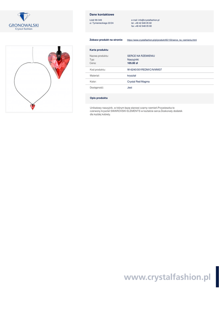 Powered by TCPDF (www.tcpdf.org) Dane kontaktowe Łódź 90-349 ul. Tymienieckiego 22/24 Zobacz produkt na stronie: e-mail: [email protected] tel. +48 42 648 05 60 fax +48 42 648 05 80 https://www.crystalfashion.pl/pl/produkt/65/153/serce_na_rzemieniu.html Karta produktu Nazwa produktu: Typ: Cena: SERCE NA RZEMIENIU Naszyjniki 105.00 zł Kod produktu: W-6240/001REDM/C/N/MM37 Materiał: kryształ Kolor: Crystal Red Magma Dostępność: Jest Opis produktu Unikatowy naszyjnik, w którym bazę stanowi czarny rzemień.Przywieszka to czerwony kryształ SWAROVSKI ELEMENTS w kształcie serca.Doskonały dodatek dla każdej kobiety.