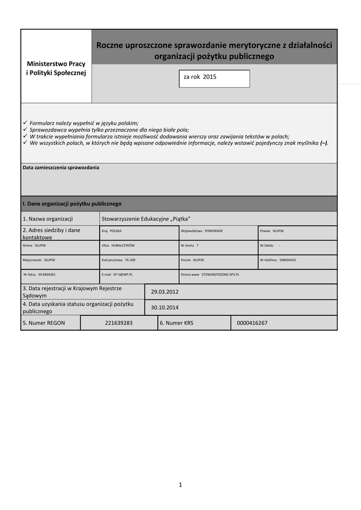 Ministerstwo Pracy i Polityki Społecznej Roczne uproszczone sprawozdanie merytoryczne z działalności organizacji pożytku publicznego za rok 2015 Formularz należy wypełnić w języku polskim; Sprawozdawca wypełnia tylko przeznaczone dla niego białe pola; W trakcie wypełniania formularza istnieje możliwość dodawania wierszy oraz zawijania tekstów w polach; We wszystkich polach, w których nie będą wpisane odpowiednie informacje, należy wstawić pojedynczy znak myślnika (–). Data zamieszczenia sprawozdania I. Dane organizacji pożytku publicznego 1. Nazwa organizacji 2. Adres siedziby i dane kontaktowe Stowarzyszenie Edukacyjne „Piątka” Kraj POLSKA Województwo POMORSKIE Powiat SŁUPSK Gmina SŁUPSK Ulica HUBALCZYKÓW Nr domu 7 Nr lokalu Miejscowość SŁUPSK Kod pocztowy 76-200 Poczta SŁUPSK Nr telefonu 598404201 Nr faksu 59 8404301 E-mail [email protected] Strona www STOWARZYSZENIE.SP5.PL 3. Data rejestracji w Krajowym Rejestrze Sądowym 4. Data uzyskania statusu organizacji pożytku publicznego 5. Numer REGON 221639283 29.03.2012 30.10.2014 6. Numer KRS 1 0000416267 - Imię i nazwisko Funkcja PIOTR CERANOWSKI PREZES DOROTA DANKOWSKA WICEPREZES BEATA PASZUN SEKRETARZ Wpisany do KRS 7. Skład organu zarządzającego organizacji (Należy wpisać imiona, nazwiska oraz informacje o funkcji pełnionej przez poszczególnych członków organu zarządzającego) Imię i nazwisko Funkcja BEATA KUBISZEWSKA KOMISJA REWIZYJNA ALINA DOKTÓR KOMISJA REWIZYJNA ELŻBIETA PAJEWSKA KOMISJA REWIZYJNA 8. Skład organu kontroli lub nadzoru organizacji (Należy wpisać imiona, nazwiska oraz informacje o funkcji pełnionej przez poszczególnych członków organu kontroli lub nadzoru) II. Charakterystyka działalności organizacji pożytku publicznego w okresie sprawozdawczym 1.Opis działalności pożytku publicznego 2 Wpisany do KRS 1.1. Opis głównych działań podjętych przez organizację Udział w WOŚP 2015 – Zorganizowanie w SP-5 salonu zabytkowych gier komputerowych Przygotowanie dokumentacji projektowej FIO 2015 - "Odkrywanie skarbów regionu" „Buda dla Łapka” zbiórka karmy i odwiedziny w schronisku dla zwierząt; Przygotowanie konkursowej dokumentacji projektowej „Błękitna szkoła na piątkę” złożonej do Prezydenta Miasta Słupska; Zorganizowanie Kampanii informacyjnej dotyczącej przekazania 1% dla OPP – nakręcenie reklamy filmowej i promocja działań stowarzyszenia; Przygotowanie i organizacja wraz z Samorządem Szkolnym kiermaszu wielkanocnego; Projekt pocztówki wielkanocnej – działanie plastyczne ze słupskim artystą dr Kazimierzem Jałowczykiem Przygotowywanie merytoryczne wspólnie z rodzicami uczniów dokumentacji projektowej Eko – elektroaktywni w ramach działalności Słupskiego Akumulatora Społecznego; Pilotażowy projekt lektoratu języka niemieckiego – „Niemiecki online” Nagranie przedstawienia niemieckojęzycznego z udziałem uczniów klasy 1c, które uzyskało II miejsce w Ogólnopolskim Konkursie „DaF –Kenner in den Dachl – Landern”; „Wiosenny zawrót głowy” - udział w akcji charytatywnej na rzecz wielodzietnej rodziny ze Słupska; Współpraca z firmą CURVER w celu pozyskania pojemników z tworzywa sztucznego do przechowywania i porządkowania pomocy dydaktycznych; Przeprowadzenie dla dzieci z SPzOI nr 5 w Słupsku Turnieju Gier Komputerowych Trackmania Udział w festynie szkolnym i zbiórka funduszy na sprzęt multimedialny (projektor) do działań edukacyjnych stowarzyszenia; Przygotowanie kampanii informacyjnych z podziękowaniem za przekazanie 1% na działalność statutową OPP Stowarzyszenia Edukacyjnego „Piątka” Współpraca z Akademią Pomorską w Słupsku w dziedzinie elektrotechniki i uzyskanie certyfikatu bezpieczeństwa dla zebranego przez uczniów minerału – magnetytu; Organizacja działań ekologicznych – Szkolnej Zbiórki Elektrośmieci Prowadzenie zajęć elektrotechnicznych i pokaz elektro-konstrukcji zbudowanych z uczniami SPzOI nr5; Akcja ekologiczna „Elektro-rabatka z Castoramą”- sprzedaż zebranych płyt CD i DVD i z uzyskanych pieniędzy zakup roślin oraz posadzenie ich na terenie szkoły; „Wakacje na fotografii” - pomoc w organizacji szkolnego konkursu fotograficznego; Przygotowanie, wydruk i oprawa specjalistycznych materiałów edukacyjnych dla uczniów niepełnosprawnych ze Szkoły Podstawowej z Oddziałami integracyjnymi nr 5 w Słupsku. Przeprowadzenie konkursu plastycznego: „Moje zdrowe śniadanie” dla uczniów klas 1-3 Współpraca z klubem osiedlowym Coolturka – organizacja zajęć dla uczniów klas 6 SPzOI nr 5 z projektowania, modelowania i wydruku 3D. Przygotowanie zamówień i zakup urządzeń komputerowych do prowadzenia informatycznych działań edukacyjnych dla dzieci z funduszy uzyskanych w ramach 1%; Wraz a Samorządem Szkolnym SP-5 wspólne działania na rzecz Słupskiego Schroniska dla Zwierząt - organizacja szkolnej zbiórki karmy i kocy a także wirtualna adopcja psa „Kevina”; Organizacja warsztatów ceramicznych dla dzieci o nieharmonijnym rozwoju z okazji Międzynarodowego Dnia Osób Niepełnosprawnych Przygotowanie pocztówki świąteczno – noworocznej. Działanie plastyczne ze słupskim artystą dr Kazimierzem Jałowczykiem. 3 najbliższe sąsiedztwo (osiedle, dzielnica, sołectwo, wieś, przysiółek) 1.2. Zasięg terytorialny faktycznie prowadzonej przez organizację działalności pożytku publicznego (Należy wskazać jedną lub więcej pozycji) gmina województwo kilka gmin kilka województw powiat cały kraj kilka powiatów poza granicami kraju 2. Informacja dotycząca liczby odbiorców działań organizacji pożytku publicznego w okresie sprawozdawczym 2.1. Liczba odbiorców działań organizacji (Należy oszacować liczbę odbiorców działań organizacji w okresie sprawozdawczym, w podziale na osoby fizyczne i osoby prawne) 2.2. Informacje na temat innych (niż wymienionych w pkt 2.1) odbiorców, na rzecz których organiza