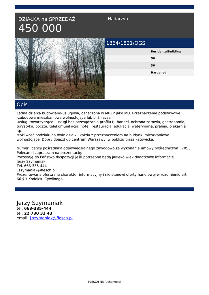 DZIAŁKA na SPRZEDAŻ Nadarzyn 450 000 1864/1821/OGS ResidentalBuilding 56 36 Hardened Opis Ładna działka budowlano-usługowa, oznaczona w MPZP jako MU. Przeznaczenie podstawowe: -zabudowa mieszkaniowa wolnostojąca lub bliźniacza -usługi towarzyszące i usługi bez przesądzania profilu tj: handel, ochrona zdrowia, gastronomia, turystyka, poczta, telekomunikacja, hotel, restauracja, edukacja, weterynaria, pralnia, piekarnia itp. Możliwość podziału na dwie działki, każda z przeznaczeniem na budynki mieszkaniowe wolnostojące. Dobry dojazd do centrum Warszawy, w pobliżu trasa katowicka. Numer licencji pośrednika odpowiedzialnego zawodowo za wykonanie umowy pośrednictwa : 7053 Polecam i zapraszam na prezentację. Pozostaję do Państwa dyspozycji jeśli potrzebne będą jakiekolwiek dodatkowe informacje. Jerzy Szymaniak Tel. 663-335-444 [email protected] Prezentowana oferta ma charakter informacyjny i nie stanowi oferty handlowej w rozumieniu art. 66 § 1 Kodeksu Cywilnego. Jerzy Szymaniak tel. 663-335-444 tel. 22 730 33 43 email: [email protected] FLESCH Nieruchomości Powered by TCPDF (www.tcpdf.org)