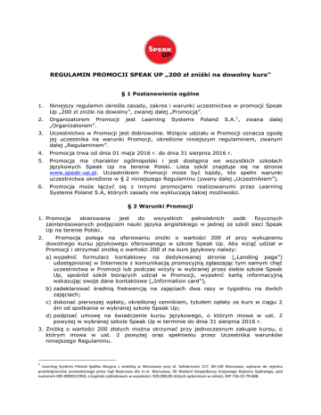 REGULAMIN PROMOCJI SPEAK UP „200 zł zniżki na dowolny kurs” § 1 Postanowienia ogólne 1. Niniejszy regulamin określa zasady, zakres i warunki uczestnictwa w promocji Speak Up „200 zł zniżki na dowolny”, zwanej dalej „Promocją”. 2. Organizatorem Promocji „Organizatorem”. 3. Uczestnictwo w Promocji jest dobrowolne. Wzięcie udziału w Promocji oznacza zgodę jej uczestnika na warunki Promocji, określone niniejszym regulaminem, zwanym dalej „Regulaminem”. 4. Promocja trwa od dnia 01 maja 2016 r. do dnia 31 sierpnia 2016 r. 5. Promocja ma charakter ogólnopolski i jest dostępna we wszystkich szkołach językowych Speak Up na terenie Polski. Lista szkół znajduje się na stronie www.speak-up.pl. Uczestnikiem Promocji może być każdy, kto spełni warunki uczestnictwa określone w § 2 niniejszego Regulaminu (zwany dalej „Uczestnikiem”). 6. Promocja może łączyć się z innymi promocjami realizowanymi przez Learning Systems Poland S.A, których zasady nie wykluczają takiej możliwości. jest Learning Systems Poland S.A.1, zwana dalej § 2 Warunki Promocji 1. Promocja skierowana jest do wszystkich pełnoletnich osób fizycznych zainteresowanych podjęciem nauki języka angielskiego w jednej ze szkól sieci Speak Up na terenie Polski. 2. Promocja polega na oferowaniu zniżki o wartości 200 zł przy wykupieniu dowolnego kursu językowego oferowanego w szkole Speak Up. Aby wziąć udział w Promocji i otrzymać zniżkę o wartości 200 zł na kurs językowy należy: a) wypełnić formularz kontaktowy na dedykowanej stronie („Landing page”) udostępnionej w Internecie z komunikacją promocyjną zgłaszając tym samym chęć uczestnictwa w Promocji lub podczas wizyty w wybranej przez siebie szkole Speak Up, spośród szkół biorących udział w Promocji, wypełnić kartę informacyjną wskazując swoje dane kontaktowe („Information card”), b) zadeklarować średnią frekwencję na zajęciach dwa razy w tygodniu na dwóch zajęciach; c) dokonać pierwszej wpłaty, określonej cennikiem, tytułem opłaty za kurs w ciągu 2 dni od spotkania w wybranej szkole Speak Up; d) podpisać umowę na świadczenie kursu językowego, o którym mowa w ust. 2 powyżej w wybranej szkole Speak Up w terminie do dnia 31 sierpnia 2016 r. 3. Zniżkę o wartości 200 złotych można otrzymać przy jednoczesnym zakupie kursu, o którym mowa w ust. 2 powyżej oraz spełnieniu przez Uczestnika warunków niniejszego Regulaminu. 1 Learning Systems Poland Spółka Akcyjna z siedzibą w Warszawie przy al. Solidarności 117, 00-140 Warszawa, wpisana do rejestru przedsiębiorców prowadzonego przez Sąd Rejonowy dla m.st. Warszawy, XII Wydział Gospodarczy Krajowego Rejestru Sądowego, pod numerem KRS 0000511950, o kapitale zakładowym w wysokości: 929.000,00 złotych opłaconym w całości, NIP 726-23-79-688. 4. Nad prawidłowym przebiegiem Promocji czuwają pracownicy Speak Up, powołani przez Organizatora, którzy w razie potrzeby będą pomagać w rozstrzygnięciu wątpliwości dotyczących zasad Promocji. 5. Zniżkę o wartości 200 zł nie może zostać wymieniona na gotówkę oraz nie może stanowić przedmiotu obrotu handlowego 6. Uczestnikami Promocji nie mogą być pracownicy Organizatora, ich współmałżonkowie i dzieci, jak też osoby pozostające z nimi we wspólnym gospodarstwie domowym oraz współpracownicy Organizatora, ani osoby pozostające z nim w stosunku zlecenia lub innym stosunku prawnym, do którego stosuje się przepisy o zleceniu, współmałżonkowie i dzieci takich osób, jak też osoby pozostające z nimi we wspólnym gospodarstwie domowym. § 3 Postępowanie reklamacyjne 1. Reklamacje dotyczące przebiegu Promocji mogą być zgłaszane wyłącznie pisemnie na adres Organizatora. 2. Prawo złożenia reklamacji przysługuje jedynie Uczestnikowi Promocji przez okres trwania Promocji oraz w ciągu 30 dni po upływie jej trwania. W przypadku przesłania reklamacji drogą pocztową, o zachowaniu terminu składania reklamacji decyduje data stempla pocztowego. 3. Pisemna reklamacja powinna zawierać imię, nazwisko, dokładny adres osoby uczestniczącej w Promocji, jak również dokładny opis i wskazanie przyczyny reklamacji. 4. Reklamacje rozpatrywane będą w terminie 14 dni od dnia otrzymania reklamacji przez Organizatora. 5. Decyzja w przedmiocie reklamacji jest ostatecznym i wiążącym stanowiskiem Organizatora. § 4 Postanowienia końcowe 1. Regulamin Promocji dostępny jest w szkołach Speak Up oraz pod adresem internetowym http://lp.speak-up.pl/document/Regulamin_znizka_200zl_lato.pdf 2. Organizator zastrzega sobie prawo do zmiany Regulaminu, pod warunkiem, że taka zmiana nie naruszy praw nabytych Uczestników Promocji. Informacje o zmianie Regulaminu podane będą pod adresem internetowym wskazanym w ust. 1 powyżej ze stosownym wyprzedzeniem. 3. Akceptacja Regulaminu jest jednoznaczna z wyrażeniem zgody na wykorzystanie i przetwarzanie danych osobowych Uczestnika przez Organizatora zgodnie z ustawą z dnia 29 sierpnia 1997 r. o ochronie danych osobowych (Dz. U. z 2002 r. Nr 101, poz. 926 z późn. zm.) w celu prowadzenia Promocji. Administratorem danych osobowych jest Organizator. 4. Uczestnik Promocji ma prawo wglądu do swoich danych, o których mowa w ust. poprzedzającym oraz ich poprawiania. Podanie danych jest dobrowolne, ale niezbędne do wzięcia udziału w Promocji. 5. Spory, które mogłyby wyniknąć z tytułu wykonania zobowiązań związanych z niniejszą Promocją będą rozstrzygane polubownie, a w przypadku braku możliwości dojścia do porozumienia będą rozstrzygane przez właściwy sąd powszechny. 6. We wszystkich sprawach nieuregulowanych niniejszym Regulaminem zastosowanie mają przepisy Kodeksu Cywilnego oraz inne obowiązujące przepisy polskiego prawa. Wszelkie opracowania dokonywane na podstawie niniejszego Regulaminu mają charakter wyłącznie informacyjny.