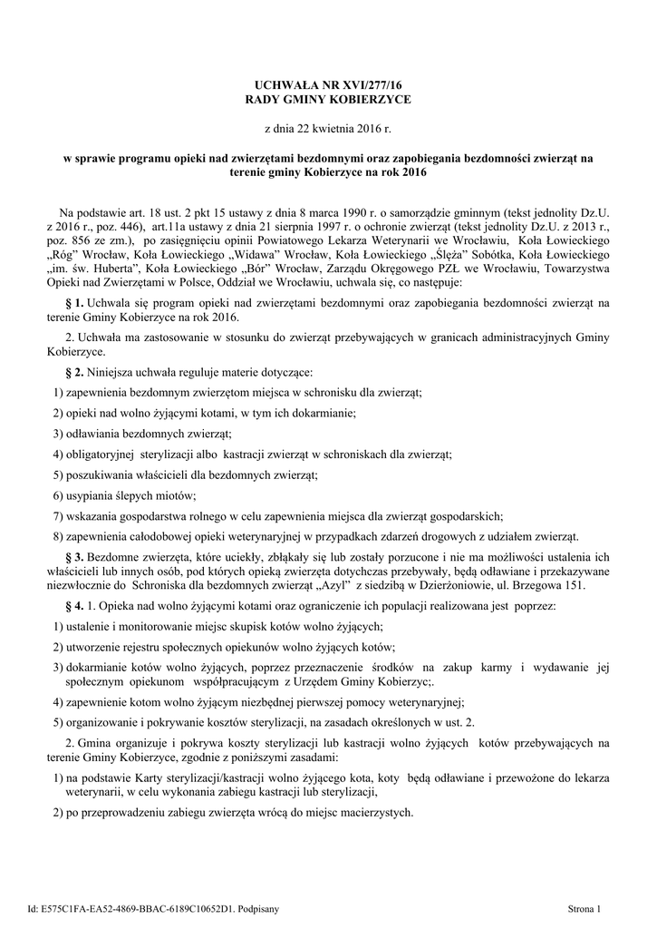 UCHWAŁA NR XVI/277/16 RADY GMINY KOBIERZYCE z dnia 22 kwietnia 2016 r. w sprawie programu opieki nad zwierzętami bezdomnymi oraz zapobiegania bezdomności zwierząt na terenie gminy Kobierzyce na rok 2016 Na podstawie art. 18 ust. 2 pkt 15 ustawy z dnia 8 marca 1990 r. o samorządzie gminnym (tekst jednolity Dz.U. z 2016 r., poz. 446), art.11a ustawy z dnia 21 sierpnia 1997 r. o ochronie zwierząt (tekst jednolity Dz.U. z 2013 r., poz. 856 ze zm.), po zasięgnięciu opinii Powiatowego Lekarza Weterynarii we Wrocławiu, Koła Łowieckiego „Róg” Wrocław, Koła Łowieckiego „Widawa” Wrocław, Koła Łowieckiego „Ślęża” Sobótka, Koła Łowieckiego „im. św. Huberta”, Koła Łowieckiego „Bór” Wrocław, Zarządu Okręgowego PZŁ we Wrocławiu, Towarzystwa Opieki nad Zwierzętami w Polsce, Oddział we Wrocławiu, uchwala się, co następuje: § 1. Uchwala się program opieki nad zwierzętami bezdomnymi oraz zapobiegania bezdomności zwierząt na terenie Gminy Kobierzyce na rok 2016. 2. Uchwała ma zastosowanie w stosunku do zwierząt przebywających w granicach administracyjnych Gminy Kobierzyce. § 2. Niniejsza uchwała reguluje materie dotyczące: 1) zapewnienia bezdomnym zwierzętom miejsca w schronisku dla zwierząt; 2) opieki nad wolno żyjącymi kotami, w tym ich dokarmianie; 3) odławiania bezdomnych zwierząt; 4) obligatoryjnej sterylizacji albo kastracji zwierząt w schroniskach dla zwierząt; 5) poszukiwania właścicieli dla bezdomnych zwierząt; 6) usypiania ślepych miotów; 7) wskazania gospodarstwa rolnego w celu zapewnienia miejsca dla zwierząt gospodarskich; 8) zapewnienia całodobowej opieki weterynaryjnej w przypadkach zdarzeń drogowych z udziałem zwierząt. § 3. Bezdomne zwierzęta, które uciekły, zbłąkały się lub zostały porzucone i nie ma możliwości ustalenia ich właścicieli lub innych osób, pod których opieką zwierzęta dotychczas przebywały, będą odławiane i przekazywane niezwłocznie do Schroniska dla bezdomnych zwierząt „Azyl” z siedzibą w Dzierżoniowie, ul. Brzegowa 151. § 4. 1. Opieka nad wolno żyjącymi kotami oraz ograniczenie ich populacji realizowana jest poprzez: 1) ustalenie i monitorowanie miejsc skupisk kotów wolno żyjących; 2) utworzenie rejestru społecznych opiekunów wolno żyjących kotów; 3) dokarmianie kotów wolno żyjących, poprzez przeznaczenie środków na zakup karmy i wydawanie jej społecznym opiekunom współpracującym z Urzędem Gminy Kobierzyc;. 4) zapewnienie kotom wolno żyjącym niezbędnej pierwszej pomocy weterynaryjnej; 5) organizowanie i pokrywanie kosztów sterylizacji, na zasadach określonych w ust. 2. 2. Gmina organizuje i pokrywa koszty sterylizacji lub kastracji wolno żyjących kotów przebywających na terenie Gminy Kobierzyce, zgodnie z poniższymi zasadami: 1) na podstawie Karty sterylizacji/kastracji wolno żyjącego kota, koty będą odławiane i przewożone do lekarza weterynarii, w celu wykonania zabiegu kastracji lub sterylizacji, 2) po przeprowadzeniu zabiegu zwierzęta wrócą do miejsc macierzystych. Id: E575C1FA-EA52-4869-BBAC-6189C10652D1. Podpisany Strona 1 3. Koty wolno żyjące opiekunów społecznych. poddane zabiegom, a nie wymagające hospitalizacji, pozostają pod opieką § 5. 1. Bezdomne zwierzęta będą odławiane przez Zdzisławę Szyszkowską prowadzącą działalność pod nazwą Prywatna Wielobranżowa Firma Usługowa „HART” Dozór Sanitarno - Porządkowy z/s w Świebodzicach, ul. Kopernika 12/5. 2. Wyłapane zwierzęta będą transportowane bezpośrednio do Schroniska dla zwierząt. 3. Na obszarze Gminy Kobierzyce będzie się okresowo dokonywać wyłapywania bezdomnych zwierząt. § 6. Bezdomne zwierzęta przebywające w schronisku dla zwierząt odłowione na terenie Gminy Kobierzyce będą sterylizowane albo kastrowane. § 7. Poszukiwanie nowych właścicieli dla bezdomnych zwierząt będzie realizowane poprzez: 1) umieszczenie informacji o możliwości adopcji na stronach internetowych Urzędu Gminy Kobierzyce oraz Schroniska dla bezdomnych zwierząt. 2) współpracę z organizacjami pozarządowymi, których statutowym celem działania jest ochrona zwierząt. § 8. 1. Gmina organizuje i pokrywa koszty uśpienia ślepych miotów bezdomnych zwierząt. 2. Określa się następujące zasady finansowania i przeprowadzenia zabiegów, o których mowa w ust. 1: 1) uśpieniu mogą podlegać wyłącznie zwierzęta, które są jeszcze ślepe i nie ma możliwości zapewnienia dla nich właścicieli; 2) zabieg uśpienia na zasadach określonych w ust. 2 pkt 1 przeprowadza wyłącznie lekarz weterynarii wybrany zgodnie z właściwymi przepisami, z którym zawierana jest umowa na świadczenie usługi usypiania ślepych miotów. § 9. 1. Zwierzęta gospodarskie w celu zapewnienia im miejsca będą umieszczane w gospodarstwie rolnym będącym własnością Pani Agaty Żurawskiej zlokalizowanym w m. Szczepankowice ul. Mokra 4a. 2. Wraz z umieszczeniem zwierząt w gospodarstwie, Gmina Kobierzyce podejmie starania w zakresie znalezienia nowego właściciela dla tych zwierząt. § 10. W przypadku zdarzeń drogowych z udziałem zwierząt całodobową opiekę weterynaryjną zapewnia Pani Agnieszka Janeczek prowadząca działalność gospodarczą pod nazwą Agnieszka Janeczek Cztery Łapy i Ty z siedzibą ul. Chabrowa 95b , 52-200 Wysoka, działająca na zlecenie Gminy Kobierzyce. § 11. Edukacja mieszkańców w zakresie humanitarnego i odpowiedzialnego traktowania zwierząt będzie prowadzona poprzez artykuły w gazetce gminnej i stronę internetową. § 12. Kwotę przeznaczoną na realizację niniejszego programu określa Uchwała Rady Gminy Kobierzyce dotycząca budżetu gminy. Na poszczególne zadania gmina planuje przeznaczyć: 1) - około 50 000 zł koszty związane z przyjęciem i przetrzymywaniem bezpańskich zwierząt w schronisku dla zwierząt. 2) - około 11 000 zł koszty związane z zabiegami sterylizacji, kastracji, uśpieniem ślepych mi