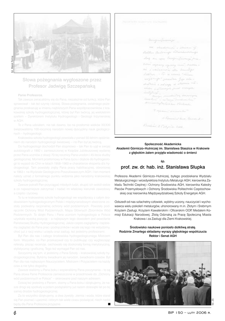 fot. Marek Torma Słowa pożegnania wygłoszone przez Profesor Jadwigę Szczepańską 6 Społeczność Akademicka Akademii Górniczo–Hutniczej im. Stanisława Staszica w Krakowie z głębokim żalem przyjęła wiadomość o śmierci śp. prof. zw. dr. hab. inż. Stanisława Słupka Profesora Akademii Górniczo–Hutniczej, byłego prodziekana Wydziału Metalurgicznego i wicedyrektora Instytutu Metalurgii AGH, kierownika Zakładu Techniki Cieplnej i Ochrony Środowiska AGH, kierownika Katedry Pieców Przemysłowych i Ochrony Środowiska Politechniki Częstochowskiej oraz kierownika Międzywydziałowej Szkoły Energetyki AGH. Odszedł od nas szlachetny człowiek, wybitny uczony, nauczyciel i wychowawca wielu pokoleń metalurgów, uhonorowany m.in. Złotym i Srebrnym Krzyżem Zasługi, Krzyżem Kawalerskim i Oficerskim OOP, Medalem Komisji Edukacji Narodowej, Złotą Odznaką za Pracę Społeczną Miasta Krakowa i za Zasługi dla Ziemi Krakowskiej. Środowisko naukowe poniosło dotkliwą stratę. Rodzinie Zmarłego składamy wyrazy głębokiego współczucia Rektor i Senat AGH fot. ZS Panie Profesorze, Tak zawsze zwracaliśmy się do Pana, niezależnie od funkcji, które Pan sprawował – tak też czynię i dzisiaj. Słowa pożegnania, ostatniego pożegnania przekazuję w imieniu najbliższych Pana współpracowników z krakowskiej szkoły hydrogeologicznej, której był Pan twórcą, jej wieloletnim szefem – Dyrektorem Instytutu Hydrogeologii i Geologii Inżynierskiej w AGH. To z Pana udziałem, nie tak dawno, bo na przełomie wieków XX/XXI świętowaliśmy 100-rocznicę narodzin nowej dyscypliny nauk geologicznych – hydrogeologii. Krakowska szkoła hydrogeologii powstała z ponad 50-letnim opóźnieniem do narodzin hydrogeologii światowej – i to Pan był jej twórcą. Do hydrogeologii dochodził Pan stopniowo – tak Pan to ujął w swojej autobiografii z 1992 r. zamieszczonej w Księdze Jubileuszowej wydanej przez Pana uczniów z okazji 70-tej rocznicy Pana urodzin i 45-lecia służby geologicznej. Moment przełomowy w Pana życiu i dojście do hydrogeologii to wyjazd do Chin w latach 1958–1960 w charakterze eksperta d/s hydrogeologii. Tam powstały zręby Pana pracy habilitacyjnej, obronionej w 1963 r. na Wydziale Geologiczno-Poszukiwawczym AGH. I ten moment należy uznać z formalnego punktu widzenia jako narodziny krakowskiej szkoły hydrogeologicznej. Zawsze potrafił Pan przyciągać młodych ludzi, skupić ich wokół siebie a co najważniejsze zatrzymać i nadać im właściwy kierunek zawodowy a często i życiowy. To tu w krakowskiej szkole hydrogeologii we współpracy z całym środowiskiem hydrogeologicznym Polski i międzynarodowym stworzone zostały podwaliny racjonalnej ochrony wód podziemnych. Powstały podręczniki Ochrony Wód Podziemnych, Mapa Głównych Zbiorników Wód Podziemnych. To dzięki Panu i Pana uczniom hydrogeologia w Polsce uzyskała wysoką pozycję – a najlepszym tego dowodem jest powołanie Państwowej Służby Hydrogeologicznej. Jakże często zaglądamy i będziemy zaglądać do Pana prac i podręczników i wcale się tego nie wstydzimy, choć już z racji wieku i urzędu oraz zasług, też jesteśmy profesorami. Był Pan dla nas i całego środowiska hydrogeologicznego Mistrzem form. Wszystko, co Pan przekazywał czy to publikując czy wygłaszając referaty, pisząc recenzje, cechowało się doskonałą formą merytoryczną, stylistyczną i graficzną. Tego też wymagał Pan od nas. Szczycimy się tym, iż jesteśmy z Pana Szkoły – krakowskiej szkoły hydrogeologicznej. Byliśmy świadkami jej narodzin, świadkami czasów. Był Pan dla nas najlepszym Nauczycielem, Mistrzem i Przyjacielem na każdy czas a nie tylko dogodny. Zawsze staliśmy u Pana boku i wspieraliśmy Pana poczynania – to są Pana słowa Panie Profesorze zamieszczone w przedmowie do „Ochrony wód podziemnych w Polsce” – skierowane pod naszym adresem. Dzisiaj też jesteśmy z Panem, stoimy u Pana boku i dziękujemy, że nasze drogi się spotkały a potem podążaliśmy już razem dziesiątki lat po tej samej drodze hydrogeologicznej. Za to wszystko dziękujemy, a dwa żywioły: ziemia i woda, które starał się Pan poznać i ujarzmić i którym tak wiele czasu poświęcał, niech nadal będą dla Pana Profesora przyjazne. BIP 150 – luty 2006 r.