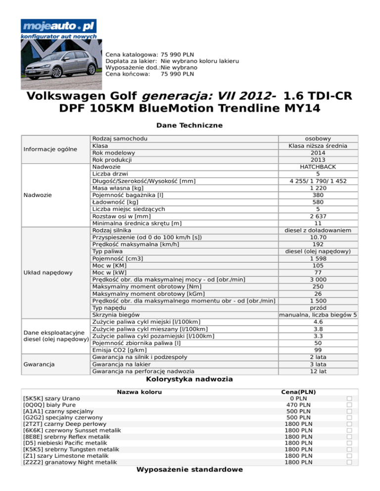 Cena katalogowa: 75 990 PLN Dopłata za lakier: Nie wybrano koloru lakieru Wyposażenie dod.:Nie wybrano Cena końcowa: 75 990 PLN Volkswagen Golf generacja: VII 2012- 1.6 TDI-CR DPF 105KM BlueMotion Trendline MY14 Dane Techniczne Rodzaj samochodu osobowy Klasa Klasa niższa średnia Informacje ogólne Rok modelowy 2014 Rok produkcji 2013 Nadwozie HATCHBACK Liczba drzwi 5 Długość/Szerokość/Wysokość [mm] 4 255/ 1 790/ 1 452 Masa własna [kg] 1 220 Nadwozie Pojemność bagażnika [l] 380 Ładowność [kg] 580 Liczba miejsc siedzących 5 Rozstaw osi w [mm] 2 637 Minimalna średnica skrętu [m] 11 Rodzaj silnika diesel z doładowaniem Przyspieszenie (od 0 do 100 km/h [s]) 10.70 Prędkość maksymalna [km/h] 192 Typ paliwa diesel (olej napędowy) Pojemność [cm3] 1 598 Moc w [KM] 105 Układ napędowy Moc w [kW] 77 Prędkość obr. dla maksymalnej mocy - od [obr./min] 3 000 Maksymalny moment obrotowy [Nm] 250 Maksymalny moment obrotowy [kGm] 26 Prędkość obr. dla maksymalnego momentu obr - od [obr./min] 1 500 Typ napędu przód Skrzynia biegów manualna, liczba biegów 5 Zużycie paliwa cykl miejski [l/100km] 4.6 Zużycie paliwa cykl mieszany [l/100km] 3.8 Dane eksploatacyjne Zużycie paliwa cykl pozamiejski [l/100km] 3.3 diesel (olej napędowy) Pojemność zbiornika paliwa [l] 50 Emisja CO2 [g/km] 99 Gwarancja na silnik i podzespoły 2 lata Gwarancja Gwarancja na lakier 3 lata Gwarancja na perforację nadwozia 12 lat Kolorystyka nadwozia Nazwa koloru [5K5K] szary Urano [0Q0Q] biały Pure [A1A1] czarny specjalny [G2G2] specjalny czerwony [2T2T] czarny Deep perłowy [6K6K] czerwony Sunsset metalik [8E8E] srebrny Reflex metalik [D5] niebieski Pacific metalik [K5K5] srebrny Tungsten metalik [Z1] szary Limestone metalik [Z2Z2] granatowy Night metalik Wyposażenie standardowe Cena(PLN) 0 PLN 470 PLN 500 PLN 500 PLN 1800 PLN 1800 PLN 1800 PLN 1800 PLN 1800 PLN 1800 PLN 1800 PLN Nazwa elementu ABS z EBV (elektroniczny korektor rozdziału siły hamowania) akustyczny sygnalizator nie wyłączonych świateł akustyczny sygnalizator nie zapiętych pasów bezpieczeństwa dla kierowcy i pasażera z przodu antena na tylnej szybie ASR (system przeciwdziałający ślizganiu się kół samochodu przy przyspieszaniu) asystent zjazdu i podjazdu bezwładnościowe 3-punktowe pasy bezpieczeństwa z regulacją wysokości dla siedzeń przednich centralny zamek sterowany drogą radiową czujnik spadku ciśnienia w oponach deaktywacja poduszki powietrznej dla pasażera dwa zagłówki z przodu z regulacją wysokości Eco-HMI (wskazówki dla użytkownika dotyczące oszczędnej jazdy) elektromechaniczne wspomaganie układu kierowniczego regulowane w zależności od prędkości samochodu ESP (elektroniczny system stabilizacji toru jazdy) hamulce tarczowe z przodu i z tyłu, z przodu wentylowane hamulec postojowy, elektromechaniczny z funkcją Auto-Hold hamulec wielokolizyjny - pomaga ograniczyć skutki kolizji poprzez zainicjowanie hamowania Isofix - przygotowanie do montażu dwóch fotelików dziecięcych na zewnętrznych siedzeniach z tyłu kierownica trójramienna kierunkowskazy boczne w obudowach lusterek zewnętrznych klimatyzacja z regulacją manualną Climatic kolumna kierownicy z możliwością regulacji w dwóch płaszczyznach komputer pokładowy obsługiwany poprzez ekran dotykowy systemu radiowego lub nawigacyjnego konsola środkowa z przodu ze schowkiem i dwoma miejscami na napoje konsola środkowa z tyłu z dwoma uchwytami na napoje listwy wykończeniowe wnętrza Dark Silver lusterka boczne regulowane elektrycznie, ustawiane i podgrzewane; lewe lusterko asferyczne manualnie sterowane szyby z tyłu MSR (system zabezpieczający blokowaniu kół napędowych podczas hamowania silnikiem) obręcze stalowe 6Jx15 w technologii "flow-forming" z kołpakami obudowy lusterek zewnętrznych i klamki w kolorze czarnym opony 195/65 R15 opony o obniżonym oporze toczenia pełnowymiarowe koło zapasowe podwójna podłoga bagażnika regulacja wysokości fotela kierowcy regulacja zasięgu reflektorów rekuperacja - odzyskiwanie energii podczas hamowania siedem poduszek powietrznych: dwie czołowe, dwie boczne, dwie kurtynowe i kolanowa dla kierowcy składane i dzielone oparcie kanapy tylnej bez podłokietnika (1/3 do 2/3) system radiowy "Composition Touch" z 5 calowym, monochromatycznym i wielofunkcyjnym ekranem dotykowym, 4 głośnikami, czytnikiem kart SD, AUX-In oraz funkcją odtwarzania muzyki w formacie MP3 system Start-Stop; wyłączanie silnika na postoju tapicerka siedzeń Pepper trzy bezwładnościowe 3-punktowe pasy bezpieczeństwa z tyłu trzy zagłówki z tyłu, środkowy zagłówek obniżony wlew paliwa z zabezpieczeniem przed zatankowaniem niewłaściwego paliwa XDS - elektroniczna blokada mechanizmu różnicowego zabezpieczenie antykradzieżowe, immobiliser zderzaki lakierowane w kolorze nadwozia zielone, termoizolujące szyby Wyposażenie dodatkowe Lista wyposażenia dodatkowego [1G3/1S1] pełnowymiarowe koło zapasowe ze stopu metali lekkich; tylko z [PJ1] [1G6/1S1] dojazdowe koło zapasowe - zamiast pełnowymiarowego koła zapasowego [4X4] boczne poduszki powietrzne dla pasażerów z tyłu [6E3] podłokietnik z przodu ze schowkiem [6FF] obudowy lusterek zewnętrznych i klamki lakierowane w kolorze nadwozia [8WH] reflektory przeciwmgielne z funkcją statycznego doświetlania zakrętów [9S5] komputer pokładowy "Plus" z monochromatycznym wyświetlaczem TFT - funkcja wyświetlania informacji z systemów asystujących, audio, nawigacji oraz telefonu [EA1] Volkswagen Safe+ - dodatkowy 1 rok; maksymalny przebieg 30 000km [EA2] Volkswagen Safe+ - dodatkowy 1 rok; maksymalny przebieg 60 000km [EA3] Volkswagen Safe+ - dodatkowy 1 rok; maksymalny przebieg 90 000km [EA4] Volkswagen Safe+ - dodatkowy 2 lata; maksymalny przebieg 40 000km [EA5] Volkswagen Safe+ - dodatkowy 2 lata; maksymalny przebieg 80 000km [EA6] Volkswagen Safe+ - dodatkowy 2 lata; maksymalny przebieg 120 000km [EA7] Volkswagen Safe+ - dodatkowy