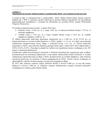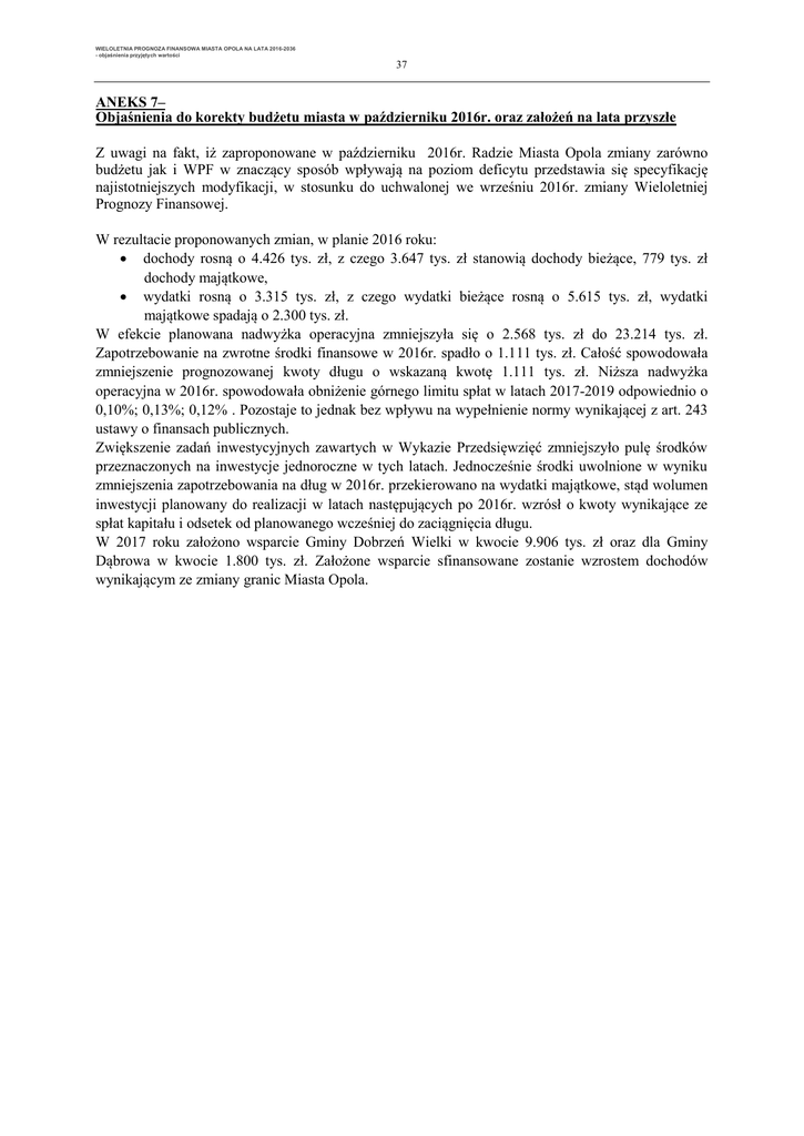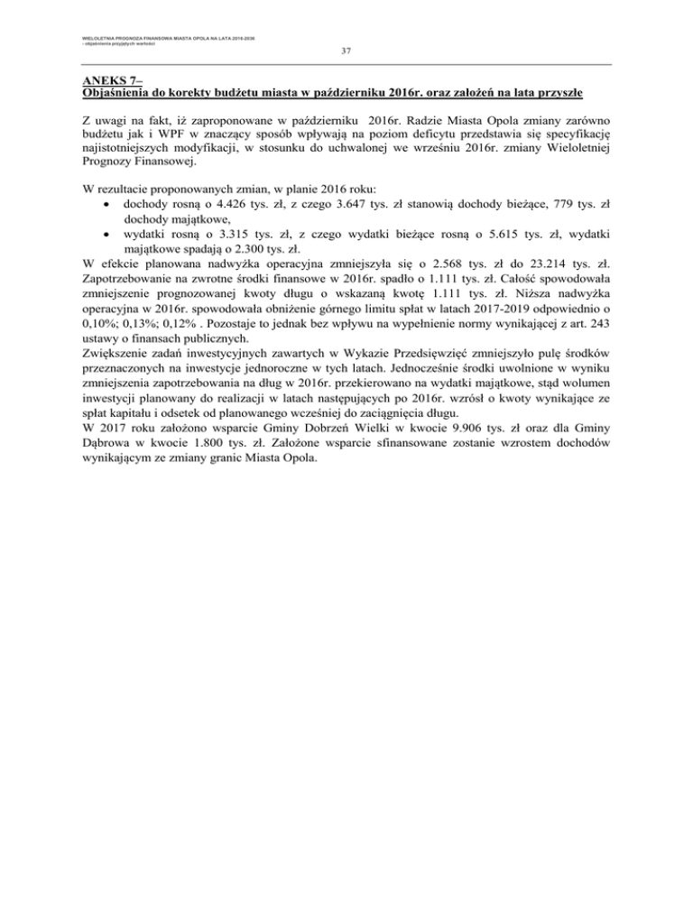WIELOLETNIA PROGNOZA FINANSOWA MIASTA OPOLA NA LATA 2016-2036 - objaśnienia przyjętych wartości 37 ANEKS 7– Objaśnienia do korekty budżetu miasta w październiku 2016r. oraz założeń na lata przyszłe Z uwagi na fakt, iż zaproponowane w październiku 2016r. Radzie Miasta Opola zmiany zarówno budżetu jak i WPF w znaczący sposób wpływają na poziom deficytu przedstawia się specyfikację najistotniejszych modyfikacji, w stosunku do uchwalonej we wrześniu 2016r. zmiany Wieloletniej Prognozy Finansowej. W rezultacie proponowanych zmian, w planie 2016 roku: dochody rosną o 4.426 tys. zł, z czego 3.647 tys. zł stanowią dochody bieżące, 779 tys. zł dochody majątkowe, wydatki rosną o 3.315 tys. zł, z czego wydatki bieżące rosną o 5.615 tys. zł, wydatki majątkowe spadają o 2.300 tys. zł. W efekcie planowana nadwyżka operacyjna zmniejszyła się o 2.568 tys. zł do 23.214 tys. zł. Zapotrzebowanie na zwrotne środki finansowe w 2016r. spadło o 1.111 tys. zł. Całość spowodowała zmniejszenie prognozowanej kwoty długu o wskazaną kwotę 1.111 tys. zł. Niższa nadwyżka operacyjna w 2016r. spowodowała obniżenie górnego limitu spłat w latach 2017-2019 odpowiednio o 0,10%; 0,13%; 0,12% . Pozostaje to jednak bez wpływu na wypełnienie normy wynikającej z art. 243 ustawy o finansach publicznych. Zwiększenie zadań inwestycyjnych zawartych w Wykazie Przedsięwzięć zmniejszyło pulę środków przeznaczonych na inwestycje jednoroczne w tych latach. Jednocześnie środki uwolnione w wyniku zmniejszenia zapotrzebowania na dług w 2016r. przekierowano na wydatki majątkowe, stąd wolumen inwestycji planowany do realizacji w latach następujących po 2016r. wzrósł o kwoty wynikające ze spłat kapitału i odsetek od planowanego wcześniej do zaciągnięcia długu. W 2017 roku założono wsparcie Gminy Dobrzeń Wielki w kwocie 9.906 tys. zł oraz dla Gminy Dąbrowa w kwocie 1.800 tys. zł. Założone wsparcie sfinansowane zostanie wzrostem dochodów wynikającym ze zmiany granic Miasta Opola.