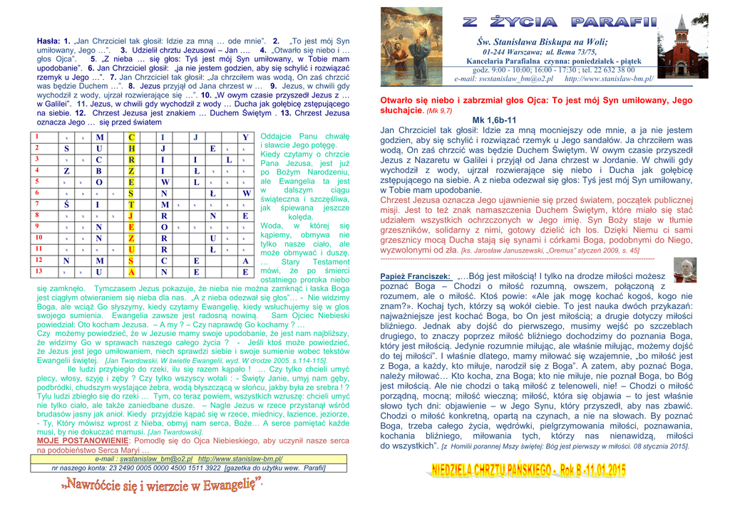 Hasła: 1. „Jan Chrzciciel tak głosił: Idzie za mną … ode mnie”. 2. „To jest mój Syn umiłowany, Jego …”. 3. Udzielił chrztu Jezusowi – Jan …. 4. „Otwarło się niebo i … głos Ojca”. 5. „Z nieba … się głos: Tyś jest mój Syn umiłowany, w Tobie mam upodobanie”. 6. Jan Chrzciciel głosił: „ja nie jestem godzien, aby się schylić i rozwiązać rzemyk u Jego …”. 7. Jan Chrzciciel tak głosił: „Ja chrzciłem was wodą, On zaś chrzcić was będzie Duchem …”. 8. Jezus przyjął od Jana chrzest w … 9. Jezus, w chwili gdy wychodził z wody, ujrzał rozwierające się …”. 10. „W owym czasie przyszedł Jezus z … w Galilei”. 11. Jezus, w chwili gdy wychodził z wody … Ducha jak gołębicę zstępującego na siebie. 12. Chrzest Jezusa jest znakiem … Duchem Świętym . 13. Chrzest Jezusa oznacza Jego … się przed światem Oddajcie Panu chwałę i sławcie Jego potęgę. Kiedy czytamy o chrzcie 3 x x I L x Pana Jezusa, jest już 4 x Z Ł x x po Bożym Narodzeniu, 5 ale Ewangelia ta jest x x x x L x dalszym ciągu 6 x x x x Ł W w świąteczna i szczęśliwa, 7 x x x x x Ś I jak śpiewana jeszcze 8 x x x x N E kolęda. 9 Woda, w której się x x x x x x x N kąpiemy, obmywa nie 10 x x x N U x tylko nasze ciało, ale 11 x x x x x Ł x może obmywać i duszę. 12 N M E A … Stary Testament 13 x x U E E mówi, że po śmierci ostatniego proroka niebo się zamknęło. Tymczasem Jezus pokazuje, że nieba nie można zamknąć i łaska Boga jest ciągłym otwieraniem się nieba dla nas. „A z nieba odezwał się głos”… - Nie widzimy Boga, ale wciąż Go słyszymy, kiedy czytamy Ewangelię, kiedy wsłuchujemy się w glos swojego sumienia. Ewangelia zawsze jest radosną nowiną. Sam Ojciec Niebieski powiedział: Oto kocham Jezusa. – A my ? – Czy naprawdę Go kochamy ? … Czy możemy powiedzieć, że w Jezusie mamy swoje upodobanie, że jest nam najbliższy, że widzimy Go w sprawach naszego całego życia ? - Jeśli ktoś może powiedzieć, że Jezus jest jego umiłowaniem, niech sprawdzi siebie i swoje sumienie wobec tekstów Ewangelii świętej. [Jan Twardowski, W świetle Ewangelii, wyd. W drodze 2005. s.114-115]. Ile ludzi przybiegło do rzeki, ilu się razem kąpało ! … Czy tylko chcieli umyć plecy, włosy, szyję i zęby ? Czy tylko wszyscy wołali : - Święty Janie, umyj nam gęby, podbródki, chudszym wystające żebra, wodą błyszczącą w słońcu, jakby była ze srebra ! ? Tylu ludzi zbiegło się do rzeki … Tym, co teraz powiem, wszystkich wzruszę: chcieli umyć nie tylko ciało, ale także zaniedbane dusze. – Nagle Jezus w rzece przystanął wśród brudasów jasny jak anioł. Kiedy przyjdzie kąpać się w rzece, miednicy, łazience, jeziorze, - Ty, Który mówisz wprost z Nieba, obmyj nam serca, Boże… A serce pamiętać każde musi, by nie dokuczać mamusi. [Jan Twardowski]. MOJE POSTANOWIENIE: Pomodlę się do Ojca Niebieskiego, aby uczynił nasze serca na podobieństwo Serca Maryi … 1 x 2 S x M U C B O C H R Z E S T J E Z U S A I J I I W N M R O R R C N J Y E x x e-mail : [email protected] http://www.stanislaw-bm.pl/ nr naszego konta: 23 2490 0005 0000 4500 1511 3922 [gazetka do użytku wew. Parafii] Św. Stanisława Biskupa na Woli; . 01-244 Warszawa; ul. Bema 73/75, Kancelaria Parafialna czynna: poniedziałek - piątek godz. 9:00 - 10:00; 16:00 - 17:30 ; tel. 22 632 38 00 e-mail: [email protected] http://www.stanislaw-bm.pl/ Otwarło się niebo i zabrzmiał głos Ojca: To jest mój Syn umiłowany, Jego słuchajcie. (Mk 9,7) Mk 1,6b-11 Jan Chrzciciel tak głosił: Idzie za mną mocniejszy ode mnie, a ja nie jestem godzien, aby się schylić i rozwiązać rzemyk u Jego sandałów. Ja chrzciłem was wodą, On zaś chrzcić was będzie Duchem Świętym. W owym czasie przyszedł Jezus z Nazaretu w Galilei i przyjął od Jana chrzest w Jordanie. W chwili gdy wychodził z wody, ujrzał rozwierające się niebo i Ducha jak gołębicę zstępującego na siebie. A z nieba odezwał się głos: Tyś jest mój Syn umiłowany, w Tobie mam upodobanie. Chrzest Jezusa oznacza Jego ujawnienie się przed światem, początek publicznej misji. Jest to też znak namaszczenia Duchem Świętym, które miało się stać udziałem wszystkich ochrzczonych w Jego imię. Syn Boży staje w tłumie grzeszników, solidarny z nimi, gotowy dzielić ich los. Dzięki Niemu ci sami grzesznicy mocą Ducha stają się synami i córkami Boga, podobnymi do Niego, wyzwolonymi od zła. [ks. Jarosław Januszewski, „Oremus” styczeń 2009, s. 45] ----------------------------------------------------------------------------------------------------------------------- Papież Franciszek: „…Bóg jest miłością! I tylko na drodze miłości możesz poznać Boga – Chodzi o miłość rozumną, owszem, połączoną z rozumem, ale o miłość. Ktoś powie: «Ale jak mogę kochać kogoś, kogo nie znam?». Kochaj tych, którzy są wokół ciebie. To jest nauka dwóch przykazań: najważniejsze jest kochać Boga, bo On jest miłością; a drugie dotyczy miłości bliźniego. Jednak aby dojść do pierwszego, musimy wejść po szczeblach drugiego, to znaczy poprzez miłość bliźniego dochodzimy do poznania Boga, który jest miłością. Jedynie rozumnie miłując, ale właśnie miłując, możemy dojść do tej miłości”. I właśnie dlatego, mamy miłować się wzajemnie, „bo miłość jest z Boga, a każdy, kto miłuje, narodził się z Boga”. A zatem, aby poznać Boga, należy miłować… Kto kocha, zna Boga; kto nie miłuje, nie poznał Boga, bo Bóg jest miłością. Ale nie chodzi o taką miłość z telenoweli, nie! – Chodzi o miłość porządną, mocną; miłość wieczną; miłość, która się objawia – to jest właśnie słowo tych dni: objawienie – w Jego Synu, który przyszedł, aby nas zbawić. Chodzi o miłość konkretną, opartą na czynach, a nie na słowach. By poznać Boga, trzeba całego życia, wędró
