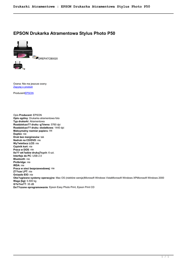 Drukarki Atramentowe : EPSON Drukarka Atramentowa Stylus Photo P50 EPSON Drukarka Atramentowa Stylus Photo P50 DREPATCB0020 Ocena: Nie ma jeszcze oceny Zapytaj o produkt ProducentEPSON Opis Producent: EPSON Opis ogólny: Drukarka atramentowa foto Typ drukarki: Atramentowa Rozdzielczo?? druku -g?ówna: 5760 dpi Rozdzielczo?? druku -dodatkowa: 1440 dpi Maksymalny rozmiar papieru: A4 Duplex: nie Druk bez marginesów: tak Nadruk na CD/DVD: nie Wy?wietlacz LCD: nie Czytnik kart: nie Praca w DOS: nie Ilo?? wk?adów drukuj?cych: 6 szt. Interfejs do PC: USB 2.0 Bluetooth: nie Pictbridge: nie IRDA: nie Praca w sieci bezprzewodowej: nie Z??cze LPT: nie Gniazdo EIO: nie Obs?ugiwane systemy operacyjne: Mac OS (niektóre wersje)Microsoft Windows VistaMicrosoft Windows XPMicrosoft Windows 2000 Waga [kg]: 5.500 kg G?o?no??: 35 dB Do??czone oprogramowanie: Epson Easy Photo Print, Epson Print CD 1 / 1 Powered by TCPDF (www.tcpdf.org)