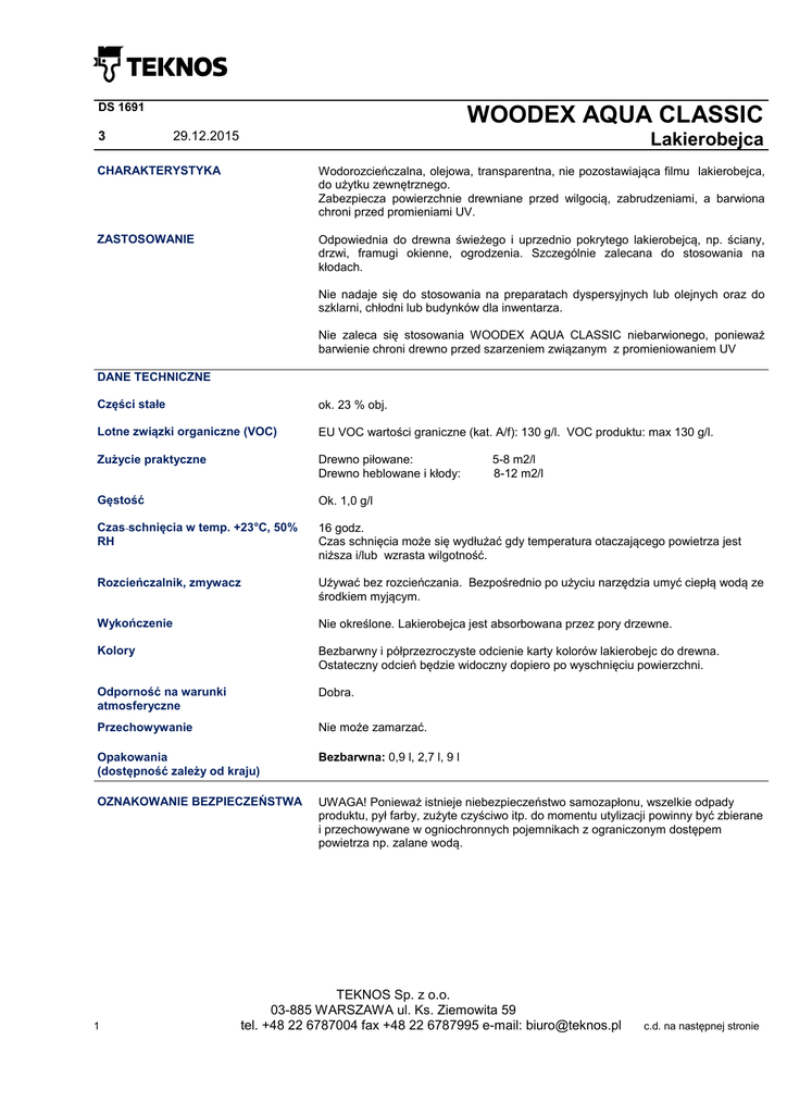 DS 1691 3 WOODEX AQUA CLASSIC 29.12.2015 Lakierobejca CHARAKTERYSTYKA Wodorozcieńczalna, olejowa, transparentna, nie pozostawiająca filmu lakierobejca, do użytku zewnętrznego. Zabezpiecza powierzchnie drewniane przed wilgocią, zabrudzeniami, a barwiona chroni przed promieniami UV. ZASTOSOWANIE Odpowiednia do drewna świeżego i uprzednio pokrytego lakierobejcą, np. ściany, drzwi, framugi okienne, ogrodzenia. Szczególnie zalecana do stosowania na kłodach. Nie nadaje się do stosowania na preparatach dyspersyjnych lub olejnych oraz do szklarni, chłodni lub budynków dla inwentarza. Nie zaleca się stosowania WOODEX AQUA CLASSIC niebarwionego, ponieważ barwienie chroni drewno przed szarzeniem związanym z promieniowaniem UV DANE TECHNICZNE Części stałe ok. 23 % obj. Lotne związki organiczne (VOC) EU VOC wartości graniczne (kat. A/f): 130 g/l. VOC produktu: max 130 g/l. Zużycie praktyczne Drewno piłowane: Drewno heblowane i kłody: Gęstość Ok. 1,0 g/l Czas schnięcia w temp. +23°C, 50% RH 16 godz. Czas schnięcia może się wydłużać gdy temperatura otaczającego powietrza jest niższa i/lub wzrasta wilgotność. Rozcieńczalnik, zmywacz Używać bez rozcieńczania. Bezpośrednio po użyciu narzędzia umyć ciepłą wodą ze środkiem myjącym. Wykończenie Nie określone. Lakierobejca jest absorbowana przez pory drzewne. Kolory Bezbarwny i półprzezroczyste odcienie karty kolorów lakierobejc do drewna. Ostateczny odcień będzie widoczny dopiero po wyschnięciu powierzchni. Odporność na warunki atmosferyczne Dobra. Przechowywanie Nie może zamarzać. Opakowania (dostępność zależy od kraju) Bezbarwna: 0,9 l, 2,7 l, 9 l OZNAKOWANIE BEZPIECZEŃSTWA UWAGA! Ponieważ istnieje niebezpieczeństwo samozapłonu, wszelkie odpady produktu, pył farby, zużyte czyściwo itp. do momentu utylizacji powinny być zbierane i przechowywane w ogniochronnych pojemnikach z ograniczonym dostępem powietrza np. zalane wodą. 1 5-8 m2/l 8-12 m2/l TEKNOS Sp. z o.o. 03-885 WARSZAWA ul. Ks. Ziemowita 59 tel. +48 22 6787004 fax +48 22 6787995 e-mail: [email protected] c.d. na następnej stronie WOODEX AQUA CLASSIC DS 1691 - 3 strona 2 SPOSÓB STOSOWANIA Przygotowanie powierzchni Odpadające kawałki drewna, kurz i brud usunąć za pomocą szczotki drucianej lub zdzieraka. Niezabezpieczone drewno zagruntować za pomocą impregnatu WOODEX AQUA BASE. Pozostawić do wyschnięcia na jeden dzień. Brudne i/lub spleśniałe powierzchnie oczyścić środkiem do czyszczenia elewacji RENSA FACADE. Aplikacja Lakierobejcę wymieszać przed użyciem. Przechowywać odpowiednią ilość bejcy w pojemniku dla każdej malowanej partii wyrobu aby uniknąć różnicy w odcieniach. Mieszać przed użyciem i od czasu do czasu w trakcie pracy. WOODEX AQUA CLASSIC nakładać za pomocą pędzla lub natrysku. Niezabezpieczone drewno pomalować raz lub dwa razy WOODEX AQUA CLASSIC, zależnie pod pożądanego efektu. Nakładać równo i dokładnie na całej długości aby uniknąć punktów wznowienia. Zaleca się aplikację pędzlem jako pierwszej powłoki, przy aplikacji natryskowej powierzchnia musi być wygładzona. Nie zaleca się stosować bezbarwnej lakierobejcy samodzielnie. Konserwacja drewnianych powierzchni pomalowanych za pomocą WOODEX AQUA CLASSIC może być dokonywana za pomocą wodorozcieńczalnych i rozpuszczalnikowych lakierobejc do drewna Teknos oraz farb do użytku w domowego. Warunki nakładania Powierzchnia przeznaczona do malowania musi być sucha. Wilgotność drewna powinna wynosić poniżej 20% wagi suchego drewna. Temperatura otoczenia, powierzchni i farby powinna wynosić powyżej +5°C, a średnia wilgotność powietrza w trakcie wykonywania i schnięcia powinna wynosić poniżej 80%. Unikać aplikacji w silnym nasłonecznieniu. Informacje zawarte w niniejszej karcie wynikają z badań laboratoryjnych i praktycznego doświadczenia. Podane wartości mają charakter orientacyjny, właściwe zależą na przykład od koloru i stopnia połysku. Ponieważ nie mamy wpływu na warunki użytkowania i nakładania preparatu, odpowiadamy jedynie za jakość produktu i gwarantujemy, że przechodzi ona naszą kontrolę jakości. Nie ponosimy odpowiedzialności za żadne straty czy szkody wynikłe z niewłaściwego i niezgodnego z przeznaczeniem zastosowania produktu. Najnowsze wersje naszych kart charakterystyki produktu, kart charakterystyki oraz kart technicznych znajdują się na naszej stronie www.teknos.com. 2 TEKNOS Sp. z o.o. 03-885 WARSZAWA ul. Ks. Ziemowita 59 tel. +48 22 6787004 fax +48 22 6787995 e-mail: [email protected]