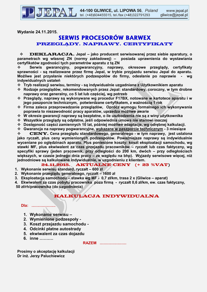Wydanie 24.11.2015. SERWIS PROCESORÓW BARWEX PRZEGLĄDY. NAPRAWY. CERTYFIKATY DEKLARACJA. Jepal – jako producent serwisowanej przez siebie aparatury, o parametrach wg własnej ZN (normy zakładowej) – posiada uprawnienia do wystawiania certyfikatów zgodności tych parametrów aparatu z tą ZN Serwis gwarancyjny, pogwarancyjny, naprawy, okresowe przeglądy, certyfikaty sprawności - są realizowane przez firmę Jepal, w trybie przyjazdu serwisu Jepal do aparatu. Możliwe jest przysłanie niektórych podzespołów do firmy, odesłanie po naprawie - wg indywidualnych ustaleń Tryb realizacji serwisu, terminy - są indywidualnie uzgadniane z Użytkownikiem aparatu Rodzaje przeglądów, rekomendowanych przez Jepal: standardowy, coroczny, w tym drobne naprawy oraz generalny, co 5 lat lub częściej, wg potrzeb Przeglądy, naprawy są wykonywane wg procedur F17BX, notowane w kartotece aparatu i w jego paszporcie technicznym, potwierdzane certyfikatem, z ważnością 1 rok Firma zaleca przeprowadzanie przeglądów, Oprócz wymogu formalnego ich wykonywania poprawia to niezawodność pracy aparatów, uprzedza możliwe awarie W okresie gwarancji naprawy są bezpłatne, o ile uszkodzenia nie są z winy użytkownika Wszystkie przeglądy są odpłatne, jeśli odpowiednia umowa nie stanowi inaczej Dostępność części zamiennych 10 lat, później możliwe adaptacje, wg odrębnej kalkulacji. Gwarancja na naprawy pogwarancyjne, wykazane w paszporcie technicznym - 3 miesiące CENY. Cena przeglądu standardowego, generalnego - w tym naprawy, jest ustalona jako ryczałt, plus ceny wymienionych podzespołów. Poważniejsze naprawy są indywidualnie wyceniane po oględzinach aparatu. Plus poniesione koszty: koszt eksploatacji samochodu, wg stawki MF, plus ekwiwalent za czas przejazdu pracowników – ryczałt lub czas faktyczny, wg specyfiki sprawy (jeden pracownik, przy odległości do 200 km, dwóch – przy odległościach większych, w czasie jednego dnia pracy – ze względu na bhp). Wyjazdy serwisowe więcej, niż jednodniowe są kalkulowane indywidualnie, w uzgodnieniu z klientem. 24.11.2015. AKTUALNE CENY (+ 23 %VAT) 1. Wykonanie serwisu standard, ryczałt – 600 zł 2. Wykonanie przeglądu generalnego, ryczałt – 1600 zł 3. Eksploatacja samochodu – stawka wg MF - 0,7 zł/km, trasa 2 x (Gliwice – aparat) 4. Ekwiwalent za czas pobytu pracownika poza firmą - ryczałt 0,6 zł/km, ew. czas faktyczny, 50 zł/rh/pracownika (do uzgodnienia) KALKULACJA INDYWIDUALNA Dla: ………………. 1. 2. 3. 4. 5. 6. Wykonanie serwisu – Wymienione podzespoły Koszt przejazdu samochodu Odcinki płatne autostrady ekwiwalent za czas dojazdu inne ………. RAZEM ………………… Prosimy o akceptację kalkulacji Dr inż. Jerzy Paluchiewicz