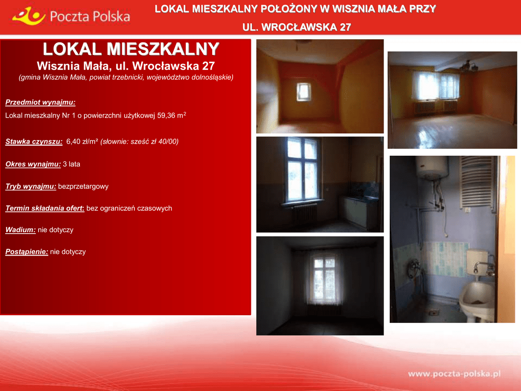 LOKAL MIESZKALNY POŁOŻONY W WISZNIA MAŁA PRZY UL. WROCŁAWSKA 27 LOKAL MIESZKALNY Wisznia Mała, ul. Wrocławska 27 (gmina Wisznia Mała, powiat trzebnicki, województwo dolnośląskie) Przedmiot wynajmu: Lokal mieszkalny Nr 1 o powierzchni użytkowej 59,36 m 2 Stawka czynszu: 6,40 zł/m² (słownie: sześć zł 40/00) Okres wynajmu: 3 lata Tryb wynajmu: bezprzetargowy Termin składania ofert: bez ograniczeń czasowych Wadium: nie dotyczy Postąpienie: nie dotyczy • Zdjęcie przedmiotu wynajmu Kliknij i zlokalizuj na mapie Opis przedmiotu wynajmu: Lokal mieszkalny usytuowany jest na dwóch poziomach budynku stanowiącego własność Poczty Polskiej S.A. Składa się z 2 pokoi (jeden z nich na innym poziomie), kuchni, przedpokoju, łazienki z WC. Lokal wyposażony jest w instalacje: elektryczną, wodno- kanalizacyjną oraz centralnego ogrzewania (węglowa). Niezależnie od czynszu Najemca będzie ponosił opłaty za wodę, nieczystości płynne, gospodarowanie odpadami komunalnymi oraz centralne ogrzewanie (węglowe). Opis nieruchomości: Miejscowość Wisznia Mała Ulica, nr budynku Wrocławska 27 Powierzchnia budynku, w którym zlokalizowany jest przedmiot wynajmu 59,36 m² Nr działki ewidencyjnej, obręb 51/2 obręb 022004_2.0015 Księga wieczysta, Sąd Rejonowy, Nr Wydziału WR1W/00007834/4 Stan prawny gruntu Własność Skarbu Państwa w użytkowaniu wieczystym Poczty Polskiej S.A. Lokalizacja i dostępność komunikacyjna: Nieruchomość położona jest w Wiszni Małej przy ul. Wrocławskiej 27, obręb nr 51/2 w województwie dolnośląskim, powiecie Trzebnickim. Elewacja frontowa usytuowana jest równolegle do drogi krajowej nr 5. Dojazd do nieruchomości przebiega drogą o nawierzchni asfaltowej. Wieś położona jest 9,5 km od miasta Trzebnica i 17,0 km od miasta Wrocławia. W budynku mieści się Filia UP wraz z jednym lokalem mieszkalnym. Opis nieruchomości: Nieruchomość położona jest w Wiszni Małej przy ul. Wrocławskiej 27 w gminie wiejskiej Wisznia Mała, w powiecie trzebnickim w województwie dolnośląskim, dla której Sąd Rejonowy w Trzebnica, IV Wydział Ksiąg Wieczystych prowadzi księgę wieczystą nr WR1W/00007834/4.Oznaczona w ewidencji gruntów nr 51/2. Przedmiotowa nieruchomość gruntowa jest własnością Skarbu Państwa w użytkowaniu wieczystym Poczty Polskiej S.A.. OBWIESZCZENIE O NAJMIE LOKALU MIESZKALNEGO Wynajmujący: Poczta Polska S.A. z siedzibą w Warszawie, 00-940 Warszawa, ul. Rodziny Hiszpańskich 8. Prowadzący konkurs ofert: Poczta Polska S.A., Pion Infrastruktury Obszar Operacyjny ds. Nieruchomości we Wrocławiu, ul. Awicenny 21, 50 -900 Wrocław. Miejsce składania ofert: Poczta Polska S.A., Pion Infrastruktury Obszar Operacyjny ds. Nieruchomości we Wrocławiu, ul. Awicenny 21, 50 -900 Wrocław – pokój Nr 102. Okres trwania umowy - 3 lata. Przedmiot najmu: Lokal mieszkalny Nr 1 usytuowany na dwóch poziomach budynku Poczty Polskiej S.A w miejscowości Wisznia Mała przy ul. Wrocławskiej 27, o powierzchni użytkowej 59,36 m², składający się z 2 pokoi (jeden z nich na innym piętrze), kuchni, przedpokoju, łazienki z WC. Wyposażony jest w instalację elektryczną wodno-kanalizacyjną, centralnego ogrzewania (węglowa). Wywoławcza stawka czynszu – 6,40 zł/m² (słownie: sześć zł 40/00 za 1 metr kwadratowy powierzchni mieszkalnej netto miesięcznie) Stawka czynszu nie obejmuje opłat eksploatacyjnych za energię elektryczna, centralne ogrzewanie (węglowe), zużycia wody, odprowadzenia ścieków oraz wywóz nieczystości stałych Wadium – nie dotyczy. Termin składania ofert: bez ograniczeń czasowych. Warunkiem przystąpienia do konkursu ofert: - złożenie pisemnej oferty zawierającej dane Oferenta oraz proponowaną stawkę czynszu za najem 1 m2 powierzchni lokalu mieszkalnego. Oferty należy składać w zamkniętych kopertach w siedzibie prowadzącego przetarg (pokój 102) z dopiskiem: „Oferta na najem lokalu mieszkalnego Nr 1 w Wiszni Małej, ul. Wrocławska 27”, - złożenie przez Oferenta oświadczenia o zapoznaniu się z treścią obwieszczenia o wynajmie lokalu mieszkalnego, ze stanem technicznym lokalu przeznaczonego do wynajmu, a także z treścią projektu umowy najmu oraz przyjęciu ich bez zastrzeżeń. Do oświadczenia należy dołączyć kserokopię dowodu osobistego, - w przypadku złożenia oferty przez jednego z małżonków, konieczne jest przedłożenie pisemnego wyrażenia zgody współmałżonka na złożenie oferty z zamiarem najmu lokalu mieszkalnego będącego przedmiotem ogłoszenia, ze środków pochodzących z majątku wspólnego, - w przypadku osób prawnych i jednostek organizacyjnych nieposiadających osobowości prawnej, osoba reprezentująca biorąca udział w przetargu zobowiązana jest do okazania dowodu osobistego oraz odpowiednich jednostek w postępowaniu przetargowym. Okres wiązania oferty wynosi 60 dni od dnia złożenia oferty . Szczegółowych informacji w sprawie najmu (udostępnianie projektu umowy najmu) udziela w dni powszednie w godz. 8.00-14.00 – Magdalena Dybska, tel. 71 360-39-03; ze wskazaną osobą można uzgodnić również termin oglądu lokalu mieszkalnego. POCZTA POLSKA S.A. ZASTRZEGA SOBIE PRAWO UNIEWAŻNIENIA PRZETARGU W KAŻDYM CZASIE BEZ PODANIA PRZYCZYN I PONOSZENIA SKUTKÓW PRAWNYCH I FINANSOWYCH Z TEGO TYTUŁU. Formularz złożenia oferty Dotyczy wynajmu części nieruchomości: Lokal mieszkalny o powierzchni użytkowej 59,36 m2 usytuowany na dwóch poziomach w budynku PP SA w miejscowości Wisznia Mała przy ulicy Wrocławska 27. Czas trwania umowy najmu – 3 lata Proponowana stawka czynszu: ………………… zł/m² Dane Oferenta: Imię i nazwisko/Firma: …………………………………………………………………………………………………………………………………….…… Adres zamieszkania/Adres Firmy: …………………………………………………………………………………………