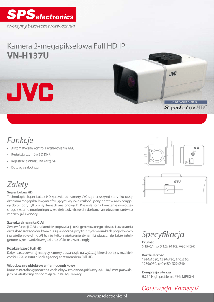 tworzymy bezpieczne rozwiązania Kamera 2-megapikselowa Full HD IP VN-H137U HD NETWORK CAMERA Funkcje • Automatyczna kontrola wzmocnienia AGC • Redukcja szumów 3D DNR • Rejestracja obrazu na kartę SD • Detekcja sabotażu Zalety Super LoLux HD Technologia Super LoLux HD sprawia, że kamery JVC są pierwszymi na rynku urządzeniami megapikselowymi oferującymi wysoką czułość i jasny obraz w nocy osiągany do tej pory tylko w systemach analogowych. Pozwala to na tworzenie nowoczesnego systemu monitoringu wysokiej rozdzielczości z doskonałym obrazem zarówno w dzień, jak i w nocy. Szeroka dynamika CLVI Zestaw funkcji CLVI znakomicie poprawia jakość generowanego obrazu i uwydatnia dużą ilość szczegółów, które nie są widoczne przy trudnych warunkach pogodowych i oświetleniowych. CLVI to nie tylko zwiększenie dynamiki obrazu, ale także inteligentne wyostrzanie krawędzi oraz efekt usuwania mgły. Rozdzielczość Full HD Dzięki zastosowanej matrycy kamery dostarczają najwyższej jakości obraz w rozdzielczości 1920 x 1080 pikseli zgodnej ze standardem Full HD. Wbudowany obiektyw zmiennoogniskowy Kamera została wyposażona w obiektyw zmiennoogniskowy 2,8 - 10,5 mm pozwalający na elastyczny dobór miejsca instalacji kamery. Specyfikacja Czułość 0,15/0,1 lux (F1.2; 50 IRE; AGC HIGH) Rozdzielczość 1920x1080, 1280x720, 640x360, 1280x960, 640x480, 320x240 Kompresja obrazu H.264 High profile, mJPEG, MPEG-4 Obserwacja | Kamery IP www.spselectronics.pl Szczegółowe dane techniczne kamery VN-H137U PARAMETRY KAMERY Przetwornik Efektywna ilość pikseli Czułość 1/3” Super LoLux CMOS 1944 x 1092 0,15/0,1 lux (F1.2; 50 IRE; AGC HIGH) Stosunek sygnał/szum > 50 dB Wbudowany obiektyw 2,8 - 10,5 mm Funkcja kompensacji oświetlenia tła (BLC) Bilans bieli Tak, 4 predefiniowane strefy Tak, automatyczny: wewnętrzny, zewnętrzny, tryb traffic i tryb oszczędzania ilości danych Szeroka dynamika Tak, tryb CLVI Usuwanie mgły Tak, tryb CLVI Funkcja AGC Elektroniczna migawka Korekcja gamma Funkcja dzień/noc Cyfrowa redukcja szumów (DNR) Automatyczna, 2 poziomy, możliwość wyłączenia Ręczna lub automatyczna od 1/30 s do 1/10 000 s, wydłużona migawka x60 Tak Elektroniczna 3D DNR Nazwa kamery Tak, do 40 znaków Detekcja ruchu Tak, 11 poziomów czułości, 15 x 9 pól detekcji Detekcja sabotażu Tak, 11 poziomów czułości Strefy prywatności Tak, 60 x 34 pola PARAMETRY SIECIOWE Kompresja obrazu H.264 High profile, mJPEG, MPEG-4 Rozdzielczość 1920 x 1080, 1280 x 720, 640 x 360, 1280 x 960, 640 x 480, 320 x 240 Jakość obrazu Dla mJPEG: ASF lub VSF, 7 stopni kompresji Dla MPEG4: CBR lub VBR, strumień od 64 do 3072 kbps Dla H.264: CBR lub VBR, strumień od 64 do 8192 kbps Ilość klatek Maksymalna ilość strumieni Obsługa FTP Obsługiwane protokoły Maksymalna ilość użytkowników Rejestracja na kartę SD Dla jednego strumienia max 30 fps; dla dwóch i więcej jednoczesnych strumieni max 15 fps 3 Tak, wygrywanie cykliczne, zdarzeniowe, nadpisywanie lub lista TCP/IP, UDP/IP, FTP, ICMP, ARP, DHCP, SNTP, HTTP, DSCP, SMTP, RTP, RTSP, IGMP, IPv6, HTTPS, SNMP, AMX Device Discovery 20 przy połączeniu unicast, bez ograniczeń przy połączeniu multicast Tak WEJŚCIA / WYJŚCIA Wyjście analogowe Tak Wejście/wyjście audio - Wejścia/wyjścia alarmowe - POZOSTAŁE Temperatura pracy podczas rozruchu 0 do +50°C Temperatura pracy ciągłej 0 do +50°C Obsługa Onvif/PSIA Tak Zasilanie PoE Pobór mocy 6W Wymiary (szer. x wys. x dł.) Waga tworzymy bezpieczne rozwiązania 55 x 61 x 170 390 g Centrala - ul. Wał Miedzeszyński 630, 03-994 Warszawa; tel. 022 518 31 50, fax 022 518 31 70, e-mail: [email protected] BH Gdańsk - ul. Drożyny 6, 80-302 Gdańsk; tel. 058 624 83 04, fax 058 668 59 20, e-mail: [email protected] BH Katowice - ul. Kościuszki 227, 40-600 Katowice; tel. 032 255 64 27, fax 032 255 64 52, e-mail: [email protected] BH Poznań - ul. Polska 60, 60-595 Poznań; tel. 061 852 19 02, fax 061 825 09 03, e-mail: [email protected] BH Toruń - ul. Grudziądzka 176, 87-100 Torun; tel. 056 653 99 43, fax 056 653 90 81, e-mail: [email protected] BH Wrocław - pl. Gen. Wróblewskiego 3a, 50-413 Wrocław; tel. 071 348 44 64, fax 071 348 36 35, e-mail: [email protected]