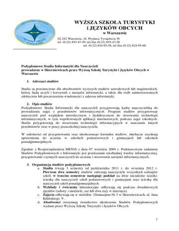 WYŻSZA SZKOŁA TURYSTYKI i JĘZYKÓW OBCYCH w Warszawie 02-242 Warszawa, Al. Prymasa Tysiąclecia 38 tel. (0-22) 855-47-59, tel./fax (0-22) 855-47-58 tel. (0-22) 624-95-58, tel./fax (0-22) 624-95-60 Podyplomowe Studia Informatyki dla Nauczycieli prowadzone w Skierniewicach przez Wyższą Szkołę Turystyki i Języków Obcych w Warszawie 1. Adresaci studiów Studia są przeznaczone dla absolwentów wyższych studiów zawodowych lub magisterskich, którzy będą uczyli i korzystali z narzędzi informatyki, a także dla osób zainteresowanych zdobyciem lub poszerzeniem wiadomości z zakresu informatyki. 2. Opis studiów Podyplomowe Studia Informatyki dla nauczycieli przygotowują kadrę nauczycielską do prowadzenia zajęć z przedmiotów informatycznych. Program studiów przygotowuje nauczycieli pod względem metodycznym i dydaktycznym do stosowania technologii informatycznych, w tym współczesnych aplikacji internetowych, podczas zajęć szkolnych. Studia przygotowują do stosowania technologii informacyjnych w nauczaniu innych przedmiotów oraz w pracy pozaszkolnej nauczyciela. W zależności od przygotowania oraz ukończonego kierunku studiów, słuchacze uzyskują uprawnienia do uczenia w szkołach podstawowych i gimnazjach lub szkołach ponadgimnazjalnych. Zgodnie z Rozporządzeniem MENiS z dnia 07 września 2004 r. Podstawowym zadaniem Studiów Podyplomowych z Informatyki jest przekazanie niezbędnej wiedzy informatycznej, przygotowanie czynnych nauczycieli do uczenia i stosowania narzędzi informatycznych. 3. Organizacja studiów podyplomowych a. Studia trwają 3 semestry od października 2011 r. do września 2012 r. Pierwsze dwa semestry studiów zaliczają nauczyciele wszystkich rodzajów szkół, w trzecim semestrze następuje podział na dwie niezależne ścieżki: ścieżkę dla nauczycieli szkół podstawowych i gimnazjum oraz ścieżkę dla nauczycieli szkół ponadgimnazjalnych. b. Wykłady i ćwiczenia laboratoryjne odbywają się podczas dwudniowych zjazdów (soboty i niedziele, raz lub dwa razy w miesiącu). c. Zajęcia odbywają się w siedzibie Gimnazjum Nr 3 w Skierniewicach, ul. Jana Kilińskiego 9 . d. Absolwenci otrzymują świadectwo ukończenia Studiów Podyplomowych wydane przez Wyższą Szkołę Turystyki i Języków Obcych. 1 e. Warunkiem dopuszczenia do obrony pracy dyplomowej jest zaliczenie wszystkich przedmiotów objętych programem studiów (dla obliczenia średniej oceny). Każdy przedmiot kończy się zaliczeniem lub egzaminem. Słuchacz Studium jest zobowiązany do przygotowania pracy dyplomowej. Nadzór i opiekę merytoryczną nad pracą sprawuje promotor, którym jest osoba prowadząca zajęcia na Studium. Po pozytywnym zaopiniowaniu pracy przez promotora słuchacz przystępuje do egzaminu dyplomowego. Egzamin dyplomowy zdaje się przed trzyosobową Komisją wyznaczoną przez Kierownika Studium, w skład której wchodzą Przewodniczący, Promotor i Recenzent. Końcowa ocena ze studiów jest obliczana na podstawie ocen z egzaminów, oceny pracy dyplomowej oraz oceny egzaminu dyplomowego. f. Wykładowcy: zajęcia prowadzone są przez wykładowców oraz specjalistów i praktyków technologii informatycznych. g. Studia zostaną uruchomione dla grupy minimum 20 osób. h. Planowany termin rozpoczęcia zajęć październik 2011 r. i. Uzyskiwane kwalifikacje Studia podyplomowe nadają kwalifikacje do zajmowania stanowiska nauczyciela informatyki, we wszystkich typach szkół (zgodnie z Rozporządzeniem MEN z dnia 12.03.2009 r. ,Dz.U. nr 50 , poz. 400 w sprawie szczegółowych kwalifikacji wymaganych od nauczycieli). j. Kontakt • Wyższa Szkoła Turystyki i Języków Obcych • Adres: Al. Prymasa Tysiąclecia 38 A 01-242 Warszawa • Tel.: 22 624 95 60 • Fax: 22 624 95 60 • Email: [email protected] Kierownik Organizacyjny Studiów - Dorota Gulbas Email [email protected] k. Materiały do pobrania: • Podanie o przyjęcie na studia • Kwestionariusz osobowy kandydata 4. Koszty studiów a. Opłata jednorazowa za 3 semestry 3.900 PLN b. Oplata w 3 ratach 1300 PLN za semestr c. Wpisowe: 200,0 PLN d. Opłata za Studia Podyplomowe obejmuje: i. koszty prowadzenia zajęć dydaktycznych, ii. przeprowadzenie zaliczeń z przedmiotów objętych programem studiów oraz egzaminu dyplomowego w tym opinie promotora i recenzenta, iii. obsługę administracyjną (indeks, karty zaliczeniowe, legitymacja, prowadzenie dokumentacji słuchacza, zaświadczenia, korespondencja, itp.) 2 5. Program studiów obejmuje wykłady i laboratoria z następujących przedmiotów Zajęcia obejmują następujące przedmioty - łącznie 360 godzin zajęć, w tym 120 godzin wykładów (W) i 240 godzin laboratoriów (L). Zajęcia na studiach odbywają się w blokach sobota-niedziela, od godziny 9.00 do 17.30 Przedmiot Semestr I Semestr II Semestr III Rygor W L W L W L Podstawy informatyki 5 5 - - - - Zal. Wybrane systemy użytkowe i stosowanie technologii informacyjnych - 15 - - - - Zal Wprowadzenie do sieci komputerowych i architektury Internetu 10 30 - - - - Egz. Elementy programowania i tworzenia aplikacji 10 20 - - - - Egz. Podstawy algorytmiki 5 20 - - - - Zal. Bazy danych 5 10 - - - - Zal. Problemy etyczno-prawne, społeczne i zawodowe informatyki 5 - - - - - Zal. Projektowanie statycznych i dynamicznych aplikacji internetowych 10 40 Egz. Wprowadzenie do grafiki komputerowej w Internecie 10 30 Egz. 20 Zal. Język angielski specjalistyczny /dla informatykow/ Seminarium dyplomowe 10 30 20 Metodyka nauczania informatyki 20 Narzędzia i usługi Internetowe Razem 40 100 30 110 50 Zal. 10 Egz. 20 Zal. 30 Harmonogram zajęć Studiów Podyplomowych otrzymają słuchacze na pierwszym zjeździe. Harmonogram będzie także dostępny na stronie internetowej WSTiJO. 6. Zasady rekrutacji, wymagane dokumenty Od kandydatów wymagane są następujące dokumenty: • podanie (druk do pobrania ze strony internetowej …) • kwestionariusz osobowy (druk do pobrania ze strony internetowej …), • odpis d