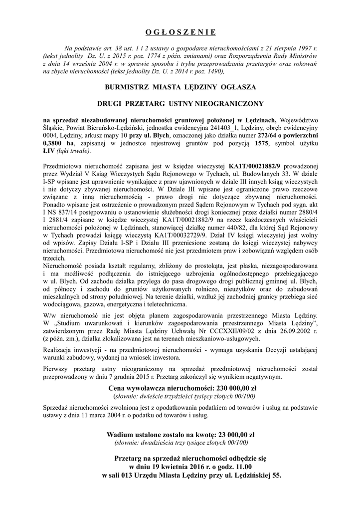 OGŁOSZENIE Na podstawie art. 38 ust. 1 i 2 ustawy o gospodarce nieruchomościami z 21 sierpnia 1997 r. (tekst jednolity Dz. U. z 2015 r. poz. 1774 z późn. zmianami) oraz Rozporządzenia Rady Ministrów z dnia 14 września 2004 r. w sprawie sposobu i trybu przeprowadzania przetargów oraz rokowań na zbycie nieruchomości (tekst jednolity Dz. U. z 2014 r. poz. 1490), BURMISTRZ MIASTA LĘDZINY OGŁASZA DRUGI PRZETARG USTNY NIEOGRANICZONY na sprzedaż niezabudowanej nieruchomości gruntowej położonej w Lędzinach, Województwo Śląskie, Powiat Bieruńsko-Lędziński, jednostka ewidencyjna 241403_1, Lędziny, obręb ewidencyjny 0004, Lędziny, arkusz mapy 10 przy ul. Blych, oznaczonej jako działka numer 272/64 o powierzchni 0,3800 ha, zapisanej w jednostce rejestrowej gruntów pod pozycją 1575, symbol użytku ŁIV (łąki trwałe). Przedmiotowa nieruchomość zapisana jest w księdze wieczystej KA1T/00021882/9 prowadzonej przez Wydział V Ksiąg Wieczystych Sądu Rejonowego w Tychach, ul. Budowlanych 33. W dziale I-SP wpisane jest uprawnienie wynikające z praw ujawnionych w dziale III innych ksiąg wieczystych i nie dotyczy zbywanej nieruchomości. W Dziale III wpisane jest ograniczone prawo rzeczowe związane z inną nieruchomością - prawo drogi nie dotyczące zbywanej nieruchomości. Ponadto wpisane jest ostrzeżenie o prowadzonym przed Sądem Rejonowym w Tychach pod sygn. akt I NS 837/14 postępowaniu o ustanowienie służebności drogi koniecznej przez działki numer 2880/4 I 2881/4 zapisane w księdze wieczystej KA1T/00021882/9 na rzecz każdoczesnych właścicieli nieruchomości położonej w Lędzinach, stanowiącej działkę numer 440/82, dla której Sąd Rejonowy w Tychach prowadzi księgę wieczystą KA1T/00032729/9. Dział IV księgi wieczystej jest wolny od wpisów. Zapisy Działu I-SP i Działu III przeniesione zostaną do księgi wieczystej nabywcy nieruchomości. Przedmiotowa nieruchomość nie jest przedmiotem praw i zobowiązań względem osób trzecich. Nieruchomość posiada kształt regularny, zbliżony do prostokąta, jest płaska, niezagospodarowana i ma możliwość podłączenia do istniejącego uzbrojenia ogólnodostępnego przebiegającego w ul. Blych. Od zachodu działka przylega do pasa drogowego drogi publicznej gminnej ul. Blych, od północy i zachodu do gruntów użytkowanych rolniczo, nieużytków oraz do zabudowań mieszkalnych od strony południowej. Na terenie działki, wzdłuż jej zachodniej granicy przebiega sieć wodociągowa, gazowa, energetyczna i teletechniczna. W/w nieruchomość nie jest objęta planem zagospodarowania przestrzennego Miasta Lędziny. W „Studium uwarunkowań i kierunków zagospodarowania przestrzennego Miasta Lędziny”, zatwierdzonym przez Radę Miasta Lędziny Uchwałą Nr CCCXXII/09/02 z dnia 26.09.2002 r. (z późn. zm.), działka zlokalizowana jest na terenach mieszkaniowo-usługowych. Realizacja inwestycji - na przedmiotowej nieruchomości - wymaga uzyskania Decyzji ustalającej warunki zabudowy, wydanej na wniosek inwestora. Pierwszy przetarg ustny nieograniczony na sprzedaż przedmiotowej nieruchomości został przeprowadzony w dniu 7 grudnia 2015 r. Przetarg zakończył się wynikiem negatywnym. Cena wywoławcza nieruchomości: 230 000,00 zł (słownie: dwieście trzydzieści tysięcy złotych 00/100) Sprzedaż nieruchomości zwolniona jest z opodatkowania podatkiem od towarów i usług na podstawie ustawy z dnia 11 marca 2004 r. o podatku od towarów i usług. Wadium ustalone zostało na kwotę: 23 000,00 zł (słownie: dwadzieścia trzy tysiące złotych 00/100) Przetarg na sprzedaż nieruchomości odbędzie się w dniu 19 kwietnia 2016 r. o godz. 11.00 w sali 013 Urzędu Miasta Lędziny przy ul. Lędzińskiej 55. Ogólne warunki przetargu: Warunkiem przystąpienia do przetargu jest wniesienie wadium - w pieniądzu w terminie do dnia 13 kwietnia 2016 r. na rachunek bankowy Urzędu Miasta Lędziny: ING Bank Śląski SA Katowice 04 1050 1214 1000 0024 1111 9239 (konto depozytowe) z dopiskiem w tytule wpłaty: wadium na działkę numer 272/64 o powierzchni 3800 m 2 położoną w Lędzinach przy ul. Blych. Za potwierdzenie wpłaty wadium przyjmuje się dzień uznania rachunku bankowego Urzędu Miasta Lędziny. Wadium zwraca się niezwłocznie po odwołaniu albo zamknięciu przetargu, jednak nie później niż przed upływem 3 dni od dnia odwołania, zamknięcia, unieważnienia lub zakończenia przetargu wynikiem negatywnym. Wadium wniesione w pieniądzu przez uczestnika przetargu, który przetarg wygrał, zalicza się na poczet ceny nabycia nieruchomości. Wadium nie podlega zwrotowi, jeżeli osoba ustalona jako nabywca nieruchomości nie przystąpi bez usprawiedliwienia do zawarcia umowy w miejscu i terminie podanych w zawiadomieniu o zawarciu umowy sprzedaży. Kwota wadium zostanie zaliczona w poczet ceny w dniu zapłaty pełnej ceny należności. Cena wywoławcza nie zawiera podatku oraz innych opłat. Sprzedaż nieruchomości zwolniona jest z podatku od towarów i usług VAT na podstawie art. 43 ust. 1 pkt 9 ustawy z dnia 11 marca 2004 r. o podatku od towarów i usług. Przetarg jest ważny bez względu na liczbę uczestników przetargu, jeżeli przynajmniej jeden uczestnik zaoferował co najmniej jedno postąpienie powyżej ceny wywoławczej. O wysokości postąpienia decydują uczestnicy przetargu, z tym że postąpienie nie może wynosić mniej niż 1% ceny wywoławczej nieruchomości, z zaokrągleniem w górę do pełnych dziesiątek złotych. Cała cena sprzedaży zbywanej nieruchomości podlega zapłacie nie później niż do dnia zawarcia umowy przenoszącej własność. Za potwierdzenie wpłaty przyjmuje się datę uznania rachunku bankowego UM Lędziny. Osoba, ustalona jako nabywca nieruchomości w wyniku przeprowadzonego przetargu, zobowiązana jest do poniesienia wszelkich kosztów związanych z nabyciem nieruchomości. Nabywca zobowiązany jest do wykonania na własny koszt niezbędnego, dla zam