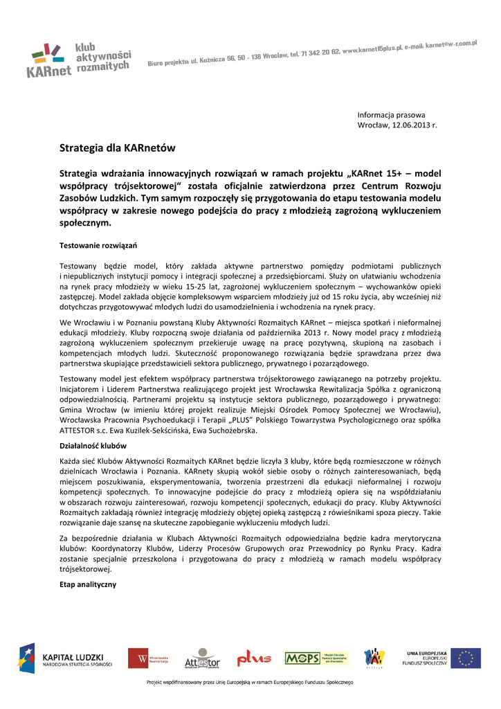 Informacja prasowa Wrocław, 12.06.2013 r. Strategia dla KARnetów Strategia wdrażania innowacyjnych rozwiązań w ramach projektu „KARnet 15+ – model współpracy trójsektorowej“ została oficjalnie zatwierdzona przez Centrum Rozwoju Zasobów Ludzkich. Tym samym rozpoczęły się przygotowania do etapu testowania modelu współpracy w zakresie nowego podejścia do pracy z młodzieżą zagrożoną wykluczeniem społecznym. Testowanie rozwiązań Testowany będzie model, który zakłada aktywne partnerstwo pomiędzy podmiotami publicznych i niepublicznych instytucji pomocy i integracji społecznej a przedsiębiorcami. Służy on ułatwianiu wchodzenia na rynek pracy młodzieży w wieku 15-25 lat, zagrożonej wykluczeniem społecznym – wychowanków opieki zastępczej. Model zakłada objęcie kompleksowym wsparciem młodzieży już od 15 roku życia, aby wcześniej niż dotychczas przygotowywać młodych ludzi do usamodzielnienia i wchodzenia na rynek pracy. We Wrocławiu i w Poznaniu powstaną Kluby Aktywności Rozmaitych KARnet – miejsca spotkań i nieformalnej edukacji młodzieży. Kluby rozpoczną swoje działania od października 2013 r. Nowy model pracy z młodzieżą zagrożoną wykluczeniem społecznym przekieruje uwagę na pracę pozytywną, skupioną na zasobach i kompetencjach młodych ludzi. Skuteczność proponowanego rozwiązania będzie sprawdzana przez dwa partnerstwa skupiające przedstawicieli sektora publicznego, prywatnego i pozarządowego. Testowany model jest efektem współpracy partnerstwa trójsektorowego zawiązanego na potrzeby projektu. Inicjatorem i Liderem Partnerstwa realizującego projekt jest Wrocławska Rewitalizacja Spółka z ograniczoną odpowiedzialnością. Partnerami projektu są instytucje sektora publicznego, pozarządowego i prywatnego: Gmina Wrocław (w imieniu której projekt realizuje Miejski Ośrodek Pomocy Społecznej we Wrocławiu), Wrocławska Pracownia Psychoedukacji i Terapii „PLUS” Polskiego Towarzystwa Psychologicznego oraz spółka ATTESTOR s.c. Ewa Kuzilek-Sekścińska, Ewa Suchożebrska. Działalność klubów Każda sieć Klubów Aktywności Rozmaitych KARnet będzie liczyła 3 kluby, które będą rozmieszczone w różnych dzielnicach Wrocławia i Poznania. KARnety skupią wokół siebie osoby o różnych zainteresowaniach, będą miejscem poszukiwania, eksperymentowania, tworzenia przestrzeni dla edukacji nieformalnej i rozwoju kompetencji społecznych. To innowacyjne podejście do pracy z młodzieżą opiera się na współdziałaniu w obszarach rozwoju zainteresowań, rozwoju kompetencji społecznych, edukacji do pracy. Kluby Aktywności Rozmaitych zakładają również integrację młodzieży objętej opieką zastępczą z rówieśnikami spoza pieczy. Takie rozwiązanie daje szansę na skuteczne zapobieganie wykluczeniu młodych ludzi. Za bezpośrednie działania w Klubach Aktywności Rozmaitych odpowiedzialna będzie kadra merytoryczna klubów: Koordynatorzy Klubów, Liderzy Procesów Grupowych oraz Przewodnicy po Rynku Pracy. Kadra zostanie specjalnie przeszkolona i przygotowana do pracy z młodzieżą w ramach modelu współpracy trójsektorowej. Etap analityczny Zasadność wszystkich działań etapu testowania została dokładnie sprawdzona w trakcie etapu diagnostyczno-analitycznego projektu, w ramach którego zdiagnozowane zostały kluczowe problemy młodych ludzi. Dotychczasowa pomoc udzielana młodzieży zagrożonej wykluczeniem społecznym, objętej opieką zastępczą, jest rozczłonkowana wśród wielu instytucji i ma charakter wybiórczy. Wychowankowie mają problemy z identyfikacją swoich zainteresowań, a nawet jeśli je identyfikują, nie rozwijają ich. Zauważalny jest również deficyt kompetencji społecznych i kulturowych. W konsekwencji młodzi ludzie dokonują przypadkowych, nieadekwatnych wyborów poziomu i kierunków kształcenia, co z kolei wpływa na ich niską pozycję na rynku pracy. Dzięki uczestnictwu w Klubach Aktywności Rozmaitych młodzież nabędzie umiejętności, które zwiększą jej szanse na rynku pracy, a tym samym umożliwią każdemu uczestnikowi wchodzenie w dorosłość bez kompleksów i z adekwatnym obrazem własnej osoby. Więcej informacji na temat projektu „KARnet 15+ – model współpracy trójsektorowej“ jest dostępna na stronie www.karnet15plus.pl. Projekt jest współfinansowany ze środków Unii Europejskiej w ramach Europejskiego Funduszu Społecznego. Kontakt: Projekt „KARnet15+ − model współpracy trójsektorowej” www.karnet15plus.pl Tel.: +48 71 342 20 62 Fax.: +48 71 341 04 50 E-mail: [email protected] Wrocławska Rewitalizacja Spółka z ograniczoną odpowiedzialnością ul. Kuźnicza 56 50-138 Wrocław