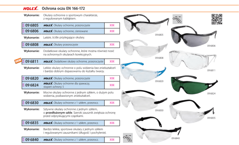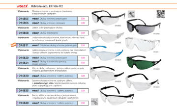 Ochrona oczu EN 166-172 02A 02A Wykonanie: 09 6805 09 6806 02A Wykonanie: 09 6808 Okulary ochronne o sportowym charakterze, z regulowanym kabłąkiem. Okulary ochronne, przezroczyste XXX Okulary ochronne, cieniowane XXX 09 6805 Lekkie, ściśle przylegające okulary. Okulary przezroczyste XXX Dodatkowe okulary ochronne, które można również nosić na ochronnych okularach korekcyjnych. 09 6811 Dodatkowe okulary ochronne, przezroczyste 02A Wykonanie: 09 6808 XXX 02A Lekkie okulary ochronne o polu widzenia bez zniekształceń i bardzo dobrym dopasowaniu do kształtu twarzy. 09 6820 Okulary ochronne, przezroczyste XXX 02A Wykonanie: 09 6824 Okulary ochronne dla spawaczy, stopień ochrony 5 XXX 02A Wykonanie: 09 6830 02A Wykonanie: 09 6835 02A Wykonanie: 09 6840 09 6806 09 6811 09 6820 Mocne okulary ochronne z jednym szkłem, o dużym polu widzenia, pozbawionym zniekształceń. Okulary ochronne z 1 szkłem, przezrocz. XXX Sztywne okulary ochronne z jednym szkłem, o przedłużonym szkle. Szeroki zausznik zwiększa ochronę przed odpryskującymi cząstkami. Okulary ochronne z 1 szkłem, przezrocz. 09 6824 09 6830 09 6835 XXX Bardzo lekkie, sportowe okulary z jednym szkłem i regulowanymi zausznikami (długość i pochylenie). Okulary ochronne z 1 szkłem, przezrocz. XXX 09 6840