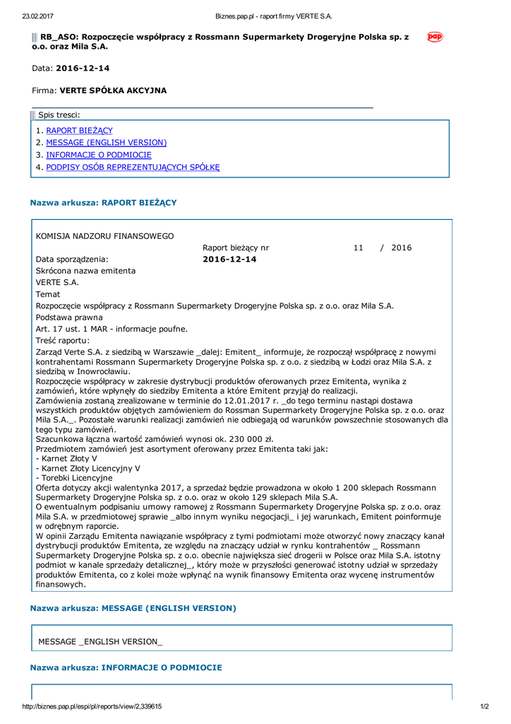23.02.2017 Biznes.pap.pl raport firmy VERTE S.A. RB_ASO: Rozpoczęcie współpracy z Rossmann Supermarkety Drogeryjne Polska sp. z o.o. oraz Mila S.A. Data: 20161214 Firma: VERTE SPÓŁKA AKCYJNA Spis tresci: 1. RAPORT BIEŻĄCY 2. MESSAGE (ENGLISH VERSION) 3. INFORMACJE O PODMIOCIE 4. PODPISY OSÓB REPREZENTUJĄCYCH SPÓŁKĘ Nazwa arkusza: RAPORT BIEŻĄCY KOMISJA NADZORU FINANSOWEGO Raport bieżący nr 20161214 11 / 2016 Data sporządzenia: Skrócona nazwa emitenta VERTE S.A. Temat Rozpoczęcie współpracy z Rossmann Supermarkety Drogeryjne Polska sp. z o.o. oraz Mila S.A. Podstawa prawna Art. 17 ust. 1 MAR informacje poufne. Treść raportu: Zarząd Verte S.A. z siedzibą w Warszawie _dalej: Emitent_ informuje, że rozpoczął współpracę z nowymi kontrahentami Rossmann Supermarkety Drogeryjne Polska sp. z o.o. z siedzibą w Łodzi oraz Mila S.A. z siedzibą w Inowrocławiu. Rozpoczęcie współpracy w zakresie dystrybucji produktów oferowanych przez Emitenta, wynika z zamówień, które wpłynęły do siedziby Emitenta a które Emitent przyjął do realizacji. Zamówienia zostaną zrealizowane w terminie do 12.01.2017 r. _do tego terminu nastąpi dostawa wszystkich produktów objętych zamówieniem do Rossman Supermarkety Drogeryjne Polska sp. z o.o. oraz Mila S.A._. Pozostałe warunki realizacji zamówień nie odbiegają od warunków powszechnie stosowanych dla tego typu zamówień. Szacunkowa łączna wartość zamówień wynosi ok. 230 000 zł. Przedmiotem zamówień jest asortyment oferowany przez Emitenta taki jak: Karnet Złoty V Karnet Złoty Licencyjny V Torebki Licencyjne Oferta dotyczy akcji walentynka 2017, a sprzedaż będzie prowadzona w około 1 200 sklepach Rossmann Supermarkety Drogeryjne Polska sp. z o.o. oraz w około 129 sklepach Mila S.A. O ewentualnym podpisaniu umowy ramowej z Rossmann Supermarkety Drogeryjne Polska sp. z o.o. oraz Mila S.A. w przedmiotowej sprawie _albo innym wyniku negocjacji_ i jej warunkach, Emitent poinformuje w odrębnym raporcie. W opinii Zarządu Emitenta nawiązanie współpracy z tymi podmiotami może otworzyć nowy znaczący kanał dystrybucji produktów Emitenta, ze względu na znaczący udział w rynku kontrahentów _ Rossmann Supermarkety Drogeryjne Polska sp. z o.o. obecnie największa sieć drogerii w Polsce oraz Mila S.A. istotny podmiot w kanale sprzedaży detalicznej_, który może w przyszłości generować istotny udział w sprzedaży produktów Emitenta, co z kolei może wpłynąć na wynik finansowy Emitenta oraz wycenę instrumentów finansowych. Nazwa arkusza: MESSAGE (ENGLISH VERSION) MESSAGE _ENGLISH VERSION_ Nazwa arkusza: INFORMACJE O PODMIOCIE http://biznes.pap.pl/espi/pl/reports/view/2,339615 1/2 23.02.2017 Biznes.pap.pl raport firmy VERTE S.A. _pełna nazwa emitenta_ _skrócona nazwa emitenta_ _kod pocztowy_ _ulica_ _sektor wg. klasyfikacji GPW w Wwie_ _miejscowość_ _numer_ _telefon_ _email_ _fax_ _www_ _NIP_ _REGON_ Nazwa arkusza: PODPISY OSÓB REPREZENTUJĄCYCH SPÓŁKĘ PODPISY OSÓB REPREZENTUJĄCYCH SPÓŁKĘ Data 20161214 Imię i Nazwisko Rafał Fudali Stanowisko/Funkcja Prezes Zarządu Podpis Identyfikator raportu g3rnkvrut1 Nazwa raportu RB_ASO Symbol raportu RB_ASO Nazwa emitenta VERTE SPÓŁKA AKCYJNA Symbol Emitenta VERTE S.A. Tytul Rozpoczęcie współpracy z Rossmann Supermarkety Drogeryjne Polska sp. z o.o. oraz Mila S.A. Sektor Usługi inne (uin) Kod Miasto Warszawa Ulica Prosta Nr 32 Tel. +48 (22) 12 34 234 Fax +48 (22) 25 00 058 email NIP 1182061975 REGON 142873100 Data sporzadzenia 20161214 Rok biezacy 2016 Numer 11 adres www Serwis Ekonomiczny Polskiej Agencji Prasowej SA http://biznes.pap.pl/espi/pl/reports/view/2,339615 2017 Copyright PAP SA Wszelkie prawa zastrzezone. 2/2