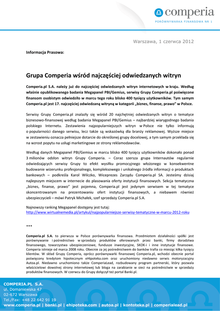 Warszawa, 1 czerwca 2012 Informacja Prasowa: Grupa Comperia wśród najczęściej odwiedzanych witryn Comperia.pl S.A. należy już do najczęściej odwiedzanych witryn internetowych w kraju. Według właśnie opublikowanego badania Megapanel PBI/Gemius, serwisy Grupy Comperia.pl poświęcone finansom osobistym odwiedziło w marcu tego roku blisko 400 tysięcy użytkowników. Tym samym Comperia.pl jest 17. najczęściej odwiedzaną witryną w kategorii „biznes, finanse, prawo” w Polsce. Serwisy Grupy Comperia.pl znalazły się wśród 20 najchętniej odwiedzanych witryn o tematyce biznesowo-finansowej według badania Megapanel PBI/Gemius – najbardziej wiarygodnego badania polskiego Internetu. Zestawienia najpopularniejszych witryn w Polsce nie tylko informują o popularności danego serwisu, lecz także są wskazówką dla branży reklamowej. Wyższe miejsce w zestawieniu oznacza pełniejsze dotarcie do określonej grupy docelowej, a tym samym przekłada się na wzrost popytu na usługi marketingowe ze strony reklamodawców. Według danych Megapanel PBI/Gemius w marcu blisko 400 tysięcy użytkowników dokonało ponad 3 milionów odsłon witryn Grupy Comperia. – Coraz szersza grupa Internautów regularnie odwiedzających serwisy Grupy to efekt wysiłku promocyjnego włożonego w konsekwentne budowanie wizerunku profesjonalnego, kompleksowego i unikalnego źródła informacji o produktach bankowych – podkreśla Karol Wilczko, Wiceprezes Zarządu Comperia.pl SA. Jesteśmy dzisiaj najlepszym miejscem w internecie do plasowania oferty instytucji finansowych. Sekcja tematyczna „biznes, finanse, prawo” jest pojemna, Comperia.pl jest jedynym serwisem w tej tematyce skoncentrowanym na prezentowaniu ofert instytucji finansowych, a niebawem również ubezpieczycieli – mówi Patryk Michałek, szef sprzedaży Comperia.pl S.A. Najnowszy ranking Megapanel dostępny jest tutaj: http://www.wirtualnemedia.pl/artykul/najpopularniejsze-serwisy-tematyczne-w-marcu-2012-roku *** Comperia.pl S.A. to pierwsza w Polsce porównywarka finansowa. Przedmiotem działalności spółki jest porównywanie i pośrednictwo w sprzedaży produktów oferowanych przez banki, firmy doradztwa finansowego, towarzystwa ubezpieczeniowe, fundusze inwestycyjne, SKOK-i i inne instytucje finansowe. Comperia istnieje od marca 2008 roku. Obecnie za jej pośrednictwem do banków trafia co miesiąc kilka tysięcy klientów. W skład Grupy Comperia, oprócz porównywarki finansowej Comperia.pl, wchodzi obecnie portal poświęcony kredytom hipotecznym eHipoteka.com oraz uruchomiony niedawno serwis motoryzacyjny Autoa.pl. Niedawno uruchomiono także ComperiaLead, rozbudowany program partnerski, który pozwala właścicielowi dowolnej strony internetowej lub bloga na zarabianie w sieci na pośrednictwie w sprzedaży produktów finansowych. W czerwcu do Grupy dołączył też portal Banki.pl.