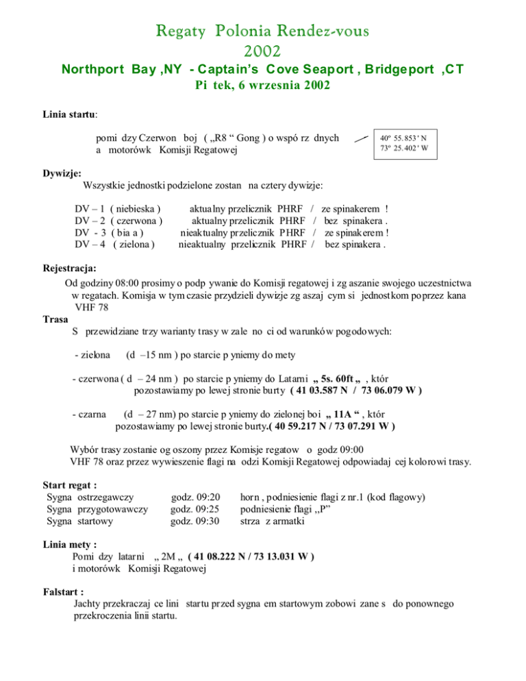 Regaty Polonia Rendez-vous 2002 Northport Bay ,NY - Captain’s Cove Seaport , Bridgeport ,C T Pi•tek, 6 wrzesnia 2002 Linia startu: pomi“dzy Czerwon• boj• ( „R8 “ Gong ) o wspó»rz“dnych a motorówk • Komisji Regatowej 40º 55. 853 ' N 73º 25. 402 ' W Dywizje: Wszystkie jednostki podzielone zostan• na cztery dywizje: DV – 1 DV – 2 DV - 3 DV – 4 ( niebieska ) ( czerwona ) ( bia»a ) ( zielona ) aktualny przelicznik PHRF aktualny przelicznik PHRF nieaktualny przelicznik PHRF nieaktualny przelicznik PHRF / / / / ze spinakerem ! bez spinakera . ze spinakerem ! bez spinakera . Rejestracja: Od godziny 08:00 prosimy o podp »ywanie do Komisji regatowej i zg»aszanie swojego uczestnictwa w regatach. Komisja w tym czasie przydzieli dywizje zg»aszaj•cym si“ jednostkom poprzez kana » VHF 78 Trasa S• przewidziane trzy warianty trasy w zaleónoÑci od warunków pogodowych: - zielona (d» –15 nm ) po starcie p»yniemy do mety - czerwona ( d» – 24 nm ) po starcie p»yniemy do Latarni „ 5s. 60ft „ , któr• pozostawiamy po lewej stronie burty ( 41 03.587 N / 73 06.079 W ) - czarna (d» – 27 nm) po starcie p»yniemy do zielonej boi „ 11A “ , któr• pozostawiamy po lewej stronie burty.( 40 59.217 N / 73 07.291 W ) Wybór trasy zostanie og»oszony przez Komisje regatow• o godz 09:00 VHF 78 oraz przez wywieszenie flagi na »odzi Komisji Regatowej odpowiadaj•cej kolorowi trasy. Start regat : Sygna» ostrzegawczy Sygna» przygotowawczy Sygna» startowy godz. 09:20 godz. 09:25 godz. 09:30 horn , podniesienie flagi z nr.1 (kod flagowy) podniesienie flagi ,,P” strza» z armatki Linia mety : Pomi“dzy latarni• „ 2M „ ( 41 08.222 N / 73 13.031 W ) i motorówk• Komisji Regatowej Falstart : Jachty przekraczaj•ce lini“ startu przed sygna »em startowym zobowi•zane s• do ponownego przekroczenia linii startu. Limit czasowy: Bez ogranicze½. Jachty przekraczaj•ce lini“ mety po godzinie 18:00 powiadamiaj• Komisj“ Regat przez VHF radio na kanale 78. Klasyfikacja O PRESTIò OWE PUCHARY ZAWISZY CZARNEGO WALCZ€ TYLKO !!! DYWIZJE 1. – 2. Standartowe puchary Zawiszy Czarnego dla dywizji 3. – 4. Dywizje - 1. - 2. Bed• klasyfikowane wed»ug czasu skorygowanego z uwzgl“dnieniem wspó»czynnika PHRF Dywizja - 3. - 4. Bed• klasyfikowane wed»ug kolejnoÑci na mecie . Dodatkowo : Puchar „ KOºKA „ niespodzianka ? Puchar dla pierwszego jachtu na mecie od Izydora Rydziaka komandora Polish Yach Association of North America. Puchary Zawiszy Czarnego wr“czy osobiÑcie nasz goу kapitan Waldemar Mieczkowski Armatorzy jachtów z waónym dokumentem okreÑlaj•cym wspó»czynnik PHRF po winni powiadomiƒ o tym Komisj“ Regat pisemnie przed regatami lub poczt• na adres : Rafa » Biernacki 6933 44Ave. Woodside NY 11377. E-mail [email protected] Tel /fax 718 446 8137 917 710 7950 Jachtom nie posiadaj•cym na pismie wspó»czynnika PHRF Komisja Regat w wyjatkowych przypadkach przydzieli jego odpowiednik. Protesty : musz• byƒ: · Sygnalizowane na wodzie natychmiast po sytuacji uzasadniaj•cej protest oraz · Sygnalizowane przy przekraczaniu linii mety · Zg»oszone do Komisji Regat przed godzin• 20:00. Komunikacja radiowa: VHF radio na kanale 78. Boje zwrotne: Jachty okr•óaj•ce boje zwrotne prosimy o zanotowanie czasu , zg»oszenie go na kanale 78 oraz w miar“ moóliwoÑci zanotowanie najbliószej jdenostki przed i za sob•. Komisja Regatowa Polonia Rendez-vous 2002