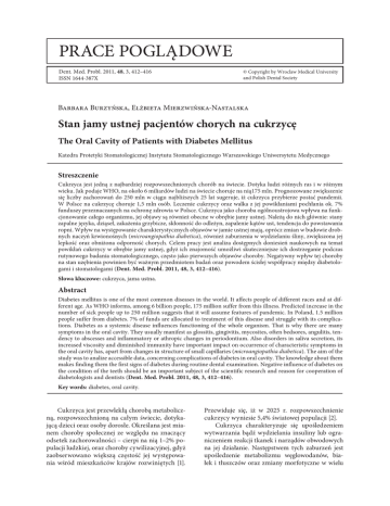 prace poglądowe Dent. Med. Probl. 2011, 48, 3, 412–416 ISSN 1644-387X © Copyright by Wroclaw Medical University and Polish Dental Society Barbara Burzyńska, Elżbieta Mierzwińska-Nastalska Stan jamy ustnej pacjentów chorych na cukrzycę The Oral Cavity of Patients with Diabetes Mellitus Katedra Protetyki Stomatologicznej Instytutu Stomatologicznego Warszawskiego Uniwersytetu Medycznego Streszczenie Cukrzyca jest jedną z najbardziej rozpowszechnionych chorób na świecie. Dotyka ludzi różnych ras i w różnym wieku. Jak podaje WHO, na około 6 miliardów ludzi na świecie choruje na nią175 mln. Prognozowane zwiększenie się liczby zachorowań do 250 mln w ciągu najbliższych 25 lat sugeruje, iż cukrzyca przybierze postać pandemii. W Polsce na cukrzycę choruje 1,5 mln osób. Leczenie cukrzycy oraz walka z jej powikłaniami pochłania ok. 7% funduszy przeznaczanych na ochronę zdrowia w Polsce. Cukrzyca jako choroba ogólnoustrojowa wpływa na funkcjonowanie całego organizmu, jej objawy są również obecne w obrębie jamy ustnej. Należą do nich głównie: stany zapalne języka, dziąseł, zakażenia grzybicze, skłonność do odleżyn, zapalenie kątów ust, tendencja do powstawania ropni. Wpływ na występowanie charakterystycznych objawów w jamie ustnej mają, oprócz zmian w budowie drobnych naczyń krwionośnych (microangiopathia diabetica), również zaburzenia w wydzielaniu śliny, zwiększona jej lepkość oraz obniżona odporność chorych. Celem pracy jest analiza dostępnych doniesień naukowych na temat powikłań cukrzycy w obrębie jamy ustnej, gdyż ich znajomość umożliwi skuteczniejsze ich dostrzeganie podczas rutynowego badania stomatologicznego, często jako pierwszych objawów choroby. Negatywny wpływ tej choroby na stan uzębienia powinien być ważnym przedmiotem badań oraz powodem ścisłej współpracy między diabetologami i stomatologami (Dent. Med. Probl. 2011, 48, 3, 412–416). Słowa kluczowe: cukrzyca, jama ustna. Abstract Diabetes mellitus is one of the most common diseases in the world. It affects people of different races and at different age. As WHO informs, among 6 billion people, 175 million suffer from this illness. Predicted increase in the number of sick people up to 250 million suggests that it will assume features of pandemic. In Poland, 1.5 million people suffer from diabetes. 7% of funds are allocated to treatment of this disease and struggle with its complications. Diabetes as a systemic disease influences functioning of the whole organism. That is why there are many symptoms in the oral cavity. They usually manifest as glossitis, gingivitis, mycosites, often bedsores, angulitis, tendency to abscesses and inflammatory or athropic changes in periodontium. Also disorders in saliva secretion, its increased viscosity and diminished immunity have important impact on occurrence of characteristic symptoms in the oral cavity has, apart from changes in structure of small capillaries (microangiopathia diabetica). The aim of the study was to analize accessible data, concerning complications of diabetes in oral cavity. The knowledge about them makes finding them the first signs of diabetes during routine dental examination. Negative influence of diabetes on the condition of the teeth should be an important subject of the scientific research and reason for cooperation of diabetologists and dentists (Dent. Med. Probl. 2011, 48, 3, 412–416). Key words: diabetes, oral cavity. Cukrzyca jest przewlekłą chorobą metaboliczną, rozpowszechnioną na całym świecie, dotykającą dzieci oraz osoby dorosłe. Określana jest mianem choroby społecznej ze względu na znaczący odsetek zachorowalności – cierpi na nią 1–2% populacji ludzkiej, oraz choroby cywilizacyjnej, gdyż zaobserwowano większą częstość jej występowania wśród mieszkańców krajów rozwiniętych [1]. Przewiduje się, iż w 2025 r. rozpowszechnienie cukrzycy wyniesie 5,4% światowej populacji [2]. Cukrzyca charakteryzuje się upośledzeniem wytwarzania bądź wydzielania insuliny lub ograniczeniem reakcji tkanek i narządów obwodowych na jej działanie. Następstwem tych zaburzeń jest upośledzenie metabolizmu węglowodanów, białek i tłuszczów oraz zmiany morfotyczne w wielu Stan jamy ustnej pacjentów chorych na cukrzycę ważnych dla życia narządach. Cechami rozpoznawczymi cukrzycy są hiperglikemia na czczo i glikozuria lub – przy prawidłowej glikemii na czczo – wartości stężenia glukozy we krwi i moczu, które po podaniu doustnie testowej dawki 75 g glukozy przekraczają stężenie tego cukru u osób zdrowych, a także u osób z zaburzoną tolerancją glukozy. Zgodnie z ustaleniami Komitetu Ekspertów Światowej Organizacji Zdrowia z 1999 r., obowiązuje klasyfikacja tej jednostki chorobowej, która wyróżnia cukrzycę typu 1, w obrębie której występują: cukrzyca autoimmunozależna i cukrzyca idiopatyczna. Pierwsza z nich jest wynikiem autoimmunologicznej destrukcji komórek B wysp trzuski. U chorych stwierdza się także autoprzeciwciała przeciwko insulinie, dekarboksylazie kwasu glutaminowego oraz fosfatazom tyrozynowym. Choroba ma najprawdopodobniej podłoże genetyczne. Najszybsza destrukcja komórek B zachodzi u niemowląt i dzieci. Pierwszym objawem jest kwasica ketonowa lub łagodna hiperglikemia na czczo, która na skutek stresu lub zakażenia może się przerodzić w ostrą hiperglikemię lub kwasicę ketonową. Przyczyna cukrzycy idiopatycznej nie jest znana, duże znaczenie przypisuje się jednak dziedziczeniu. Charakteryzuje się niedoborem insuliny i skłonnością do kwasicy ketonowej, bez stwierdzonego podłoża autoimmunologicznego. Do typowych objawów cukrzycy typu 1 należą: wzmożone pragnienie i wielomocz, skłonność do rozwoju ketozy, zmniejszenie masy ciała, mimo nadmiernego łaknienia i spożywania pokarmów, ogólne osłabienie. Cukrzyca typu 2 – cukrzyca insulinoniezależna – charakteryzuje się raczej w