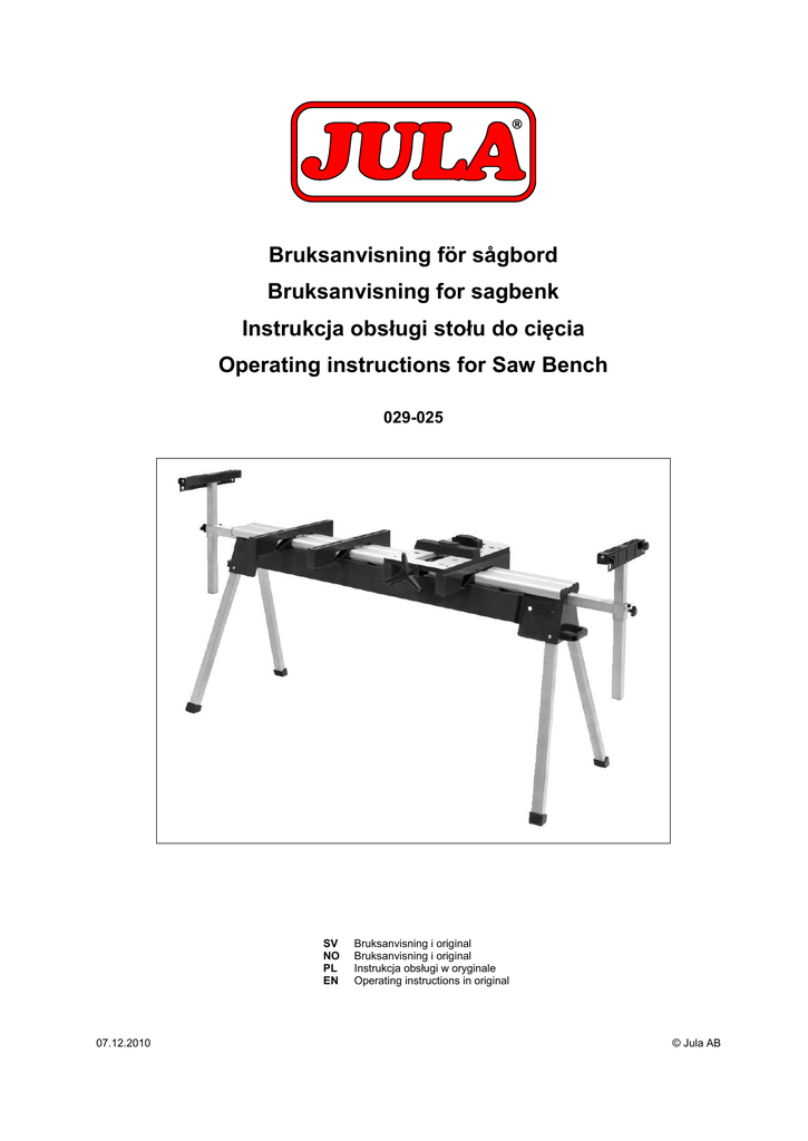 Bruksanvisning för sågbord Bruksanvisning for sagbenk Instrukcja obsługi stołu do cięcia Operating instructions for Saw Bench 029-025 SV NO PL EN 07.12.2010 Bruksanvisning i original Bruksanvisning i original Instrukcja obsługi w oryginale Operating instructions in original © Jula AB SVENSKA 3 BESKRIVNING ............................................................................................................................................. 3 TEKNISKA DATA ......................................................................................................................................... 3 TILLBEHÖR .................................................................................................................................................. 3 MONTERING ................................................................................................................................................ 4 Användning av materialstödskenorna på centralbädden..................................................................... 5 Montering av verktyg på sågbordet ..................................................................................................... 5 Separat användning av verktyg ........................................................................................................... 5 Användning av materialstoppen .......................................................................................................... 5 Skruvstycke.......................................................................................................................................... 6 Kopplingspanel .................................................................................................................................... 6 Förvaringsutrymme .............................................................................................................................. 6 Maskiner som kan monteras på sågbordet ......................................................................................... 7 NORSK 8 BESKRIVELSE ............................................................................................................................................. 8 TEKNISKE DATA ......................................................................................................................................... 8 TILBEHØR .................................................................................................................................................... 8 MONTERING ................................................................................................................................................ 9 Bruk av materialstøtteskinnene på hovedbenken .............................................................................. 10 Montering av verktøy på sagbenken.................................................................................................. 10 Separat bruk av verktøy..................................................................................................................... 10 Bruk av materialstopperen ................................................................................................................. 10 Skrustikke .......................................................................................................................................... 11 Koblingspanel .................................................................................................................................... 11 Oppbevaringsrom .............................................................................................................................. 11 Maskiner som kan monteres på sagbenken ...................................................................................... 12 POLSKI 13 OPIS ........................................................................................................................................................... 13 DANE TECHNICZNE ................................................................................................................................. 13 AKCESORIA ............................................................................................................................................... 13 MONTAŻ..................................................................................................................................................... 14 Sposób użycia szyn podporowych materiału w obszarze łoża centralnego ...................................... 15 Montaż narzędzi na stole do cięcia.................................................................................................... 15 Oddzielne wykorzystanie narzędzia .................................................................................................. 15 Sposób użycia ogranicznika materiału .............................................................................................. 16 Imadło ................................................................................................................................................ 16 Tablica rozdzielcza ............................................................................................................................ 16 Pojemnik podręczny........................................................................................................................... 16 Urządzenia, które można zamontować na stole do cięcia ................................................................ 17 ENGLISH 18 DESCRIPTION ........................................................................................................................................... 18 TECHNICAL DATA ..................................................................................................................................... 18 ACCESSORIES ...........................................................................................