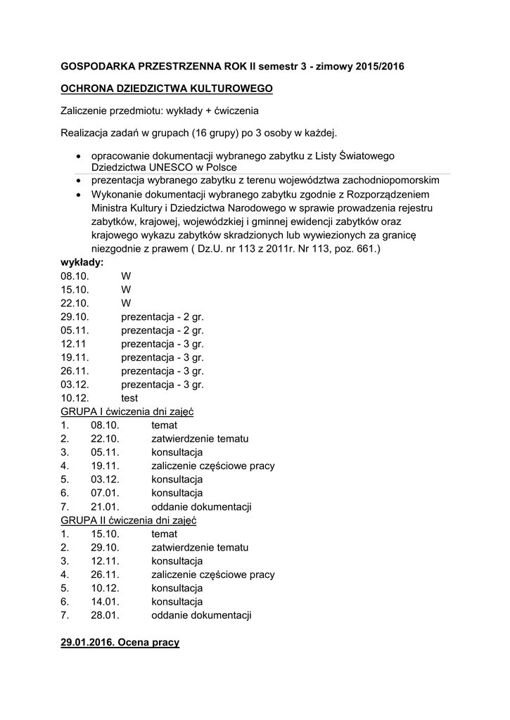 GOSPODARKA PRZESTRZENNA ROK II semestr 3 - zimowy 2015/2016 OCHRONA DZIEDZICTWA KULTUROWEGO Zaliczenie przedmiotu: wykłady + ćwiczenia Realizacja zadań w grupach (16 grupy) po 3 osoby w każdej. opracowanie dokumentacji wybranego zabytku z Listy Światowego Dziedzictwa UNESCO w Polsce prezentacja wybranego zabytku z terenu województwa zachodniopomorskim Wykonanie dokumentacji wybranego zabytku zgodnie z Rozporządzeniem Ministra Kultury i Dziedzictwa Narodowego w sprawie prowadzenia rejestru zabytków, krajowej, wojewódzkiej i gminnej ewidencji zabytków oraz krajowego wykazu zabytków skradzionych lub wywiezionych za granicę niezgodnie z prawem ( Dz.U. nr 113 z 2011r. Nr 113, poz. 661.) wykłady: 08.10. W 15.10. W 22.10. W 29.10. prezentacja - 2 gr. 05.11. prezentacja - 2 gr. 12.11 prezentacja - 3 gr. 19.11. prezentacja - 3 gr. 26.11. prezentacja - 3 gr. 03.12. prezentacja - 3 gr. 10.12. test GRUPA I ćwiczenia dni zajęć 1. 08.10. temat 2. 22.10. zatwierdzenie tematu 3. 05.11. konsultacja 4. 19.11. zaliczenie częściowe pracy 5. 03.12. konsultacja 6. 07.01. konsultacja 7. 21.01. oddanie dokumentacji GRUPA II ćwiczenia dni zajęć 1. 15.10. temat 2. 29.10. zatwierdzenie tematu 3. 12.11. konsultacja 4. 26.11. zaliczenie częściowe pracy 5. 10.12. konsultacja 6. 14.01. konsultacja 7. 28.01. oddanie dokumentacji 29.01.2016. Ocena pracy