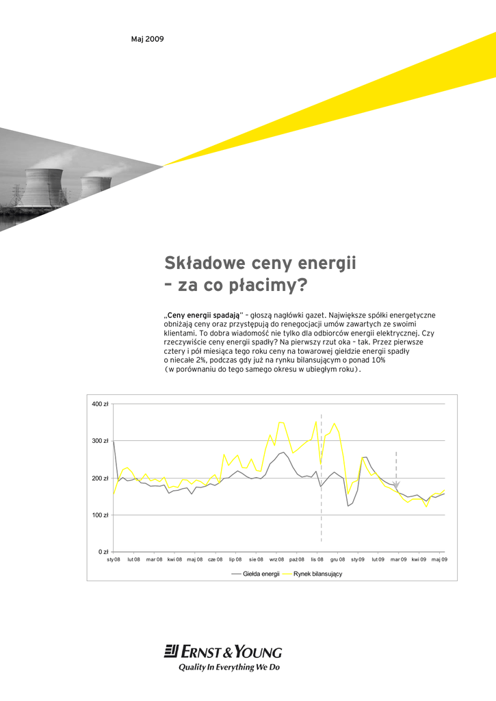Maj 2009 Składowe ceny energii – za co płacimy? „Ceny energii spadają” – głoszą nagłówki gazet. Największe spółki energetyczne obniżają ceny oraz przystępują do renegocjacji umów zawartych ze swoimi klientami. To dobra wiadomość nie tylko dla odbiorców energii elektrycznej. Czy rzeczywiście ceny energii spadły? Na pierwszy rzut oka – tak. Przez pierwsze cztery i pół miesiąca tego roku ceny na towarowej giełdzie energii spadły o niecałe 2%, podczas gdy już na rynku bilansującym o ponad 10% (w porównaniu do tego samego okresu w ubiegłym roku). 400 zł 300 zł 200 zł 100 zł 0 zł sty 08 lut 08 mar 08 kwi 08 maj 08 cze 08 lip 08 sie 08 wrz 08 Giełda energii paź 08 lis 08 gru 08 Rynek bilansujący sty 09 lut 09 mar 09 kwi 09 maj 09 Pamiętajmy jednak, że omawiane powyżej ceny energii dotyczą niecałych 5% rynku. Taką bowiem ilością energii handluje się na TGE oraz RB. Nie mamy publicznie dostępnych informacji o pozostałej części rynku (nie wiemy, jakie zmiany zostały wprowadzone do renegocjowanych kontraktów bilateralnych). Nie powinniśmy jednak oczekiwać, iż obserwowane zmiany istotnie wpłynęły na przeciętne ceny energii na polskim rynku. (1) Składowe ceny energii elektrycznej W pierwszej kolejności przyjrzyjmy się łańcuchowi wartości energii elektrycznej. Obrót Gdzie powstaje istotna część ceny energii? 8,7% Dystrybucja Zużycie energii w Krajowym Systemie Elektroenergetycznym spadło w ciągu pierwszych czterech i pół miesiącach 2009 roku o ponad 5% (w porównaniu do tego samego okresu ubiegłego roku). W kwietniu 2009 roku zużycie energii elektrycznej było niższe o ponad 10% niż w kwietniu 2008 roku. Oczywiście wpływa na to nie tylko spowolnienie gospodarcze, ale również inne czynniki, jak np. temperatura. Na podstawie danych uzyskanych z GUS zbadaliśmy, co tak naprawdę znajdowało się w cenie energii elektrycznej w 2008 roku. Prawie 60% ceny stanowi cena czystej energii elektrycznej (wytwarzanie(1) i obrót), natomiast niewiele ponad 40% to koszt jej transportu (jeszcze do nie dawna stosunek ten był bliżej proporcji 50% – 50%). Na wykresie, kolorem szarym, zaznaczono rentowność poszczególnych ogniw łańcucha wartości. Najniższa jest w przesyle (ok. 4%), podczas gdy najwyższa w wytwarzaniu i obrocie (12% i więcej). Zwróćmy w tym miejscu uwagę, że dużo polskich spółek energetycznych jest częścią zintegrowanych pionowo grup kapitałowych, co oznacza, że ich wyniki w dużym stopniu zależą od strategii jednostki dominującej. Wskazana byłaby bardziej szczegółowa dekompozycja łańcucha wartości z uwzględnieniem sektora wydobywczego, który tworzy dużą część wartości dodanej w cenie energii. Przeciętna rentowność netto dla całego sektora w 2008 roku wyniosła niecałe 10%, ale już rentowność EBITDA wyniosła 26%. Wyniki te wyglądają bardzo dobrze, nawet na tle największych spółek europejskich(które osiągnęły odpowiednio 7% i 18%). 27,8% Przesył Zapewne wiele osób pamięta sytuację z końca 2008 roku, gdy kontraktowano energię elektryczną na rok 2009. Panowało wtedy ogólne przekonanie, że na rynku brakuje energii, co wpływało na jej wysokie ceny. Pogorszenie sytuacji ekonomicznej za granicą, a następnie w naszym kraju, spowodowało ograniczenie produkcji przez największe przedsiębiorstwa. Wywarło to istotną presję na ceny energii. Spółki, które zakontraktowały energię w 2008 roku (po wysokich cenach) dzisiaj nie potrzebują jej w planowanej wcześniej ilości. Pamiętajmy także o tym, że w dużej części przypadków spółki kupowały / kontraktowały energię elektryczną po cenach z 2008 roku, a sprzedawać ją muszą po cenach dzisiejszych. Nie wszystkie szczegółowe dane finansowe są już publicznie dostępne, ale dwie duże spółki energetyczne ogłosiły wyniki za ubiegły rok: 13,6% Wytwarzanie Zużycie energii elektrycznej również spada 49,9% 0% 20% 40% 60% 80% Marża zysku netto Marża EBITDA 13,0% 28,4% 3,5% 14,3% 100% PGE ENEA Nie zostało wyodrębnione wydobycie paliwa, które stanowi prawie 50% kosztów wytwarzania. Strona 2 z 8 Składowe ceny energii – za co płacimy? Jak widać, wyniki są bardzo zróżnicowane. Należy o tym pamiętać, analizując składowe ceny energii – wnioski są oparte o kwoty zbiorcze i dotyczą całego polskiego sektora elektroenergetycznego. ► Analizę oparliśmy o koszty rodzajowe, z których jednak wyodrębniliśmy wszelkie podatki oraz obciążenia parapodatkowe. Jeden z dylematów dotyczył sposobu ujęcia podatku VAT. Można oczywiście założyć, że jest to podatek neutralny i całkowicie wyłączyć tę daninę z analizy. Byłoby to jednak założenie nieprawidłowe, ponieważ w dużej części odbiorcami energii są konsumenci, którzy nigdy podatku VAT nie odliczą. Dlatego przyjęte przez nas podejście zakłada uwzględnienie podatku VAT w analizie. ► Analiza składowych ceny energii została przeprowadzona na dwa sposoby: Rachunek prosty zakładał, iż wyszczególniliśmy tylko podatki płacone bezpośrednio przez spółki elektroenergetyczne, tj. z podsektorów od wytwarzania do obrotu (podatek VAT został uwzględniony w zakresie, w jakim stanowi on realne obciążenie dla sektora, tzn. w kwocie zobowiązania uiszczanego do budżetu). kosztów operacyjnych), ale nie stanowi znaczącej pozycji w rachunkach wyników innych podsektorów energetycznych. ► Usługi obce to druga największa grupa kosztów. Duża ich część to płatności dla innych spółek należących do tych samych grup kapitałowych (dane pozyskane z GUS zawierały zbiorcze sumy kosztów, bez zastosowania wyłączeń konsolidacyjnych). Zwyczajowo duża część kosztów usług obcych dotyczy w rzeczywistości kosztów wynagrodzeń. Nie mieliśmy wystarczających informacji, aby przeklasyfikować tę część kosztów bezpośrednio do kosztów wynagrodzeń. Dokonaliśmy jedynie wyłączenia kos