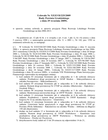Uchwała Nr XXXVII/225/2009 Rady Powiatu Grodziskiego z dnia 29 września 2009r. w sprawie: zmiany uchwały w sprawie przyjęcia Planu Rozwoju Lokalnego Powiatu Grodziskiego na lata 2006-2013. Na podstawie art. 12 pkt 8) lit. e w związku z art. 4 ust. 1 pkt 1), 6) i 8) ustawy z dnia 5 czerwca 1998 r. o samorządzie powiatowym (Dz. U. z 2001 r., Nr 142, poz. 1592 ze zmianami) uchwala się, co następuje: § 1. W Uchwale Nr XXXVIII/207/2006 Rady Powiatu Grodziskiego z dnia 31 stycznia 2006 r. w sprawie przyjęcia Planu Rozwoju Lokalnego Powiatu Grodziskiego na lata 20062013 zmienionej Uchwałą Nr XXXIX/213/2006 Rady Powiatu Grodziskiego z dnia 28 lutego 2006 r., Uchwałą Nr XLII/224/2006 Rady Powiatu Grodziskiego z dnia 30 maja 2006 r., Uchwałą Nr III/18/2006 Rady Powiatu Grodziskiego z dnia 28 grudnia 2006 r., Uchwałą Nr V/46/2007 Rady Powiatu Grodziskiego z dnia 27 lutego 2007 r., Uchwałą Nr VII/56/2007 Rady Powiatu Grodziskiego z dnia 24 kwietnia 2007 r., Uchwałą Nr XIV/96/2007 Rady Powiatu Grodziskiego z dnia 27 listopada 2007 r., Uchwałą Nr XXI/145/2008 Rady Powiatu Grodziskiego z dnia 24 czerwca 2008 r., Uchwałą Nr XXIV/152/2008 Rady Powiatu Grodziskiego z dnia 30 września 2008 r., Uchwałą Nr XXX/186/2009 Rady Powiatu Grodziskiego z dnia 24 lutego 2009r., Uchwałą Nr XXXV/217/2009 Rady Powiatu Grodziskiego z dnia 30 czerwca 2009r., w rozdziale VIII Wieloletniego Planu InwestycyjnoFinansowego wprowadza się następujące zmiany: 1) kod zadania 03 otrzymuje brzmienie jak w załączniku nr 1 do uchwały (dotyczy zadania: Przebudowa drogi powiatowej nr 2454P Modrze – Maksymilianowo na odcinku Szczepowice – Maksymilianowo) , 2) kod zadania 05 otrzymuje brzmienie jak w załączniku nr 2 do uchwały (dotyczy zadania: Remont drogi powiatowej Nr 2754P na odcinku Albertowsko – Kąkolewo – Grodzisk Wlkp.), 3) kod zadania 06 otrzymuje brzmienie jak w załączniku nr 3 do uchwały (dotyczy zadania: Modernizacja nawierzchni drogi nr 2497P Woźniki – Kotowo), 4) kod zadania 11 otrzymuje brzmienie jak w załączniku nr 4 do uchwały (dotyczy zadania: Przebudowa i remont drogi powiatowej Nr 3585P Kamieniec – droga krajowa Nr 32 na odcinku Karczewo – Granówko), 5) kod zadania 12 otrzymuje brzmienie jak w załączniku nr 5 do uchwały (dotyczy zadania: Ustawienie barier sprężystych w ciągu drogi powiatowej Nr 2755P gr. Powiatu (Wola Jabłońska) – Rakoniewice na odcinku Wioska – Jabłonna na długości 150 mb obustronnie), 6) dodaje się kod zadania 13 w brzmieniu jak w załączniku nr 6 do uchwały (dotyczy zadania: Remont drogi powiatowej nr 3593P Wielichowo – Kamieniec oraz przebudowa drogi powiatowej nr 3807P Wielichowo – Wolsztyn na odcinku Wielichowo – Prochy (ul. Pocztowa), 7) dotychczasowe kody zadań od 13 do 20 oznacza się odpowiednio 14 do 21, 8) kod zadania 16 otrzymuje brzmienie jak w załączniku nr 7 do uchwały (dotyczy zadania: Prace remontowe w budynku pałacowym Zespołu Szkół Ponadgimnazjalnych w Kotowie), 9) kod zadania 17 otrzymuje brzmienie jak w załączniku nr 8 do uchwały (dotyczy zadania: Remont Poradni Psychologiczno – Pedagogicznej w Grodzisku Wlkp.), 10) kod zadania 20 otrzymuje brzmienie jak w załączniku nr 9 do uchwały (dotyczy zadania: Urządzenie klasopracowni do przedmiotów zawodowych w Zespole Szkół Ponadgimnazjalnych Grodzisk Wlkp.), 11) kod zadania 21 – otrzymuje brzmienie jak w załączniku nr 10 do niniejszej uchwały ( dotyczy zadania: Budowa namiotowej hali sportowej w Zespole Szkół Ponadgimnazjalnych w Kotowie) § 2. Wprowadza się jednolity tekst rozdziału VIII Wieloletni Plan Inwestycyjno – Finansowy – Planowanie inwestycyjne stanowiący załącznik nr 11 do niniejszej uchwały. § 3. Wykonanie uchwały powierza się Zarządowi Powiatu. § 4. Uchwała wchodzi w życie z dniem podjęcia. Załącznik nr 1 do uchwały Nr XXXVII/225/2009 Rady Powiatu Grodziskiego z dnia 29 września 2009r. Kod zadania: 03 Jednostka koordynująca: Zarząd Powiatu. Nazwa zadania: Przebudowa drogi powiatowej nr 2454P Modrze – Maksymilianowo na odcinku Szczepowice - Maksymilianowo. Realizacja przebudowy została zaplanowana na 2010 rok. Wartość przebudowy oszacowano na kwotę: 2 428.060,00 zł. Źródło finansowania: Lata realizacji Środki własne Powiatu Środki gminy Kamieniec Środki NPPDL Razem 2007 28.060,00 --------------------28.060,00 2010 600.000,00 600.000,00 1 200.000,00 2 400.000,00 Opis zadania: Przebudowa wykonana zostanie na odcinku 3,6 km. Szerokość nawierzchni: w miejscowości Maksymilianowo – 5,0 m, poza miejscowością – 5,5 m. Na całym odcinku położona zostanie nowa nawierzchnia bitumiczna, wykonane zostanie odtworzenie odwodnienia. W Maksymilianowie, celem poprawy bezpieczeństwa, ułożone zostaną obustronnie nowe chodniki. Efekt - poprawa bezpieczeństwa ruchu i komfortu jazdy. Załącznik nr 2 do uchwały Nr XXXVII/225/2009 Rady Powiatu Grodziskiego z dnia 29 września 2009r. Kod zadania: 05 Jednostka koordynująca: Zarząd Powiatu. Nazwa zadania: Remont drogi powiatowej Nr 2754P na odcinku Albertowsko – Kąkolewo – Grodzisk Wlkp. Realizacja remontu została zaplanowana na 2010 rok. Wartość zadania oszacowano na kwotę 1.332.000,00 zł. Źródło finansowania: Lata realizacji Środki własne Powiatu Środki WRPO Razem 2010 666.000,00 666.000,00 1.332.000,00 Opis zadania: Remont zostanie wykonany na odcinku 11,6 km: - na odcinku 7,5 km w technologii podwójnego powierzchniowego utrwalenia nawierzchni emulsją i grysami, - na odcinku 1,0 km w technologii pojedynczego powierzchniowego utrwalenia nawierzchni emulsją i grysami, - na odcinku 3,1 km poprzez położenie warstwy wyrównawczej grubości 4 cm oraz warstwy ścieralnej grubości 3 cm. Na całym odcinku zostaną przebudowane łuki poziome, wykonana zostanie ścinka poboczy oraz odtworzenie odwodnienia. W m. Kąkolewo wykonany zostanie remont istniejącej kanalizacji burzowej. Szerokość jezdni – 5,0 m, przy łukac