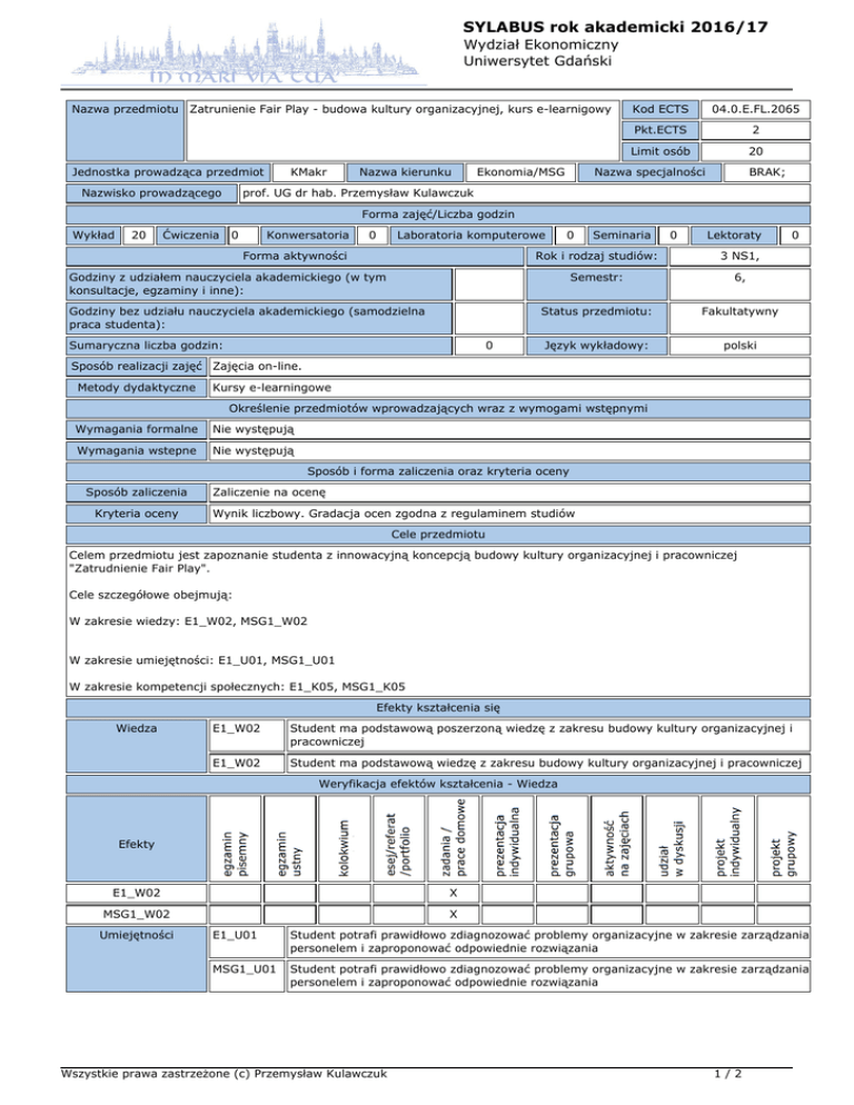 SYLABUS rok akademicki 2016/17 Wydział Ekonomiczny Uniwersytet Gdański Nazwa przedmiotu Zatrunienie Fair Play - budowa kultury organizacyjnej, kurs e-learnigowy Jednostka prowadząca przedmiot Nazwisko prowadzącego KMakr Nazwa kierunku Ekonomia/MSG Kod ECTS 04.0.E.FL.2065 Pkt.ECTS 2 Limit osób 20 Nazwa specjalności BRAK; prof. UG dr hab. Przemysław Kulawczuk Forma zajęć/Liczba godzin Wykład 20 Ćwiczenia 0 Konwersatoria 0 Laboratoria komputerowe Forma aktywności 0 Sumaryczna liczba godzin: 0 0 Lektoraty Rok i rodzaj studiów: 3 NS1, Semestr: 6, Status przedmiotu: Fakultatywny Język wykładowy: polski Godziny z udziałem nauczyciela akademickiego (w tym konsultacje, egzaminy i inne): Godziny bez udziału nauczyciela akademickiego (samodzielna praca studenta): Seminaria 0 Sposób realizacji zajęć Zajęcia on-line. Metody dydaktyczne Kursy e-learningowe Określenie przedmiotów wprowadzających wraz z wymogami wstępnymi Wymagania formalne Nie występują Wymagania wstepne Nie występują Sposób i forma zaliczenia oraz kryteria oceny Sposób zaliczenia Kryteria oceny Zaliczenie na ocenę Wynik liczbowy. Gradacja ocen zgodna z regulaminem studiów Cele przedmiotu Celem przedmiotu jest zapoznanie studenta z innowacyjną koncepcją budowy kultury organizacyjnej i pracowniczej "Zatrudnienie Fair Play". Cele szczegółowe obejmują: W zakresie wiedzy: E1_W02, MSG1_W02 W zakresie umiejętności: E1_U01, MSG1_U01 W zakresie kompetencji społecznych: E1_K05, MSG1_K05 Efekty kształcenia się Wiedza E1_W02 Student ma podstawową poszerzoną wiedzę z zakresu budowy kultury organizacyjnej i pracowniczej E1_W02 Student ma podstawową wiedzę z zakresu budowy kultury organizacyjnej i pracowniczej Weryfikacja efektów kształcenia - Wiedza Efekty E1_W02 X MSG1_W02 X Umiejętności E1_U01 Student potrafi prawidłowo zdiagnozować problemy organizacyjne w zakresie zarządzania personelem i zaproponować odpowiednie rozwiązania MSG1_U01 Student potrafi prawidłowo zdiagnozować problemy organizacyjne w zakresie zarządzania personelem i zaproponować odpowiednie rozwiązania Wszystkie prawa zastrzeżone (c) Przemysław Kulawczuk 1/2 SYLABUS rok akademicki 2016/17 Wydział Ekonomiczny Uniwersytet Gdański Weryfikacja efektów kształcenia - Umiejętności Efekty E1_U01 X MSG1_U01 X Kompetencje E1_K05 Uczestnicząc w przygotowaniu projektów związanych z zarządzaniem kadrami potrafi godzić wymagania prawne, ekonomiczne, ekologiczne, polityczne i społeczne MSG1_K05 Uczestnicząc w przygotowaniu projektów związanych z zarządzaniem kadrami potrafi godzić wymagania prawne, ekonomiczne, ekologiczne, polityczne i społeczne Weryfikacja efektów kształcenia - Kompetencje Efekty E1_K05 X MSG1_K05 X Treści programowe 1. 2. 3. 4. 5. 6. 7. 8. 9. 10. Mentoring Coaching Przywództwo Motywacja Adaptacja zawodowa Mentor jako rzecznik interesów Zarządzanie czasem Organizacja pracy Podejmowanie decyzji Zarządzanie wiekiem Wykaz literatury podstawowej i uzupełniającej Podręcznik "Standard "Zatrudnienie Fair Play". Odpowiedzialne zarządzanie zasobami ludzkimi z uwzględnieniem zarządzania wiekiem." pokazujący proces budowy strategii zarządzania zasobami ludzkimi z uwzględnieniem strategii zarządzania wiekiem w oparciu o standard ZFP obejmujący wiele praktycznych przykładów i rozwiązań stosowanych przez firmy. Podręcznik "Zostań mentorem" Podręcznik użytkownika e-platformy Dostępne na: https://www.zfp.zostanmentorem.pl/publikacje/index.html Kontakt [email protected], Wszystkie prawa zastrzeżone (c) Przemysław Kulawczuk 2/2