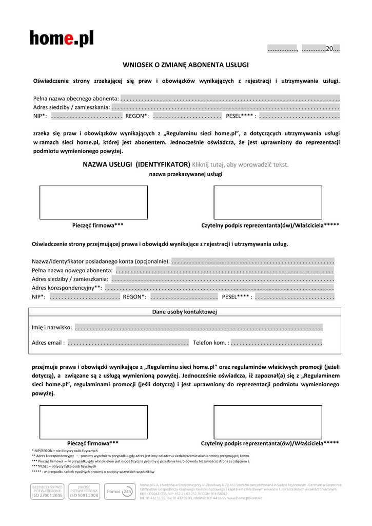 ................., ..............20.... WNIOSEK O ZMIANĘ ABONENTA USŁUGI Oświadczenie strony zrzekającej się praw i obowiązków wynikających z rejestracji i utrzymywania usługi. Pełna nazwa obecnego abonenta: . . . . . . . . . . . . . . . . . . . . . . . . . . . . . . . . . . . . . . . . . . . . . . . . . . . . . . . . . . . . . . . . . . . . . . . . Adres siedziby / zamieszkania: . . . . . . . . . . . . . . . . . . . . . . . . . . . . . . . . . . . . . . . . . . . . . . . . . . . . . . . . . . . . . . . . . . . . . . . . . . . . NIP*: . . . . . . . . . . . . . . . . . . . . . . . . REGON*: . . . . . . . . . . . . . . . . . . . . . . . PESEL**** : . . . . . . . . . . . . . . . . . . . . . . . . . . . zrzeka się praw i obowiązków wynikających z „Regulaminu sieci home.pl”, a dotyczących utrzymywania usługi w ramach sieci home.pl, której jest abonentem. Jednocześnie oświadcza, że jest uprawniony do reprezentacji podmiotu wymienionego powyżej. NAZWA USŁUGI (IDENTYFIKATOR) Kliknij tutaj, aby wprowadzić tekst. nazwa przekazywanej usługi Pieczęć firmowa*** Czytelny podpis reprezentanta(ów)/Właściciela***** Oświadczenie strony przejmującej prawa i obowiązki wynikające z rejestracji i utrzymywania usług. Nazwa/identyfikator posiadanego konta (opcjonalnie): . . . . . . . . . . . . . . . . . . . . . . . . . . . . . . . . . . . . . . . . . . . . . . . . . . . . . . . Pełna nazwa nowego abonenta: . . . . . . . . . . . . . . . . . . . . . . . . . . . . . . . . . . . . . . . . . . . . . . . . . . . . . . . . . . . . . . . . . . . . . . . . . Adres siedziby / zamieszkania: . . . . . . . . . . . . . . . . . . . . . . . . . . . . . . . . . . . . . . . . . . . . . . . . . . . . . . . . . . . . . . . . . . . . . . . . . . . Adres korespondencyjny**: . . . . . . . . . . . . . . . . . . . . . . . . . . . . . . . . . . . . . . . . . . . . . . . . . . . . . . . . . . . . . . . . . . . . . . . . . . . . . NIP*: . . . . . . . . . . . . . . . . . . . . . . . . REGON*: . . . . . . . . . . . . . . . . . . . . . . . PESEL**** : . . . . . . . . . . . . . . . . . . . . . . . . . . . Dane osoby kontaktowej Imię i nazwisko: . . . . . . . . . . . . . . . . . . . . . . . . . . . . . . . . . . . . . . . . . . . . . . . . . . . . . . . . . . . . . . . . . . . . . . . . . . . . . . . . . . . Adres email : . . . . . . . . . . . . . . . . . . . . . . . . . . . . . . . . . . . . . . . . . Telefon kom. : . . . . . . . . . . . . . . . . . . . . . . . . . . . . . . . przejmuje prawa i obowiązki wynikające z „Regulaminu sieci home.pl” oraz regulaminów właściwych promocji (jeżeli dotyczą), a związane są z usługą wymienioną powyżej. Jednocześnie oświadcza, iż zapoznał(a) się z „Regulaminem sieci home.pl”, regulaminami promocji (jeśli dotyczą) i jest uprawniony do reprezentacji podmiotu wymienionego powyżej. Pieczęć firmowa*** Czytelny podpis reprezentanta(ów)/Właściciela***** * NIP/REGON – nie dotyczy osób fizycznych ** Adres korespondencyjny – prosimy wypełnić w przypadku, gdy adres jest inny od adresu siedziby/zamieszkania strony przejmującej konto. *** Pieczęć firmowa – w przypadku gdy właścicielem jest osoba fizyczna prosimy o przesłanie ksero dowodu tożsamości ( strona ze zdjęciem ). ****PESEL – dotyczy tylko osób fizycznych ***** - w przypadku spółek cywilnych prosimy o podpisy wszystkich wspólników