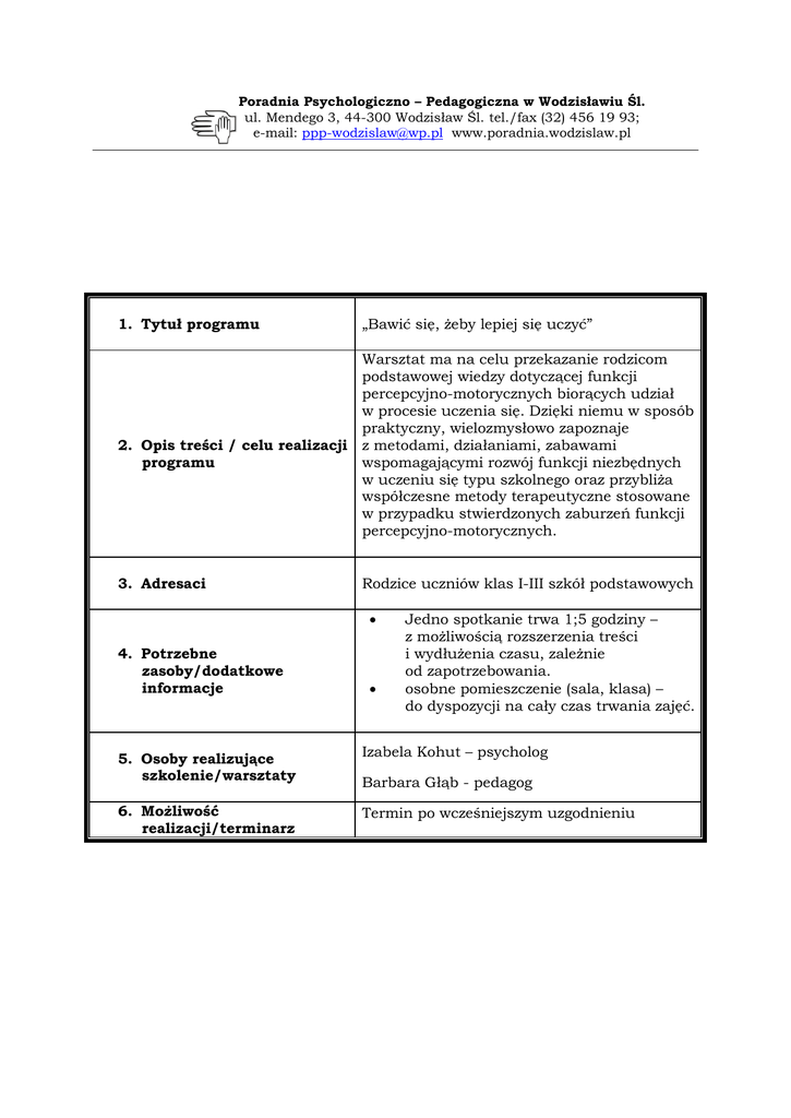 Poradnia Psychologiczno – Pedagogiczna w Wodzisławiu Śl. ul. Mendego 3, 44-300 Wodzisław Śl. tel./fax (32) 456 19 93; e-mail: [email protected] www.poradnia.wodzislaw.pl 1. Tytuł programu „Bawić się, żeby lepiej się uczyć” Warsztat ma na celu przekazanie rodzicom podstawowej wiedzy dotyczącej funkcji percepcyjno-motorycznych biorących udział w procesie uczenia się. Dzięki niemu w sposób praktyczny, wielozmysłowo zapoznaje 2. Opis treści / celu realizacji z metodami, działaniami, zabawami programu wspomagającymi rozwój funkcji niezbędnych w uczeniu się typu szkolnego oraz przybliża współczesne metody terapeutyczne stosowane w przypadku stwierdzonych zaburzeń funkcji percepcyjno-motorycznych. 3. Adresaci Rodzice uczniów klas I-III szkół podstawowych 4. Potrzebne zasoby/dodatkowe informacje Jedno spotkanie trwa 1;5 godziny – z możliwością rozszerzenia treści i wydłużenia czasu, zależnie od zapotrzebowania. osobne pomieszczenie (sala, klasa) – do dyspozycji na cały czas trwania zajęć. 5. Osoby realizujące szkolenie/warsztaty Izabela Kohut – psycholog 6. Możliwość realizacji/terminarz Termin po wcześniejszym uzgodnieniu Barbara Głąb - pedagog