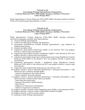 Uchwała nr [●] Zwyczajnego Walnego Zgromadzenia Akcjonariuszy Centrum Medyczne ENEL-MED Spółki Akcyjnej z siedzibą w Warszawie z dnia 18 maja 2016 r. Walne Zgromadzenie Centrum Medyczne ENEL-MED Spółki Akcyjnej postanawia dokonać Wyboru Przewodniczącego Zgromadzenia w osobie _______________________________. Uchwała nr [●] Zwyczajnego Walnego Zgromadzenia Akcjonariuszy Centrum Medyczne ENEL-MED Spółki Akcyjnej z siedzibą w Warszawie z dnia 18 maja 2016 r. Walne Zgromadzenie Centrum Medyczne ENEL-MED Spółki Akcyjnej postanawia zatwierdzić następujący porządek obrad Zgromadzenia: 1) otwarcie Walnego Zgromadzenia; 2) wybór Przewodniczącego Walnego Zgromadzenia; 3) stwierdzenie prawidłowości zwołania Walnego Zgromadzenia i jego zdolności do podejmowania uchwał; 4) przyjęcie porządku obrad; 5) rozpatrzenie sprawozdania finansowego Spółki za rok obrotowy 2015 oraz podjęcie uchwały w sprawie jego zatwierdzenia; 6) rozpatrzenie sprawozdania Zarządu z działalności Spółki w roku obrotowym 2015 oraz podjęcie uchwały w sprawie jego zatwierdzenia; 7) rozpatrzenie skonsolidowanego sprawozdania finansowego Grupy Kapitałowej Centrum Medyczne ENEL-MED za rok obrotowy 2015 oraz podjęcie uchwały w sprawie jego zatwierdzenia; 8) rozpatrzenie sprawozdania Zarządu z działalności Grupy Kapitałowej Centrum Medyczne ENEL-MED w roku obrotowym 2015 oraz podjęcie uchwały w sprawie jego zatwierdzenia; 9) rozpatrzenie sprawozdania Rady Nadzorczej za rok obrotowy 2015; 10) podjęcie uchwał w sprawie udzielenia absolutorium z wykonania obowiązków w roku obrotowym 2015 członkom Zarządu Spółki: - Adamowi Stanisławowi Rozwadowskiemu; - Jackowi Jakubowi Rozwadowskiemu; 11) podjęcie uchwał w sprawie udzielenia absolutorium z wykonania obowiązków w roku obrotowym 2015 członkom Rady Nadzorczej Spółki: - Annie Marii Rozwadowskiej, - Januszowi Ryszardowi Jakubowskiemu, - Annie Piszcz, - Zbigniewowi Wojciechowi Okońskiemu, - Adamowi Augustynowi Ciuhakowi; 12) podjęcie uchwały o podziale zysku osiągniętego przez Spółkę w roku obrotowym 2015; 13) podjęcie uchwały w sprawie wyboru członka Rady Nadzorczej Spółki; 14) podjęcie uchwały w sprawie zmiany statutu; 15) zamknięcie obrad Walnego Zgromadzenia. Uchwała nr [●] Zwyczajnego Walnego Zgromadzenia Akcjonariuszy Centrum Medyczne ENEL-MED Spółki Akcyjnej z siedzibą w Warszawie z dnia 18 maja 2016 r. Na podstawie art. 395 § 2 pkt 1 Kodeksu spółek handlowych Walne Zgromadzenie Centrum Medyczne ENEL-MED Spółki Akcyjnej z siedzibą w Warszawie zatwierdza sprawozdanie finansowe Centrum Medyczne ENEL-MED Spółki Akcyjnej z siedzibą w Warszawie za rok obrotowy 2015. Uchwała nr [●] Zwyczajnego Walnego Zgromadzenia Akcjonariuszy Centrum Medyczne ENEL-MED Spółki Akcyjnej z siedzibą w Warszawie z dnia 18 maja 2016 r. Na podstawie art. 395 § 2 pkt 1 Kodeksu spółek handlowych Walne Zgromadzenie Centrum Medyczne ENEL-MED Spółki Akcyjnej z siedzibą w Warszawie zatwierdza sprawozdanie Zarządu Centrum Medyczne ENEL-MED Spółki Akcyjnej z siedzibą w Warszawie z działalności Spółki za rok obrotowy 2015. Uchwała nr [●] Zwyczajnego Walnego Zgromadzenia Akcjonariuszy Centrum Medyczne ENEL-MED Spółki Akcyjnej z siedzibą w Warszawie z dnia 18 maja 2016 r. Na podstawie art. 395 § 5 Kodeksu spółek handlowych Walne Zgromadzenie Centrum Medyczne ENEL-MED Spółki Akcyjnej z siedzibą w Warszawie zatwierdza skonsolidowane sprawozdanie finansowe Grupy Kapitałowej Centrum Medyczne ENEL-MED za rok obrotowy 2015. Uchwała nr [●] Zwyczajnego Walnego Zgromadzenia Akcjonariuszy Centrum Medyczne ENEL-MED Spółki Akcyjnej z siedzibą w Warszawie z dnia 18 maja 2016 r. Na podstawie art. 395 § 5 Kodeksu spółek handlowych Walne Zgromadzenie Centrum Medyczne ENEL-MED Spółki Akcyjnej z siedzibą w Warszawie zatwierdza sprawozdanie Zarządu z działalności Grupy Kapitałowej Centrum Medyczne ENEL-MED Spółki Akcyjnej w roku obrotowym 2015. Uchwała nr [●] Zwyczajnego Walnego Zgromadzenia Akcjonariuszy Centrum Medyczne ENEL-MED Spółki Akcyjnej z siedzibą w Warszawie z dnia 18 maja 2016 r. Na podstawie art. 395 § 2 pkt 3 Kodeksu spółek handlowych Walne Zgromadzenie Centrum Medyczne ENEL-MED Spółki Akcyjnej z siedzibą w Warszawie postanawia udzielić Adamowi Stanisławowi Rozwadowskiemu absolutorium z wykonania przez niego obowiązków Prezesa Zarządu w roku obrotowym 2015. Uchwała nr [●] Zwyczajnego Walnego Zgromadzenia Akcjonariuszy Centrum Medyczne ENEL-MED Spółki Akcyjnej z siedzibą w Warszawie z dnia 18 maja 2016 r. Na podstawie art. 395 § 2 pkt 3 Kodeksu spółek handlowych Walne Zgromadzenie Centrum Medyczne ENEL-MED Spółki Akcyjnej z siedzibą w Warszawie postanawia udzielić Jackowi Jakubowi Rozwadowskiemu absolutorium z wykonania przez niego obowiązków Wiceprezesa Zarządu w roku obrotowym 2015. Uchwała nr [●] Zwyczajnego Walnego Zgromadzenia Akcjonariuszy Centrum Medyczne ENEL-MED Spółki Akcyjnej z siedzibą w Warszawie z dnia 18 maja 2016 r. Na podstawie art. 395 § 2 pkt 3 Kodeksu spółek handlowych Walne Zgromadzenie Centrum Medyczne ENEL-MED Spółki Akcyjnej z siedzibą w Warszawie postanawia udzielić Annie Marii Rozwadowskiej absolutorium z wykonania przez nią obowiązków Przewodniczącego Rady Nadzorczej w roku obrotowym 2015. Uchwała nr [●] Zwyczajnego Walnego Zgromadzenia Akcjonariuszy Centrum Medyczne ENEL-MED Spółki Akcyjnej z siedzibą w Warszawie z dnia 18 maja 2016 r. Na podstawie art. 395 § 2 pkt 3 Kodeksu spółek handlowych Walne Zgromadzenie Centrum Medyczne ENEL-MED Spółki Akcyjnej z siedzibą w Warszawie postanawia udzielić Januszowi Ryszardowi Jakubowskiemu absolutorium z wykonania przez niego obowiązków Członka Rady Nadzorczej w roku obrotowym 2015. Uchwała nr [●] Zwyczajnego Walnego Zgromadzenia Akcjonariuszy Centrum Medyczne ENEL-MED Spółki Akcyjnej z siedzibą w Warszawie z dnia 18 maja 2016 r. Na podstawie art. 395