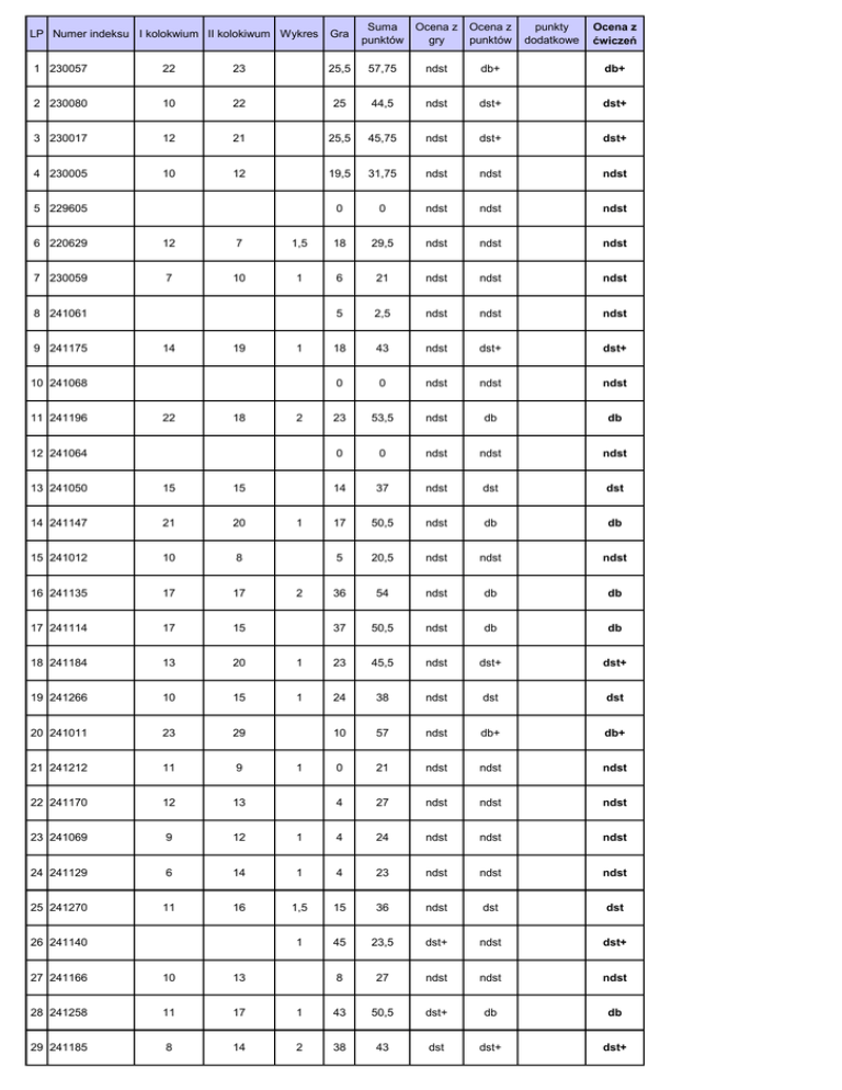 LP Numer indeksu I kolokwium II kolokiwum Wykres Gra Suma punktów Ocena z gry Ocena z punktów punkty dodatkowe Ocena z ćwiczeń 1 230057 22 23 25,5 57,75 ndst db+ db+ 2 230080 10 22 25 44,5 ndst dst+ dst+ 3 230017 12 21 25,5 45,75 ndst dst+ dst+ 4 230005 10 12 19,5 31,75 ndst ndst ndst 0 0 ndst ndst ndst 5 229605 6 220629 12 7 1,5 18 29,5 ndst ndst ndst 7 230059 7 10 1 6 21 ndst ndst ndst 5 2,5 ndst ndst ndst 18 43 ndst dst+ dst+ 0 0 ndst ndst ndst 23 53,5 ndst db db 0 0 ndst ndst ndst 14 37 ndst dst dst 17 50,5 ndst db db 5 20,5 ndst ndst ndst 36 54 ndst db db 37 50,5 ndst db db 8 241061 9 241175 14 19 1 10 241068 11 241196 22 18 2 12 241064 13 241050 15 15 14 241147 21 20 15 241012 10 8 16 241135 17 17 17 241114 17 15 18 241184 13 20 1 23 45,5 ndst dst+ dst+ 19 241266 10 15 1 24 38 ndst dst dst 20 241011 23 29 10 57 ndst db+ db+ 21 241212 11 9 0 21 ndst ndst ndst 22 241170 12 13 4 27 ndst ndst ndst 23 241069 9 12 1 4 24 ndst ndst ndst 24 241129 6 14 1 4 23 ndst ndst ndst 25 241270 11 16 1,5 15 36 ndst dst dst 1 45 23,5 dst+ ndst dst+ 8 27 ndst ndst ndst 26 241140 1 2 1 27 241166 10 13 28 241258 11 17 1 43 50,5 dst+ db db 29 241185 8 14 2 38 43 dst dst+ dst+ 30 241256 12 9 31 241031 11 32 229978 1 2 23 ndst ndst ndst 19 13 36,5 ndst dst dst 12 10 7 25,5 ndst ndst ndst 33 241203 6 8 8 18 ndst ndst ndst 34 241190 4 0 4 ndst ndst ndst 35 241272 25 21 23 57,5 ndst db+ db+ 36 241051 22 18 1 26 54 ndst db db 37 241182 19 12 1 38 51 dst db db 38 241055 17 25 2 8 50 ndst db 39 237251 10 0 10 ndst ndst 2 db ndst