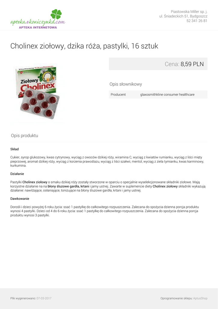 Piastowska Miller sp. j. ul. Śniadeckich 51, Bydgoszcz 52 341 26 81 Cholinex ziołowy, dzika róża, pastylki, 16 sztuk Cena: 8,59 PLN Opis słownikowy Producent glaxosmithkline consumer healthcare Opis produktu Skład Cukier, syrop glukozowy, kwas cytrynowy, wyciąg z owoców dzikiej róży, wiramina C, wyciąg z kwiatów rumianku, wyciąg z liści mięty pieprzowej, aromat dzikiej róży, wyciąg z korzenia prawoślazu, wyciąg z liści szałwii, mentol, wyciąg z ziela tymianku, kwas karminowy, kurkumina. Działanie Pastylki Cholinex ziołowy o smaku dzikiej róży zostały stworzone w oparciu o specjalnie wyselekcjonowane składniki ziołowe. Mają korzystne działanie na na błony śluzowe gardła, krtani i jamy ustnej. Zawarte w suplemencie diety Cholinex ziołowy składniki wykazują działanie: nawilżające, osłaniające, tonizujące na błony śluzowe gardła, krtani i jamy ustnej. Dawkowanie Dorośli i dzieci powyżej 6 roku życia: ssać 1 pastylkę do całkowitego rozpuszczenia. Zalecana do spożycia dzienna porcja produktu wynosi 4 pastylki. Dzieci od 4 do 6 roku życia: ssać 1 pastylkę do całkowitego rozpuszczenia. Zalecana do spożycia dzienna porcja produktu wynosi 3 pastylki. Plik wygenerowano: 07-03-2017 Powered by TCPDF (www.tcpdf.org) Oprogramowanie sklepu: AptusShop