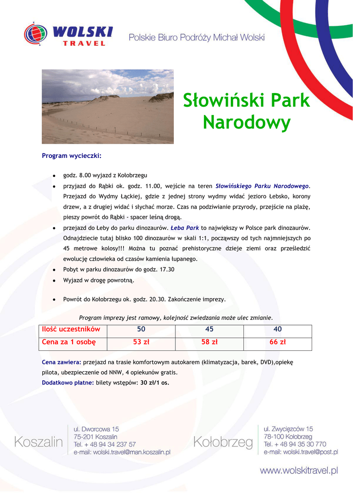 Słowiński Park Narodowy Program wycieczki: godz. 8.00 wyjazd z Kołobrzegu przyjazd do Rąbki ok. godz. 11.00, wejście na teren Słowińskiego Parku Narodowego. Przejazd do Wydmy Łąckiej, gdzie z jednej strony wydmy widać jezioro Łebsko, korony drzew, a z drugiej widać i słychać morze. Czas na podziwianie przyrody, przejście na plażę, pieszy powrót do Rąbki - spacer leśną drogą. przejazd do Łeby do parku dinozaurów. Łeba Park to największy w Polsce park dinozaurów. Odnajdziecie tutaj blisko 100 dinozaurów w skali 1:1, począwszy od tych najmniejszych po 45 metrowe kolosy!!! Można tu poznać prehistoryczne dzieje ziemi oraz prześledzić ewolucję człowieka od czasów kamienia łupanego. Pobyt w parku dinozaurów do godz. 17.30 Wyjazd w drogę powrotną. Powrót do Kołobrzegu ok. godz. 20.30. Zakończenie imprezy. Program imprezy jest ramowy, kolejność zwiedzania może ulec zmianie. Ilość uczestników Cena za 1 osobę 50 45 40 53 zł 58 zł 66 zł Cena zawiera: przejazd na trasie komfortowym autokarem (klimatyzacja, barek, DVD),opiekę pilota, ubezpieczenie od NNW, 4 opiekunów gratis. Dodatkowo płatne: bilety wstępów: 30 zł/1 os.