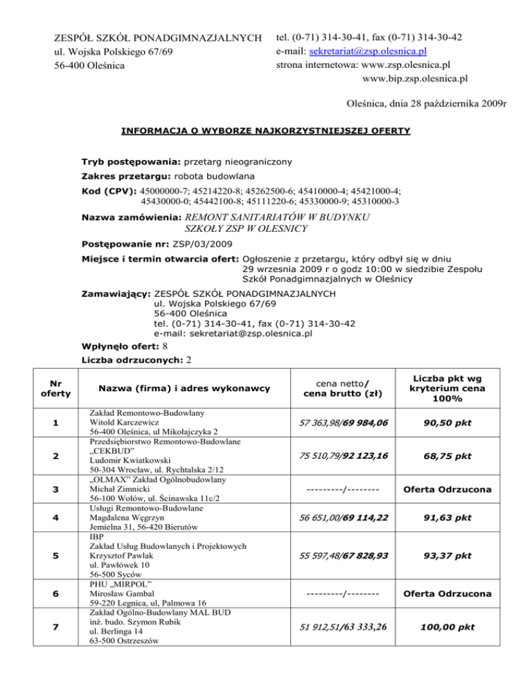ZESPÓŁ SZKÓŁ PONADGIMNAZJALNYCH ul. Wojska Polskiego 67/69 56-400 Oleśnica tel. (0-71) 314-30-41, fax (0-71) 314-30-42 e-mail: [email protected] strona internetowa: www.zsp.olesnica.pl www.bip.zsp.olesnica.pl Oleśnica, dnia 28 października 2009r INFORMACJA O WYBORZE NAJKORZYSTNIEJSZEJ OFERTY Tryb postępowania: przetarg nieograniczony Zakres przetargu: robota budowlana Kod (CPV): 45000000-7; 45214220-8; 45262500-6; 45410000-4; 45421000-4; 45430000-0; 45442100-8; 45111220-6; 45330000-9; 45310000-3 Nazwa zamówienia: REMONT SANITARIATÓW W BUDYNKU SZKOŁY ZSP W OLESNICY Postępowanie nr: ZSP/03/2009 Miejsce i termin otwarcia ofert: Ogłoszenie z przetargu, który odbył się w dniu 29 wrzesnia 2009 r o godz 10:00 w siedzibie Zespołu Szkół Ponadgimnazjalnych w Oleśnicy Zamawiający: ZESPÓŁ SZKÓŁ PONADGIMNAZJALNYCH ul. Wojska Polskiego 67/69 56-400 Oleśnica tel. (0-71) 314-30-41, fax (0-71) 314-30-42 e-mail: [email protected] Wpłynęło ofert: 8 Liczba odrzuconych: Nr oferty 1 2 3 4 5 6 7 2 Nazwa (firma) i adres wykonawcy Zakład Remontowo-Budowlany Witold Karczewicz 56-400 Oleśnica, ul Mikołajczyka 2 Przedsiębiorstwo Remontowo-Budowlane „CEKBUD” Ludomir Kwiatkowski 50-304 Wrocław, ul. Rychtalska 2/12 „OLMAX” Zakład Ogólnobudowlany Michał Zimnicki 56-100 Wołów, ul. Ścinawska 11c/2 Usługi Remontowo-Budowlane Magdalena Węgrzyn Jemielna 31, 56-420 Bierutów IBP Zakład Usług Budowlanych i Projektowych Krzysztof Pawlak ul. Pawłówek 10 56-500 Syców PHU „MIRPOL” Mirosław Gambal 59-220 Legnica, ul, Palmowa 16 Zakład Ogólno-Budowlany MAL BUD inż. budo. Szymon Rubik ul. Berlinga 14 63-500 Ostrzeszów cena netto/ cena brutto (zł) Liczba pkt wg kryterium cena 100% 57 363,98/69 984,06 90,50 pkt 75 510,79/92 123,16 68,75 pkt ---------/-------- Oferta Odrzucona 56 651,00/69 114,22 91,63 pkt 55 597,48/67 828,93 93,37 pkt ---------/-------- Oferta Odrzucona 51 912,51/63 333,26 100,00 pkt ZESPÓŁ SZKÓŁ PONADGIMNAZJALNYCH ul. Wojska Polskiego 67/69 56-400 Oleśnica 8 Przedsiębiorstwo Usługowo-Handlowe „LUXMAL” Henryk Kluska 56-500 Syców, Wielowieś 20 tel. (0-71) 314-30-41, fax (0-71) 314-30-42 e-mail: [email protected] strona internetowa: www.zsp.olesnica.pl www.bip.zsp.olesnica.pl 52 861,68/64 491,25 98,20 pkt Jednocześnie zgodnie z art. 92 ust.1 pkt 2) Ustawy Pzp Zamawiający zawiadamia o wykonawcach, których oferty zostały odrzucone: Uzasadnienie faktyczne i prawne - Ofertę nr 3 „OLMAX” Zakład Ogólnobudowlany, Michał Zimnicki, 56-100 Wołów, ul. Ścinawska 11c/2 oraz oferta nr 6 PHU „MIRPOL”, Mirosław Gambal, 59-220 Legnica, ul, Palmowa 16 wykluczono na podstawie art. 24 ust 2 pkt 3 Ustawy Prawo zamówień publicznych. Zamawiający zgodnie z art. 26 ust 3 ustawy Pzp wezwał Wykonawcę do uzupełnienia dokumentów potwierdzających spełnienie warunków udziału w postępowaniu. Wykonawca w wyznaczonym terminie nie dokonał uzupełnienia dokumentów. Na podstawie art. 24 ust.4 ustawy Prawo zamówień publicznych ofertę Wykonawcy wykluczonego uznaje się za odrzuconą Na podstawie art. 92 ust 1 ustawy z dnia 29 stycznia 2004r. Prawo zamówień publicznych (Dz. U. z 2007r. , nr 82, poz.560) Zamawiający zawiadamia, że w wyniku przeprowadzonej procedury zamówienia publicznego w trybie przetargu nieograniczonego na w/w zadanie wybrano ofertę nr 7 Zakład Ogólno-Budowlany MAL BUD inż. budo. Szymon Rubik ul. Berlinga 14 63-500 Ostrzeszów na kwotę: 63 333,26zł (brutto) Dziękując za złożenie ofert w przedmiotowym postępowaniu, zapraszamy do udziału w kolejnych postępowaniach o udzielenie zamówienia publicznego. Zatwierdził Dyrektor mgr Jacek Stala