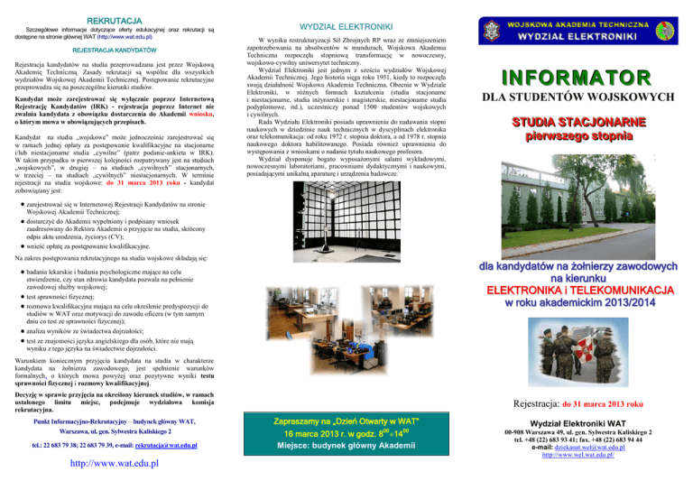 REKRUTACJA Szczegółowe informacje dotyczące oferty edukacyjnej oraz rekrutacji są dostępne na stronie głównej WAT (http://www.wat.edu.pl). REJESTRACJA KANDYDATÓW Rejestracja kandydatów na studia przeprowadzana jest przez Wojskową Akademię Techniczną. Zasady rekrutacji są wspólne dla wszystkich wydziałów Wojskowej Akademii Technicznej. Postępowanie rekrutacyjne przeprowadza się na poszczególne kierunki studiów. Kandydat może zarejestrować się wyłącznie poprzez Internetową Rejestrację Kandydatów (IRK) - rejestracja poprzez Internet nie zwalnia kandydata z obowiązku dostarczenia do Akademii wniosku, o którym mowa w obowiązujących przepisach. Kandydat na studia „wojskowe” może jednocześnie zarejestrować się w ramach jednej opłaty za postępowanie kwalifikacyjne na stacjonarne i/lub niestacjonarne studia „cywilne” (patrz podanie-ankieta w IRK). W takim przypadku w pierwszej kolejności rozpatrywany jest na studiach „wojskowych”, w drugiej – na studiach „cywilnych” stacjonarnych, w trzeciej – na studiach „cywilnych” niestacjonarnych. W terminie rejestracji na studia wojskowe: do 31 marca 2013 roku - kandydat zobowiązany jest: WYDZIAŁ ELEKTRONIKI W wyniku restrukturyzacji Sił Zbrojnych RP wraz ze zmniejszeniem zapotrzebowania na absolwentów w mundurach, Wojskowa Akademia Techniczna rozpoczęła stopniową transformację w nowoczesny, wojskowo-cywilny uniwersytet techniczny. Wydział Elektroniki jest jednym z sześciu wydziałów Wojskowej Akademii Technicznej. Jego historia sięga roku 1951, kiedy to rozpoczęła swoją działalność Wojskowa Akademia Techniczna. Obecnie w Wydziale Elektroniki, w różnych formach kształcenia (studia stacjonarne i niestacjonarne, studia inżynierskie i magisterskie, niestacjonarne studia podyplomowe, itd.), uczestniczy ponad 1500 studentów wojskowych i cywilnych. Rada Wydziału Elektroniki posiada uprawnienia do nadawania stopni naukowych w dziedzinie nauk technicznych w dyscyplinach elektronika oraz telekomunikacja: od roku 1972 r. stopnia doktora, a od 1978 r. stopnia naukowego doktora habilitowanego. Posiada również uprawnienia do występowania z wnioskami o nadanie tytułu naukowego profesora. Wydział dysponuje bogato wyposażonymi salami wykładowymi, nowoczesnymi laboratoriami, pracowniami dydaktycznymi i naukowymi, posiadającymi unikalną aparaturę i urządzenia badawcze. INFORMATOR DLA STUDENTÓW WOJSKOWYCH S STTU UD DIIA AS STTA AC CJJO ON NA AR RN NE E ppiieerrw wsszzeeggoo ssttooppnniiaa zarejestrować się w Internetowej Rejestracji Kandydatów na stronie Wojskowej Akademii Technicznej; dostarczyć do Akademii wypełniony i podpisany wniosek zaadresowany do Rektora Akademii o przyjęcie na studia, skrócony odpis aktu urodzenia, życiorys (CV); wnieść opłatę za postępowanie kwalifikacyjne. Na zakres postępowania rekrutacyjnego na studia wojskowe składają się: dla kandydatów na żołnierzy zawodowych na kierunku ELEKTRONIKA i TELEKOMUNIKACJA w roku akademickim 2013/2014 badania lekarskie i badania psychologiczne mające na celu stwierdzenie, czy stan zdrowia kandydata pozwala na pełnienie zawodowej służby wojskowej; test sprawności fizycznej; rozmowa kwalifikacyjna mająca na celu określenie predyspozycji do studiów w WAT oraz motywacji do zawodu oficera (w tym samym dniu co test ze sprawności fizycznej); analiza wyników ze świadectwa dojrzałości; test ze znajomości języka angielskiego dla osób, które nie mają wyniku z tego języka na świadectwie dojrzałości. Warunkiem koniecznym przyjęcia kandydata na studia w charakterze kandydata na żołnierza zawodowego, jest spełnienie warunków formalnych, o których mowa powyżej oraz pozytywne wyniki testu sprawności fizycznej i rozmowy kwalifikacyjnej. Decyzję w sprawie przyjęcia na określony kierunek studiów, w ramach ustalonego limitu miejsc, podejmuje wydziałowa komisja rekrutacyjna. Punkt Informacyjno-Rekrutacyjny – budynek główny WAT, Warszawa, ul. gen. Sylwestra Kaliskiego 2 tel.: 22 683 79 38; 22 683 79 39, e-mail: [email protected] http://www.wat.edu.pl Rejestracja: do 31 marca 2013 roku Zapraszamy na „Dzień Otwarty w WAT” 00 00 16 marca 2013 r. w godz. 8 14 Miejsce: budynek główny Akademii Wydział Elektroniki WAT 00-908 Warszawa 49, ul. gen. Sylwestra Kaliskiego 2 tel. +48 (22) 683 93 41; fax. +48 (22) 683 94 44 e-mail: [email protected] http://www.wel.wat.edu.pl/ Na rok akademicki 2013/2014, w okresie do 31 marca 2013r. przeprowadzona zostanie rekrutacja na stacjonarne studia pierwszego stopnia dla kandydatów na żołnierzy zawodowych. Model kształcenia podchorążych składa się z modułów: I. szkolenie ogólnowojskowe Programy studiów mają charakter autorski, a ich struktura jest elastyczna. Spełniają wymagania standardów kształcenia opracowane przez Ministerstwo Nauki i Szkolnictwa Wyższego, a w części „wojskowej” standardu kształcenia wojskowego dla kandydatów na oficerów. Zajęcia prowadzone są w formie wykładów, ćwiczeń rachunkowych, laboratoryjnych i seminariów. Studia kończą się wykonaniem pracy dyplomowej i egzaminem dyplomowym, a w części wojskowej egzaminem oficerskim. Plany studiów dla podchorążych zakładają realizację dwóch modułów: modułu kształcenia politechnicznego realizowanego na kierunku studiów, zgodnie ze standardami kształcenia określonymi przez ministra właściwego do spraw szkolnictwa wyższego i specjalności zdefiniowanej potrzebami resortu obrony narodowej, prowadzącego do ukończenia studiów wyższych, modułu szkolenia wojskowego wspólnego dla wszystkich podchorążych Akademii, niezbędnego do mianowania na pierwszy II. kształcenie humanistyczne III. kształcenie przywódcze IV. szkolenie sportowo-językowe blok kształcenia specjalistycznego OFERTA SPECJALNOŚCI „WOJSKOWYCH” W WYDZIALE ELEKTRONIKI WAT Pierwsze podstawowe szkolenie wojskowe, kończące się przysięgą wojskową, realizowane jes