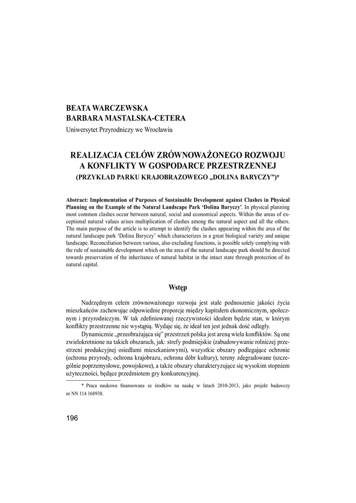 BEATA WARCZEWSKA BARBARA MASTALSKA-CETERA Uniwersytet Przyrodniczy we Wrocławiu REALIZACJA CELÓW ZRÓWNOWAŻONEGO ROZWOJU A KONFLIKTY W GOSPODARCE PRZESTRZENNEJ (PRZYKŁAD PARKU KRAJOBRAZOWEGO „DOLINA BARYCZY”)* Abstract: Implementation of Purposes of Sustainable Development against Clashes in Physical Planning on the Example of the Natural Landscape Park ‘Dolina Baryczy’. In physical planning most common clashes occur between natural, social and economical aspects. Within the areas of exceptional natural values arises multiplication of clashes among the natural aspect and all the others. The main purpose of the article is to attempt to identify the clashes appearing within the area of the natural landscape park ‘Dolina Baryczy’ which characterizes in a great biological variety and unique landscape. Reconciliation between various, also excluding functions, is possible solely complying with the rule of sustainable development which on the area of the natural landscape park should be directed towards preservation of the inheritance of natural habitat in the intact state through protection of its natural capital. Wstęp Nadrzędnym celem zrównoważonego rozwoju jest stałe podnoszenie jakości życia mieszkańców zachowując odpowiednie proporcje między kapitałem ekonomicznym, społecznym i przyrodniczym. W tak zdefiniowanej rzeczywistości ideałem będzie stan, w którym konflikty przestrzenne nie wystąpią. Wydaje się, że ideał ten jest jednak dość odległy. Dynamicznie „przeobrażająca się” przestrzeń polska jest areną wielu konfliktów. Są one zwielokrotnione na takich obszarach, jak: strefy podmiejskie (zabudowywanie rolniczej przestrzeni produkcyjnej osiedlami mieszkaniowymi), wszystkie obszary podlegające ochronie (ochrona przyrody, ochrona krajobrazu, ochrona dóbr kultury), tereny zdegradowane (szczególnie poprzemysłowe, powojskowe), a także obszary charakteryzujące się wysokim stopniem użyteczności, będące przedmiotem gry konkurencyjnej. * Praca naukowa finansowana ze środków na naukę w latach 2010-2013, jako projekt badawczy nr NN 114 168938. 196 Fot. 1. Unikatowy krajobraz PK „Dolina Baryczy Źródło: Autorki opracowania (fot. 1-5). W prezentowanym opracowaniu, na tle rozważań teoretycznych przedstawiono konflikty przestrzenne w Parku Krajobrazowym „Dolina Baryczy”. Walory przyrodnicze i krajobrazowe PK „Dolina Baryczy” są unikalne w skali europejskiej (fot. 1). Obszar ten charakteryzuje się występowaniem wielkiej różnorodności biologicznej oraz pięknym krajobrazem, który tworzą stawy, mozaiki pól uprawnych i łąk oraz lasy (Ochrona przyrody… 2008). Ten niezwykle cenny historycznie, kulturowo i przyrodniczo obszar, stanowi arenę wielu konfliktów przestrzennych istniejących i potencjalnych. 1. Pojęcie konfliktu w gospodarce przestrzennej Wydaje się, że konflikt (łac. conflictus – zderzenie) jest zjawiskiem nieuniknionym w przestrzeni, której użytkownikami są różnorakie grupy społeczne, grupy „interesów”, indywidualni ludzie, liczni właściciele nieruchomości. Każdy z użytkowników chce korzystać z walorów i zasobów przestrzeni w sposób najbardziej mu odpowiadający, a także najmniej kapitałochłonny. Konflikt wyrasta na gruncie nagromadzonych sprzecznych emocji i może się objawić wybuchem wrogich i antagonistycznych postaw. Konsekwencją nierozwiązywania konfliktów jest ich nawarstwienie, które może prowadzić do uniemożliwienia realizacji celów rozwoju danego obszaru, a także znacznego wzrostu kosztów, szczególnie społecznych (Kołodziejski 1982). Rolą zarządzających przestrzenią jest minimalizacja i rozwiązywanie konfliktów istniejących oraz zapobieganie powstawaniu konfliktów potencjalnych. Odpowiednim do tego narzędziem są opracowania planistyczne, szczególnie miejscowe plany zagospodarowania przestrzennego, mające moc prawną (Warczewska, Mastalska-Cetera 2008). Źródłem konfliktów przestrzennych może być ograniczoność zasobów przestrzeni, lub ich nadmierna eksploatacja (np. zbyt duża intensywność zabudowy). Konflikty mogą być związane ze sprzecznymi celami użytkowników przestrzeni (np. realizacja nowego boiska sportowego czy zakładu produkcyjnego). Może je także wywołać negatywne oddziaływanie danego zainwestowania na sąsiedztwo (np. emisja zanieczyszczeń), powodujące konieczność wprowadzania różnego rodzaju ograniczeń w użytkowaniu terenów sąsiednich. Kolejnym powo- 197 dem powstania konfliktu może być dążenie do realizacji prawa własności, praw ludzkich oraz innych praw użytkowników przestrzeni, które mogą być wzajemnie sprzeczne. Kontrowersje może wywołać lokalizacja w przestrzeni nowego obiektu, który sam nie wywołując konfliktu, przyczyni się do powstania kolejnych inwestycji, będących źródłem konfliktów. Przykładem może być realizacja nowej drogi, przy której po pewnym czasie powstaje zakład produkcyjny, uciążliwy dla mieszkańców sąsiedniej zabudowy mieszkaniowej. Malisz (1984) dzieli konflikty przestrzenne na dwa rodzaje: konflikty celów przestrzennych rozpatrywane w czasie oraz konflikty celów powstałe na tle relacji przestrzennych. Konflikt w czasie może powstać wtedy, kiedy realizacja potrzeb współczesnego pokolenia może uniemożliwić zaspokojenie potrzeb pokoleń przyszłych. Konflikt relacji przestrzennych może mieć swoje źródło w sytuacji walki konkurencyjnej o przestrzeń, mającą wysokie walory użytkowe (np. ma korzystne warunki rozwoju rolnictwa i korzystne warunki rozwoju osadnictwa lub turystyki) lub też może wynikać z niekorzystnego sąsiedztwa, wymuszającego ograniczenia w użytkowaniu przestrzeni. Należy zwrócić uwagę, że procesy konfliktowe mogą być destrukcyjne i konstruktywne. Te pierwsze są oczywiście niepożądane, gdyż mogą prowadzić do przemocy i zniszczenia. Drugie mogą stać się „motorem postępu”, wywoływać konie