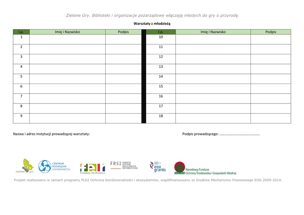 Zielone Gry. Biblioteki i organizacje pozarządowe włączają młodych do gry o przyrodę. Warsztaty z młodzieżą l.p. 1 Imię i Nazwisko Podpis l.p. 10 2 11 3 12 4 13 5 14 6 15 7 16 8 17 9 18 Nazwa i adres instytucji prowadzącej warsztaty: Imię i Nazwisko Podpis Podpis prowadzącego: …………………………………….. Projekt realizowany w ramach programu PL02 Ochrona bioróżnorodności i ekosystemów, współfinansowany ze środków Mechanizmu Finansowego EOG 2009-2014.