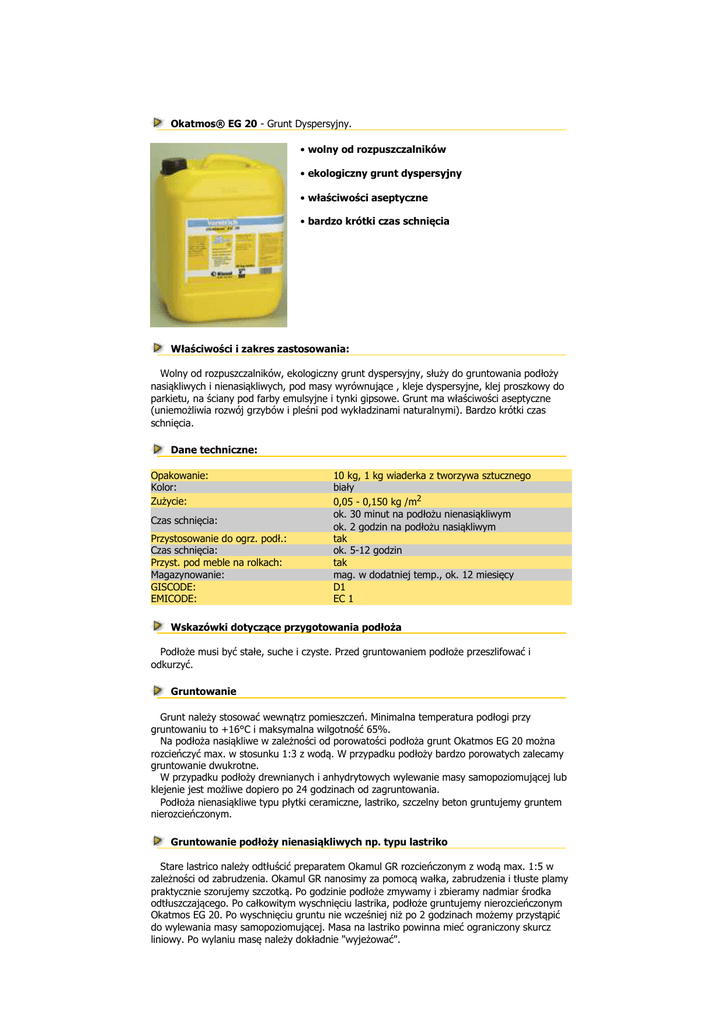 Okatmos® EG 20 - Grunt Dyspersyjny. • wolny od rozpuszczalników • ekologiczny grunt dyspersyjny • właściwości aseptyczne • bardzo krótki czas schnięcia Właściwości i zakres zastosowania: Wolny od rozpuszczalników, ekologiczny grunt dyspersyjny, służy do gruntowania podłoży nasiąkliwych i nienasiąkliwych, pod masy wyrównujące , kleje dyspersyjne, klej proszkowy do parkietu, na ściany pod farby emulsyjne i tynki gipsowe. Grunt ma właściwości aseptyczne (uniemożliwia rozwój grzybów i pleśni pod wykładzinami naturalnymi). Bardzo krótki czas schnięcia. Dane techniczne: Opakowanie: Kolor: Zużycie: Czas schnięcia: Przystosowanie do ogrz. podł.: Czas schnięcia: Przyst. pod meble na rolkach: Magazynowanie: GISCODE: EMICODE: 10 kg, 1 kg wiaderka z tworzywa sztucznego biały 0,05 - 0,150 kg /m2 ok. 30 minut na podłożu nienasiąkliwym ok. 2 godzin na podłożu nasiąkliwym tak ok. 5-12 godzin tak mag. w dodatniej temp., ok. 12 miesięcy D1 EC 1 Wskazówki dotyczące przygotowania podłoża Podłoże musi być stałe, suche i czyste. Przed gruntowaniem podłoże przeszlifować i odkurzyć. Gruntowanie Grunt należy stosować wewnątrz pomieszczeń. Minimalna temperatura podłogi przy gruntowaniu to +16°C i maksymalna wilgotność 65%. Na podłoża nasiąkliwe w zależności od porowatości podłoża grunt Okatmos EG 20 można rozcieńczyć max. w stosunku 1:3 z wodą. W przypadku podłoży bardzo porowatych zalecamy gruntowanie dwukrotne. W przypadku podłoży drewnianych i anhydrytowych wylewanie masy samopoziomującej lub klejenie jest możliwe dopiero po 24 godzinach od zagruntowania. Podłoża nienasiąkliwe typu płytki ceramiczne, lastriko, szczelny beton gruntujemy gruntem nierozcieńczonym. Gruntowanie podłoży nienasiąkliwych np. typu lastriko Stare lastrico należy odtłuścić preparatem Okamul GR rozcieńczonym z wodą max. 1:5 w zależności od zabrudzenia. Okamul GR nanosimy za pomocą wałka, zabrudzenia i tłuste plamy praktycznie szorujemy szczotką. Po godzinie podłoże zmywamy i zbieramy nadmiar środka odtłuszczającego. Po całkowitym wyschnięciu lastrika, podłoże gruntujemy nierozcieńczonym Okatmos EG 20. Po wyschnięciu gruntu nie wcześniej niż po 2 godzinach możemy przystąpić do wylewania masy samopoziomującej. Masa na lastriko powinna mieć ograniczony skurcz liniowy. Po wylaniu masę należy dokładnie "wyjeżować". Narzędzia: Wałek z gąbki lub z naturalnej wełny. Czyszczenie narzędzi: Narzędzia czyścić wodą. Palety: 60 x 6 kg podwójny pojemnik z metalu 12 x 1 kg pojemnik z tworzywa sztucznego Powyższe dane, przygotowanie i zastosowanie produktu oparto na naszej wiedzy i doświadczeniu. Z powodu różnych niezależnych od nas czynników, np. nietypowe podłoża, warunki zewnętrzne, zalecamy przeprowadzenie własnych prób, aby stwierdzić, czy nasz produkt nadaje się do danego postępowania. Firma Kiesel Polska nie ponosi odpowiedzialności z tego powodu.