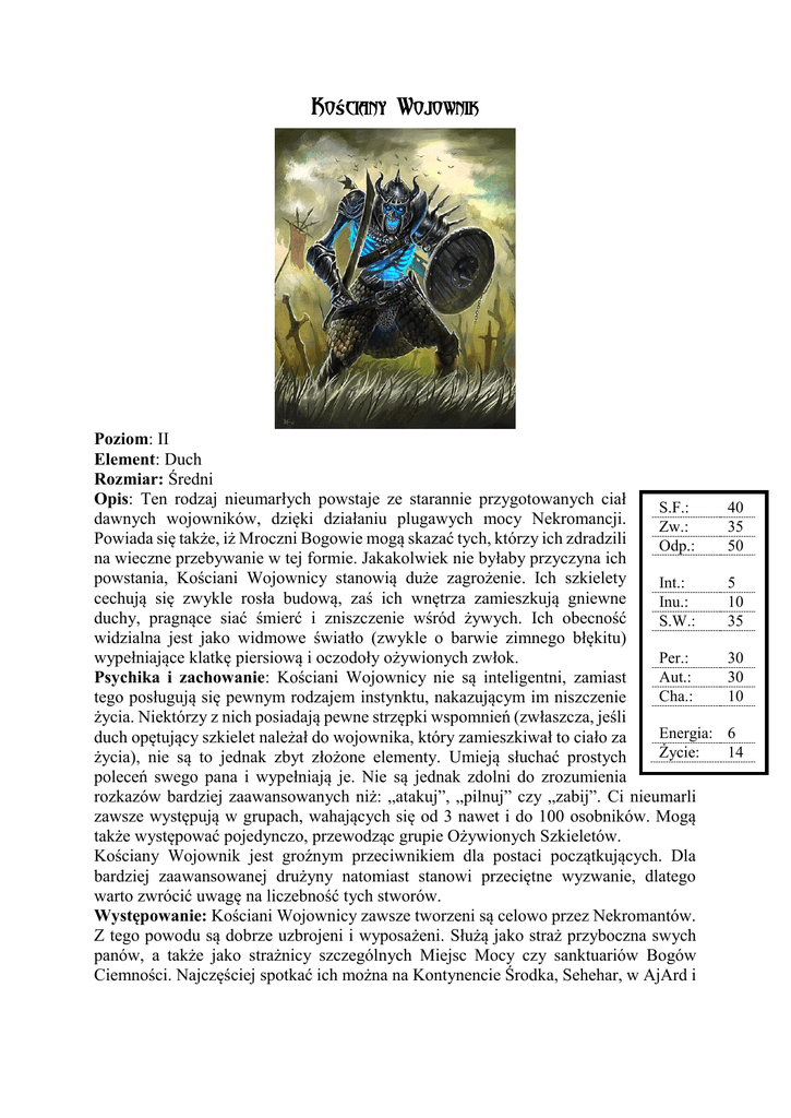 Kościany Wojownik Poziom: II Element: Duch Rozmiar: Średni Opis: Ten rodzaj nieumarłych powstaje ze starannie przygotowanych ciał S.F.: dawnych wojowników, dzięki działaniu plugawych mocy Nekromancji. Zw.: Powiada się także, iż Mroczni Bogowie mogą skazać tych, którzy ich zdradzili Odp.: na wieczne przebywanie w tej formie. Jakakolwiek nie byłaby przyczyna ich powstania, Kościani Wojownicy stanowią duże zagrożenie. Ich szkielety Int.: cechują się zwykle rosła budową, zaś ich wnętrza zamieszkują gniewne Inu.: duchy, pragnące siać śmierć i zniszczenie wśród żywych. Ich obecność S.W.: widzialna jest jako widmowe światło (zwykle o barwie zimnego błękitu) wypełniające klatkę piersiową i oczodoły ożywionych zwłok. Per.: Aut.: Psychika i zachowanie: Kościani Wojownicy nie są inteligentni, zamiast Cha.: tego posługują się pewnym rodzajem instynktu, nakazującym im niszczenie życia. Niektórzy z nich posiadają pewne strzępki wspomnień (zwłaszcza, jeśli Energia: duch opętujący szkielet należał do wojownika, który zamieszkiwał to ciało za Życie: życia), nie są to jednak zbyt złożone elementy. Umieją słuchać prostych poleceń swego pana i wypełniają je. Nie są jednak zdolni do zrozumienia rozkazów bardziej zaawansowanych niż: „atakuj”, „pilnuj” czy „zabij”. Ci nieumarli zawsze występują w grupach, wahających się od 3 nawet i do 100 osobników. Mogą także występować pojedynczo, przewodząc grupie Ożywionych Szkieletów. Kościany Wojownik jest groźnym przeciwnikiem dla postaci początkujących. Dla bardziej zaawansowanej drużyny natomiast stanowi przeciętne wyzwanie, dlatego warto zwrócić uwagę na liczebność tych stworów. Występowanie: Kościani Wojownicy zawsze tworzeni są celowo przez Nekromantów. Z tego powodu są dobrze uzbrojeni i wyposażeni. Służą jako straż przyboczna swych panów, a także jako strażnicy szczególnych Miejsc Mocy czy sanktuariów Bogów Ciemności. Najczęściej spotkać ich można na Kontynencie Środka, Sehehar, w AjArd i 40 35 50 5 10 35 30 30 10 6 14 na Lenji. W Torgeth pojawiają się dość rzadko z uwagi na panujące tam warunki klimatyczne (które utrudniają rozkład zwłok). Należy pamiętać, że gdy Nekromanta umrze wszyscy stworzeni przez niego nieumarli rozpadają się. Umiejętności: Jeździectwo +9, Krycie się +9, Uniki +15, Obserwacja +9, Zastraszanie +12. Zasady specjalne: Kościani Wojownicy są dobrze Zdolności specjalne: wyposażeni przez istoty, którym służą – dlatego ich - Infrawizja; broń i zbroja jest w dobrym stanie. Niektórzy z nich - Nieumarły; walczą wręcz, inni są dobrymi strzelcami. Czasami - Negatywna energia; dosiadają także szkieletowych rumaków. Wszyscy - Wyczucie życia; traktowani są oczywiście jak członkowie klasy - Silny cios; Wojownika. Szkielety otrzymują tylko połowę obrażeń od broni strzeleckiej i kolnej (strzał, bełtów czy rapierów). Stwory tego rodzaju posiadają P.M. równy 1. Nie Kościany zbrojny mają także żadnych zdolności magicznych i nie Biegłość P.A. Obr. mogą używać zaklęć. Miecz/Topór 120 K8 +5 Ciekawostki: Sporadycznie Kościany Wojownik Tarcza 80 może powstać samoistnie, na skutek tego, iż duch lub Dwuręczne 140 K10 + 6 doświadczonego wojownika (przynajmniej z poziomu II) zostanie przebudzony poprzez zerwanie 9% Krytyk: Sieci w danym miejscu. Przyczyną jego 30 Inicjatywa: przebudzenia może być też naruszenie grobowca przez rabusiów. Tego rodzaju istota jest nieco 30 P.O. potężniejsza, niż słudzy tworzeni przez Nekromantów. Posiada ona własną inteligencję (na Średnia zbroja i hełm: Pancerz: poziomie 25) i umie wzbudzać strach. W sposób 5 Obrony naturalny także przewodzi wszystkim słabszym ożywieńcom na terenie swego grobowca. Zachowuje ona wiele ze swojej pamięci i nie musi Kościany łucznik być koniecznie wrogo nastawiona do żywych. Biegłość P.A. Obr. Często pragnie po prostu ochronić swój grobowiec, Łuk 120 K8 + 3 opowiedzieć swoją historię lub na powrót zapaść w Krótkie 80 K6 + 5 sen śmierci. Krytyk: Inicjatywa: 11% 40 P.O. 40 Pancerz: Zbroja lekka z hełmem: 3 Obrony