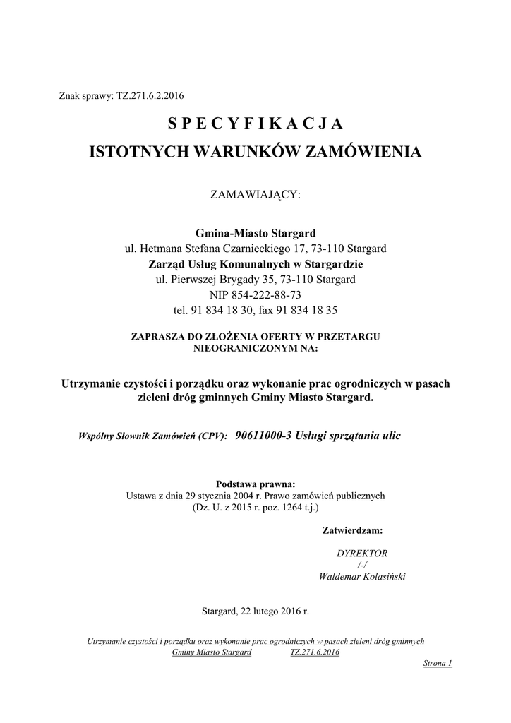 Znak sprawy: TZ.271.6.2.2016 SPECYFIKACJA ISTOTNYCH WARUNKÓW ZAMÓWIENIA ZAMAWIAJĄCY: Gmina-Miasto Stargard ul. Hetmana Stefana Czarnieckiego 17, 73-110 Stargard Zarząd Usług Komunalnych w Stargardzie ul. Pierwszej Brygady 35, 73-110 Stargard NIP 854-222-88-73 tel. 91 834 18 30, fax 91 834 18 35 ZAPRASZA DO ZŁOŻENIA OFERTY W PRZETARGU NIEOGRANICZONYM NA: Utrzymanie czystości i porządku oraz wykonanie prac ogrodniczych w pasach zieleni dróg gminnych Gminy Miasto Stargard. Wspólny Słownik Zamówień (CPV): 90611000-3 Usługi sprzątania ulic Podstawa prawna: Ustawa z dnia 29 stycznia 2004 r. Prawo zamówień publicznych (Dz. U. z 2015 r. poz. 1264 t.j.) Zatwierdzam: DYREKTOR /-/ Waldemar Kolasiński Stargard, 22 lutego 2016 r. Utrzymanie czystości i porządku oraz wykonanie prac ogrodniczych w pasach zieleni dróg gminnych Gminy Miasto Stargard TZ.271.6.2016 Strona 1 SPECYFIKACJA ISTOTNYCH WARUNKÓW ZAMÓWIENIA PRZEDMIOT ZAMÓWIENIA: Utrzymanie czystości i porządku oraz wykonanie prac ogrodniczych w pasach zieleni dróg gminnych Gminy Miasto Stargard. Gmina-Miasto Stargard ul. Hetmana Stefana Czarnieckiego 17, 73-110 Stargard, Zarząd Usług Komunalnych w Stargardzie ul. Pierwszej Brygady 35, 73-110 Stargard zwana dalej „Zamawiającym”, na podstawie art. 36 ustawy Prawo zamówień publicznych, przedstawia informacje o przedmiocie zamówienia i warunkach postępowania o udzielenie zamówienia publicznego, o wartości szacunkowej mniejszej niż kwoty określone w przepisach wydanych na podstawie art.11 ust. 8 Prawa zamówień publicznych, na utrzymanie czystości i porządku oraz wykonanie prac ogrodniczych w pasach zieleni dróg gminnych Gminy Miasto Stargard. ROZDZIAŁ I. Informacje o Zamawiającym Nazwa: Adres: Numer telefonu: Numer telefaksu: Adres poczty elektronicznej: Adres strony internetowej: ROZDZIAŁ II. Gmina-Miasto Stargard ul. Hetmana Stefana Czarnieckiego 17 73-110 Stargard Zarząd Usług Komunalnych w Stargardzie ul. Pierwszej Brygady 35, 73-110 Stargard 91 834 18 30 91 834 18 35 [email protected] http://www.zuk-stargard.pl Tryb udzielenia zamówienia 1. Postępowanie prowadzone jest w trybie przetargu nieograniczonego zgodnie z przepisami ustawy Prawo zamówień publicznych tekst jednolity 2. W sprawach nie uregulowanych ustawą Prawo zamówień publicznych mają zastosowanie przepisy Kodeksu cywilnego. 3. Podstawa prawna udzielenia zamówienia publicznego – art. 10 ust. 1 oraz art. 39 – 46 ustawy Prawo zamówień publicznych. 4. Podstawa prawna opracowania specyfikacji istotnych warunków zamówienia: 1) ustawa z dnia 29 stycznia 2004 roku Prawo zamówień publicznych (Dz.U. z 2015 r. poz. 2164 t.j.). Utrzymanie czystości i porządku oraz wykonanie prac ogrodniczych w pasach zieleni dróg gminnych Gminy Miasto Stargard TZ.271.6.2016 Strona 2 2) rozporządzenie Prezesa Rady Ministrów z dnia 19 lutego 2013 roku w sprawie rodzajów dokumentów, jakich może żądać zamawiający od wykonawcy, oraz form, w jakich te dokumenty mogą być składane (Dz.U. z 2013 r., poz. 231) 3) rozporządzenie Prezesa Rady Ministrów z dnia 28.12.2015 r. w sprawie średniego kursu złotego w stosunku do euro stanowiącego podstawę przeliczania wartości zamówień publicznych (Dz. U. z 2015 r. poz. 2254) 4) rozporządzenie Prezesa Rady Ministrów z dnia 28.12.2015 r. w sprawie kwot wartości zamówień oraz konkursów, od których jest uzależniony obowiązek przekazywania ogłoszeń Urzędowi Publikacji Unii Europejskiej (Dz. U. z 2015 r. poz. 2263). 5. Miejsce publikacji ogłoszenia o przetargu: 1) Biuletyn Zamówień Publicznych 2) Strona internetowa Zamawiającego – http://bip.zuk-stargard.pl/ 3) Tablica ogłoszeń w siedzibie Zamawiającego ROZDZIAŁ III. Opis przedmiotu zamówienia 1. Nazwa zamówienia Utrzymanie czystości i porządku oraz wykonanie prac ogrodniczych w pasach zieleni dróg gminnych Gminy Miasto Stargard. 2. Kod Wspólnego Słownika Zamówień (CPV): 90611000-3 Usługi sprzątania ulic Kody dodatkowe: 77314000-4 - Usługi utrzymania gruntów 3. Opis przedmiotu zamówienia: Przedmiot zamówienia obejmuje utrzymanie terenów zieleni pasów drogowych dróg gminnych, które zostały wymienione w załączniku nr 3 do niniejszej specyfikacji. Wykonawca zobowiązany będzie zapewnić utrzymanie: 1) trawników, powierzchni płaskich, skarp, 2) krzewów i drzew, 3) rabat i kwietników, kwietników jednorocznych, donic kwiatowych, donic wiszących na latarniach, donic z iglakami, kwietników wieloletnich, 4) ławek, Utrzymanie czystości i porządku oraz wykonanie prac ogrodniczych w pasach zieleni dróg gminnych Gminy Miasto Stargard TZ.271.6.2016 Strona 3 5) magazynowanie powierzonego wyposażenia demontowanego lub zakupionego przez Zamawiającego. Przedmiot zamówienia został szczegółowo opisany w § 2 i § 3 projektu umowy, który stanowi załącznik nr 8 do SIWZ. Zamawiający zastrzega sobie prawo włączenia nie wymienionych w załączniku nr 3 do SIWZ terenów do utrzymania. Tereny te należy traktować na równi z innymi od momentu ich zgłoszenia do utrzymania. Zamawiający zastrzega sobie w szczególnych przypadkach prawo zmiany kategorii utrzymania obiektów wymienionych w załączniku nr 3 do SIWZ. Zmiana kategorii obowiązuje od momentu jej zgłoszenia. Zakres prac zlecony Wykonawcy uzależniony będzie od aktualnych potrzeb Zamawiającego. Zamawiający może zmniejszyć lub zwiększyć powierzchnię terenów do utrzymania, nie więcej niż o 30% w każdej kategorii albo zmienić częstotliwość w każdej z kategorii, z uwagi na jego aktualne potrzeby, a Wykonawca nie będzie dochodził od Zamawiającego z tego tytułu odszkodowania. Zamawiający nie ponosi odpowiedzialności za szkody wyrządzone przez Wykonawcę podczas wykonywania przedmiotu zamówienia. Wymagana jest należyta staranność przy realizacji zobowiązań umowy. Zamawiający ma prawo kontroli Wykonawcy w trakcie realizacji zamówienia zgodnie z zasadami określonymi w proj
