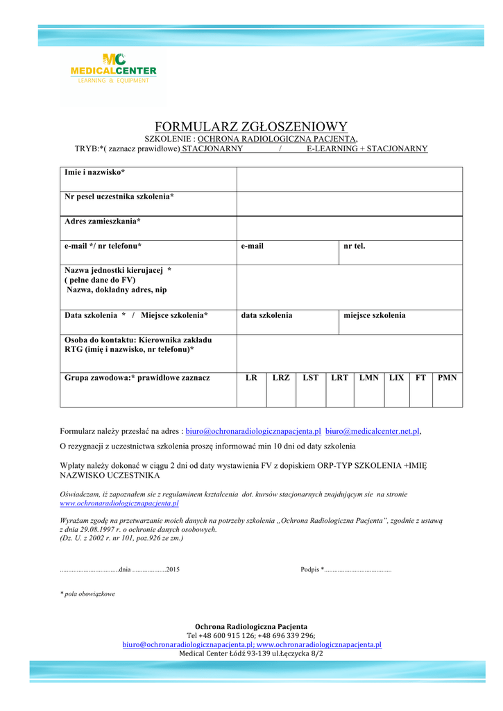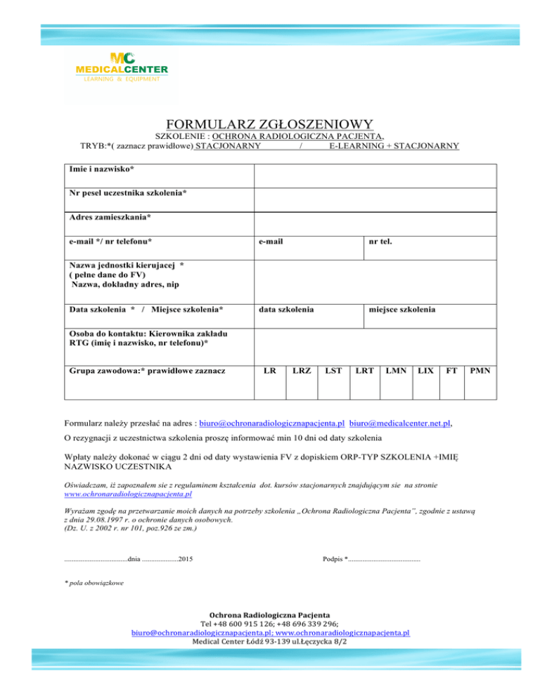 FORMULARZ ZGŁOSZENIOWY SZKOLENIE : OCHRONA RADIOLOGICZNA PACJENTA, TRYB:*( zaznacz prawidłowe) STACJONARNY / E-LEARNING + STACJONARNY Imie i nazwisko* Nr pesel uczestnika szkolenia* Adres zamieszkania* e-mail */ nr telefonu* e-mail nr tel. data szkolenia miejsce szkolenia Nazwa jednostki kierujacej * ( pełne dane do FV) Nazwa, dokładny adres, nip Data szkolenia * / Miejsce szkolenia* Osoba do kontaktu: Kierownika zakładu RTG (imię i nazwisko, nr telefonu)* Grupa zawodowa:* prawidłowe zaznacz LR LRZ LST LRT LMN LIX FT PMN Formularz należy przesłać na adres : [email protected] [email protected], O rezygnacji z uczestnictwa szkolenia proszę informować min 10 dni od daty szkolenia Wpłaty należy dokonać w ciągu 2 dni od daty wystawienia FV z dopiskiem ORP-TYP SZKOLENIA +IMIĘ NAZWISKO UCZESTNIKA Oświadczam, iż zapoznałem sie z regulaminem kształcenia dot. kursów stacjonarnych znajdującym sie na stronie www.ochronaradiologicznapacjenta.pl Wyrażam zgodę na przetwarzanie moich danych na potrzeby szkolenia „Ochrona Radiologiczna Pacjenta”, zgodnie z ustawą z dnia 29.08.1997 r. o ochronie danych osobowych. (Dz. U. z 2002 r. nr 101, poz.926 ze zm.) ...................................dnia ....................2015 Podpis *........................................ * pola obowiązkowe Ochrona Radiologiczna Pacjenta Tel +48 600 915 126; +48 696 339 296; [email protected]; www.ochronaradiologicznapacjenta.pl Medical Center Łódź 93-‐139 ul.Łęczycka 8/2 1