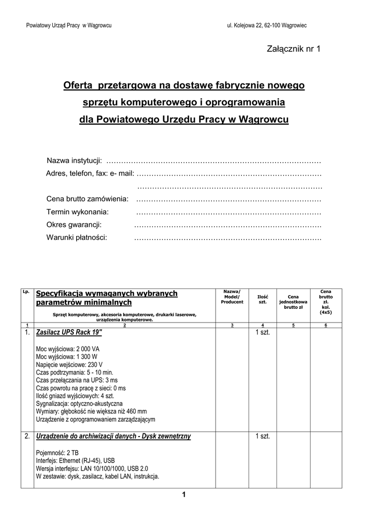 Powiatowy Urząd Pracy w Wągrowcu ul. Kolejowa 22, 62-100 Wągrowiec Załącznik nr 1 Oferta przetargowa na dostawę fabrycznie nowego sprzętu komputerowego i oprogramowania dla Powiatowego Urzędu Pracy w Wągrowcu Nazwa instytucji: …………………………………………………………………………… Adres, telefon, fax: e- mail: ………………………………………………………………… ………………………………………………………………… Lp. 1 Cena brutto zamówienia: ………………………………………………………………… Termin wykonania: ………………………………………………………………… Okres gwarancji: …………………………………………………………………. Warunki płatności: …………………………………………………………………. Nazwa/ Model/ Producent Specyfikacja wymaganych wybranych parametrów minimalnych Sprzęt komputerowy, akcesoria komputerowe, drukarki laserowe, urządzenia komputerowe. 2 1. Zasilacz UPS Rack 19" 3 Ilość szt. Cena jednostkowa brutto zł Cena brutto zł. kol. (4x5) 4 5 6 1 szt. Moc wyjściowa: 2 000 VA Moc wyjściowa: 1 300 W Napięcie wejściowe: 230 V Czas podtrzymania: 5 - 10 min. Czas przełączania na UPS: 3 ms Czas powrotu na pracę z sieci: 0 ms Ilość gniazd wyjściowych: 4 szt. Sygnalizacja: optyczno-akustyczna Wymiary: głębokość nie większa niŜ 460 mm Urządzenie z oprogramowaniem zarządzającym 2. Urządzenie do archiwizacji danych - Dysk zewnętrzny Pojemność: 2 TB Interfejs: Ethernet (RJ-45), USB Wersja interfejsu: LAN 10/100/1000, USB 2.0 W zestawie: dysk, zasilacz, kabel LAN, instrukcja. 1 1 szt. Powiatowy Urząd Pracy w Wągrowcu 1 ul. Kolejowa 22, 62-100 Wągrowiec 2 3 4 8 szt. 3. Kiosk multimedialny Jednostka centralna: Procesor w architekturze x86 o częstotliwości min 2.0 GHz; pojemność pamięci podręcznej: min. 512 KB; częstotliwość magistrali FSB: 800 MHz lub procesor o równowaŜnej wydajności według wyniku testu przeprowadzonego przez oferenta, w przypadku uŜycia przez oferenta testu wydajności zamawiający zastrzega sobie iŜ celem sprawdzenia poprawności przeprowadzonych testów oferent musi dostarczyć zamawiającemu oprogramowanie testujące, oba równowaŜne porównywane zestawy oraz dokładne opisy uŜytych testów wraz z wynikami celem sprawdzenia, w terminie nie dłuŜszym niŜ 3 dni od otrzymania zawiadomienia od zamawiającego. Płyta główna: dedykowana do pracy z powyŜszym procesorem Pamięć RAM: 1024 MB Karta graficzna zintegrowana Karta dźwiękowa zintegrowana Karta sieciowa 10/100/1000 Mbps Dysk twardy: 80 GB, 8mb cache, SATA II Napęd optyczny: DVD-RW Oprogramowanie: Windows XP Home, Oprogramowanie do kiosku: przeglądarka internetowa, pracująca w standardzie IE 6.0 i przystosowana do współpracy z urządzeniami czułymi na dotyk. Oprogramowanie musi zapewnić bezpieczny dostęp do Internetu w miejscu publicznym oraz funkcje powiększania stron. Przeglądarka ma ułatwić korzystanie z zasobów Internetu przez osoby niepełnosprawne. Monitor: LCD, Matryca TN, Obszar widzialny [mm] 19'' Max. rozdzielczość 1280 x 1024, Kąt widzenia poziom 160° Kąt widzenia pion 160° Ekran LCD zintegrowany z nakładką dotykową pojemnościową, kontroler USB Przejrzystość nakładki nie mniej niŜ 91,5% Twardość powierzchni nie mniejsza niŜ 7H w skali Mohsa Rozdzielczość 16 tys x 16 tys punktów (realizowana przez elektronikę sterownika) W komplecie Kiosk ma posiadać urządzenia we/wyj. umoŜliwiające serwisowanie kiosku. Kiosk stojący. (proszę załączyć kolorową ilustrację przedstawiającą urządzenie) 2 5 6 Powiatowy Urząd Pracy w Wągrowcu 1 ul. Kolejowa 22, 62-100 Wągrowiec 2 3 4. Zestaw komputerowy: j. centralna, monitor, mysz, klawiatura, oprogramowanie. Procesor: w architekturze x86 dwurdzeniowy 64 bitowy o częstotliwości min 2.53 GHz pojemność pamięci podręcznej: min. 3MB; częstotliwość magistrali FSB: 1066 MHz lub procesor o równowaŜnej wydajności według wyniku testu przeprowadzonego przez oferenta, w przypadku uŜycia przez oferenta testu wydajności zamawiający zastrzega sobie iŜ celem sprawdzenia poprawności przeprowadzonych testów oferent musi dostarczyć zamawiającemu oprogramowanie testujące, oba równowaŜne porównywane zestawy oraz dokładne opisy uŜytych testów wraz z wynikami celem sprawdzenia, w terminie nie dłuŜszym niŜ 3 dni od otrzymania zawiadomienia od zamawiającego. Płyta główna : dedykowana do pracy z powyŜszym procesorem. Pamięć RAM: 2 GB DDR2-667 Dysk twardy (HDD): HDD SATAII 250 GB Napęd optyczny: DVD+/-RW DL Układ graficzny: zintegrowany z płytą główną Karta dźwiękowa: zintegrowana z płytą główną Karta sieciowa: zintegrowana z płytą główną, 10/100/1000 Stacja FDD: 3,5’’, 1,44 MB Złącza: 1x LPT,1x VGA, 6x USB, 1x COM, 1x RJ45, 2x PS/2 Obudowa: Dostęp do złącza USB równieŜ od przodu obudowy. Zasilacz: 400W Monitor: LCD, 17 cali, rozdzielczość nominalna1280 x 1024 piksele, analogowe złącze D-Sub 15-pin. Klawiatura: płaska, interfejs PS2 Praca w systemie Windows XP Mysz: optyczna do komputerów przenośnych, interfejs PS2, rolka, Praca w systemie Windows XP. Oprogramowanie: OS Windows XP Pro PL Microsoft Office Pro 2007 PL OEM 3 4 6 szt. 5 6 Powiatowy Urząd Pracy w Wągrowcu 1 ul. Kolejowa 22, 62-100 Wągrowiec 2 3 4 2 szt. 5. Notebook z torbą Procesor: w architekturze x86 dwurdzeniowy 64 bitowy o częstotliwości min 2.26 GHz zaprojektowany do pracy w urządzeniach przenośnych; pojemność pamięci podręcznej: min. 3MB; częstotliwość magistrali FSB: 1066 MHz lub procesor o równowaŜnej wydajności według wyniku testu przeprowadzonego przez oferenta, w przypadku uŜycia przez oferenta testu wydajności zamawiający zastrzega sobie iŜ celem sprawdzenia poprawności przeprowadzonych testów oferent musi dostarczyć zamawiającemu op