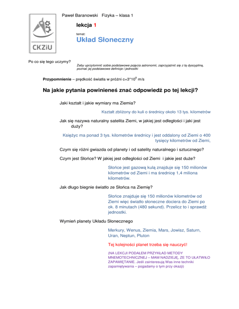 Paweł Baranowski Fizyka – klasa 1 lekcja 1 temat: Układ Słoneczny Po co się tego uczymy? Żeby uprzytomnić sobie podstawowe pojęcia astronomii, zaprzyjaźnić się z tą dyscypliną, poznać jej podstawowe definicje i jednostki 8 Przypomnienie – prędkość światła w próżni c=3*10 m/s Na jakie pytania powinieneś znać odpowiedź po tej lekcji? Jaki kształt i jakie wymiary ma Ziemia? Kształt zbliżony do kuli o średnicy około 13 tys. kilometrów Jak się nazywa naturalny satelita Ziemi, w jakiej jest odległości i jaki jest duży? Księżyc ma ponad 3 tys. kilometrów średnicy i jest oddalony od Ziemi o 400 tysięcy kilometrów od Ziemi, Czym się różni gwiazda od planety i od satelity naturalnego i sztucznego? Czym jest Słońce? W jakiej jest odległości od Ziemi i jakie jest duże? Słońce jest gazową kulą znajduje się 150 milionów kilometrów od Ziemi i ma średnicę 1,4 miliona kilometrów. Jak długo biegnie światło ze Słońca na Ziemię? Słońce znajduje się 150 milionów kilometrów od Ziemi więc światło słoneczne dociera do Ziemi po ok. 8 minutach (480 sekund). Przelicz to i sprawdź jednostki. Wymień planety Układu Słonecznego Merkury, Wenus, Ziemia, Mars, Jowisz, Saturn, Uran, Neptun, Pluton Tej kolejności planet trzeba się nauczyć! (NA LEKCJI PODAŁEM PRZYKŁAD METODY MNEMOTECHNICZNEJ – MAM NADZIEJĘ, ZE TO UŁATWIŁO ZAPAMIĘTANIE. Jeśli zainteresują Was inne techniki zapamiętywania – pogadamy o tym przy okazji) Co to jest rok świetlny i w jakim celu wprowadzono taka jednostkę? Rok świetlny to odległość, którą światło pokonuje w ciągu roku. Jaka odległość dzieli nas od najbliższej gwiazdy innej niż Słońce Ta gwiazda to Proxima Centauri . Jest odległa od nas o 4 lata świetlne Dlaczego Gwiazda Polarna wskazuje północ i jaka gwiazda wskazuje południe? Jest to skutkiem obrotu Ziemi wokół własnej osi, która przechodzi właśnie przez Gwiazdę Polarną. Na półkuli Południowej nie ma w tym miejscu żadnej jasnej gwiazdy. Zadania do samodzielnego rozwiązania. Przypomnij (mówiliśmy o tym na lekcji), dlaczego robaczka świętojańskiego nie można uznać, za gwiazdę, skoro unosi się on we Wszechświecie i jest pierwotnym źródłem światła. (nie pisz tego w zeszycie, tylko zastanów się, czy to rozumiesz) Oblicz jak długo biegnie światło z Księżyca do Ziemi? Ponad jedną sekundę. Jak długo jechałbyś na Księżyc samochodem, z prędkością 100 km/godzinę? Przyjmij, że Ziemia jest wielkości piłki nożnej (PATRZ UWAGA NA DOLE – PRZELICZ OBWÓD NA ŚREDNICĘ I ZAOKRĄGLIJ). Zachowując proporcje napisz, w jakiej odległości od piłki znajdowałby się Słońce i jakie byłoby duże oraz w jakiej odległości byłby Księżyc i jaki byłby duży. Jeśli masz problem ze zrozumieniem materiału – wyślij mailem [email protected] informację – czego nie rozumiesz. Postaram się wyjaśnić to na kolejnej lekcji. Pytania mogą dotyczyć tylko szczegółów – nie dopuszczam stwierdzeń typu „WSZYSTKO JEST NIEZROZUMIAŁE” SPRAWA PIŁKI Zgodnie z wymogami piłka nożna musi być kulista sporządzona ze skóry lub innego dozwolonego materiału o obwodzie nie większym niż 70 cm i nie mniejszym niż 68 cm o masie nie przekraczającej 450 g i nie mniejszej niż 410 g, przy rozpoczęciu zawodów napompowana tak, że w jej wnętrzu panuje nadciśnienie od 0,6 do 1,1 atm. Zwyczajowo wykonywana jest z 32 skórzanych, pięcio- i sześciokątnych łat w kolorach czarnym i białym.