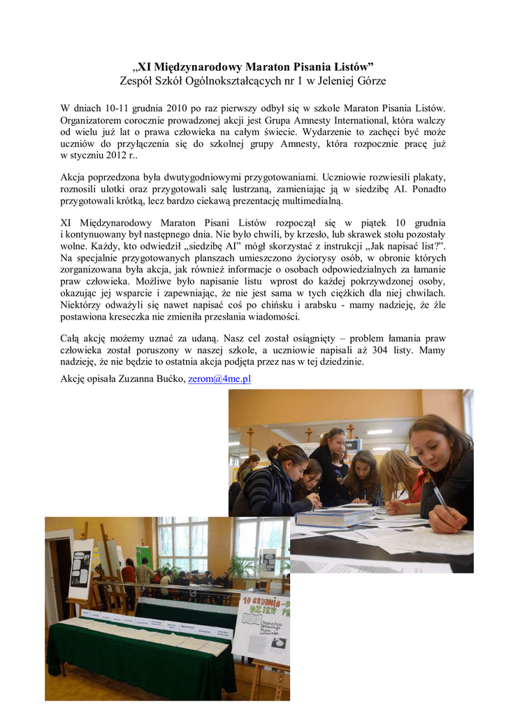 „XI Międzynarodowy Maraton Pisania Listów” Zespół Szkół Ogólnokształcących nr 1 w Jeleniej Górze W dniach 10-11 grudnia 2010 po raz pierwszy odbył się w szkole Maraton Pisania Listów. Organizatorem corocznie prowadzonej akcji jest Grupa Amnesty International, która walczy od wielu juŜ lat o prawa człowieka na całym świecie. Wydarzenie to zachęci być moŜe uczniów do przyłączenia się do szkolnej grupy Amnesty, która rozpocznie pracę juŜ w styczniu 2012 r.. Akcja poprzedzona była dwutygodniowymi przygotowaniami. Uczniowie rozwiesili plakaty, roznosili ulotki oraz przygotowali salę lustrzaną, zamieniając ją w siedzibę AI. Ponadto przygotowali krótką, lecz bardzo ciekawą prezentację multimedialną. XI Międzynarodowy Maraton Pisani Listów rozpoczął się w piątek 10 grudnia i kontynuowany był następnego dnia. Nie było chwili, by krzesło, lub skrawek stołu pozostały wolne. KaŜdy, kto odwiedził „siedzibę AI” mógł skorzystać z instrukcji „Jak napisać list?”. Na specjalnie przygotowanych planszach umieszczono Ŝyciorysy osób, w obronie których zorganizowana była akcja, jak równieŜ informacje o osobach odpowiedzialnych za łamanie praw człowieka. MoŜliwe było napisanie listu wprost do kaŜdej pokrzywdzonej osoby, okazując jej wsparcie i zapewniając, Ŝe nie jest sama w tych cięŜkich dla niej chwilach. Niektórzy odwaŜyli się nawet napisać coś po chińsku i arabsku - mamy nadzieję, Ŝe źle postawiona kreseczka nie zmieniła przesłania wiadomości. Całą akcję moŜemy uznać za udaną. Nasz cel został osiągnięty – problem łamania praw człowieka został poruszony w naszej szkole, a uczniowie napisali aŜ 304 listy. Mamy nadzieję, Ŝe nie będzie to ostatnia akcja podjęta przez nas w tej dziedzinie. Akcję opisała Zuzanna Bućko, [email protected]