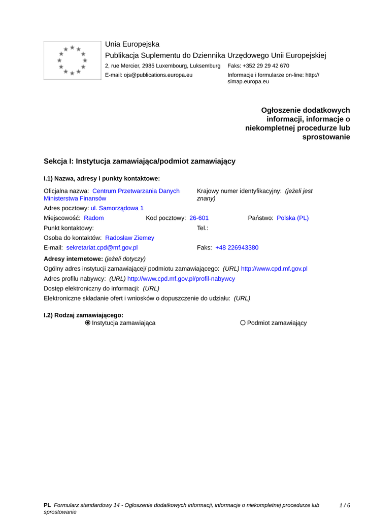 Unia Europejska Publikacja Suplementu do Dziennika Urzędowego Unii Europejskiej 2, rue Mercier, 2985 Luxembourg, Luksemburg Faks: +352 29 29 42 670 E-mail: [email protected] Informacje i formularze on-line: http:// simap.europa.eu Ogłoszenie dodatkowych informacji, informacje o niekompletnej procedurze lub sprostowanie Sekcja I: Instytucja zamawiająca/podmiot zamawiający I.1) Nazwa, adresy i punkty kontaktowe: Oficjalna nazwa: Centrum Przetwarzania Danych Ministerstwa Finansów Krajowy numer identyfikacyjny: (jeżeli jest znany) _____ Adres pocztowy: ul. Samorządowa 1 Miejscowość: Radom Kod pocztowy: 26-601 Punkt kontaktowy: _____ Państwo: Polska (PL) Tel.: _____ Osoba do kontaktów: Radosław Ziemey E-mail: [email protected] Faks: +48 226943380 Adresy internetowe: (jeżeli dotyczy) Ogólny adres instytucji zamawiającej/ podmiotu zamawiającego: (URL) http://www.cpd.mf.gov.pl Adres profilu nabywcy: (URL) http://www.cpd.mf.gov.pl/profil-nabywcy Dostęp elektroniczny do informacji: (URL) _____ Elektroniczne składanie ofert i wniosków o dopuszczenie do udziału: (URL) _____ I.2) Rodzaj zamawiającego: Instytucja zamawiająca Podmiot zamawiający PL Formularz standardowy 14 - Ogłoszenie dodatkowych informacji, informacje o niekompletnej procedurze lub sprostowanie 1/6 Sekcja II: Przedmiot zamówienia II.1.1) Nazwa nadana zamówieniu: Usługi poczty elektronicznej (rozbudowa poczty elektronicznej w Resorcie Finansów) II.1.2) Krótki opis zamówienia lub zakupu: (podano w pierwotnym ogłoszeniu) 1. Przedmiotem zamówienia jest rozbudowa istniejącej infrastruktury systemu poczty elektronicznej poprzez: 1) opracowanie projektu wykonawczego rozbudowy systemu, planu testów akceptacyjnych rozbudowy systemu, scenariuszy testów akceptacyjnych rozbudowy systemu, harmonogramu rozbudowy systemu, macierzy odpowiedzialności. 2) dostawa macierzy dyskowych, serwerów, urządzeń bezpieczeństwa, licencji (CAL Exchange Standard per Devices, CAL Exchange Standard per User, CAL Windows Exchange Serwer Standard, Exchange Serwer Enterprise, Windows Server Standard, CAL Windows) lub równoważnych, 3) wykonanie usług związanych z rozbudową systemu poczty elektronicznej; 4) dostarczenie i wdrożenie systemu monitorowania serwerów poczty elektronicznej; 5) dostarczenie i wdrożenie systemu audytowania dla 3000 kont; 6) wykonanie dokumentacji powykonawczej, 7) udzielanie przez okres 2 tygodni wsparcia w rozwiązywaniu problemów powstających podczas wykonywania czynności 8) przeprowadzenie przeszkoleń, 9) świadczenie Dedykowanej Asysty Technicznej w ilości 2500 roboczogodzin, 10) udzielenie gwarancji na dostarczony Sprzęt i Oprogramowanie przez okres 36 miesięcy od dnia podpisania Protokołu odbioru końcowego Umowy, 2. Zamawiający zastrzega sobie możliwość skorzystania z prawa opcji w zakresie m.in: 1) Modułu archiwizacji poczty elektronicznej; 2) Rozbudowy liczby użytkowników kompletnego systemu poczty elektronicznej, zawierający w sobie licencje na system poczty elektronicznej, system archiwizacji, system monitorowania dla 60 000 kont użytkowników; 3) Rozszerzenia liczby licencji oprogramowania do audytu usługi poczty elektronicznej; 4) Rozszerzenia liczby godzin dedykowanej asysty technicznej realizowanej przez Wykonawcę; 5) Mechanizmów ochrony systemu poczty elektronicznej – kopia zapasowa. 3. Zakres i sposób realizacji zamówienia odnosi się również do Prawa Opcji. II.1.3) Wspólny Słownik Zamówień (CPV) Główny przedmiot Dodatkowe przedmioty Słownik główny 48811000 48000000 48822000 72611000 Słownik uzupełniający (jeżeli dotyczy) PL Formularz standardowy 14 - Ogłoszenie dodatkowych informacji, informacje o niekompletnej procedurze lub sprostowanie 2/6 Sekcja IV: Procedura IV.1)Rodzaj procedury (podano w pierwotnym ogłoszeniu) Otwarta Ograniczona Ograniczona przyspieszona Negocjacyjna Negocjacyjna przyspieszona Dialog konkurencyjny Negocjacyjna z uprzednim ogłoszeniem Negocjacyjna bez uprzedniego ogłoszenia Negocjacyjna z publikacją ogłoszenia o zamówieniu Negocjacyjna bez publikacji ogłoszenia o zamówieniu Udzielenie zamówienia bez uprzedniej publikacji ogłoszenia o zamówieniu w Dzienniku Urzędowym Unii Europejskiej IV.2)Informacje administracyjne IV.2.1)Numer referencyjny: (podano w pierwotnym ogłoszeniu) PN/18/15/RZE IV.2.2)Dane referencyjne ogłoszenia w przypadku ogłoszeń przesłanych drogą elektroniczną: Pierwotne ogłoszenie przesłane przez eNotices TED eSender Login: ENOTICES_CPDMF123 Dane referencyjne ogłoszenia: 2015-172097 rok i numer dokumentu IV.2.3)Ogłoszenie, którego dotyczy niniejsza publikacja: Numer ogłoszenia w Dz.U.: 2015/S 249-454095 z dnia: 24/12/2015 (dd/mm/rrrr) IV.2.4)Data wysłania pierwotnego ogłoszenia: 22/12/2015 (dd/mm/rrrr) PL Formularz standardowy 14 - Ogłoszenie dodatkowych informacji, informacje o niekompletnej procedurze lub sprostowanie 3/6 Sekcja VI: Informacje uzupełniające VI.1) Ogłoszenie dotyczy: Procedury niepełnej Sprostowania Informacji dodatkowych VI.2) Informacje na temat niepełnej procedury udzielenia zamówienia: Postępowanie o udzielenie zamówienia zostało przerwane Postępowanie o udzielenie zamówienia uznano za nieskuteczne Zamówienia nie udzielono Zamówienie może być przedmiotem ponownej publikacji VI.3) Informacje do poprawienia lub dodania : VI.3.1) Zmiana oryginalnej informacji podanej przez instytucję zamawiającą Publikacja w witrynie TED niezgodna z oryginalną informacją, przekazaną przez instytucję zamawiającą Oba przypadki VI.3.2) W ogłoszeniu pierwotnym W odpowiedniej dokumentacji przetargowej (więcej informacji w odpowiedniej dokumentacji przetargowej) W obu przypadkach (więcej informacji w odpowiedniej dokumentacji przetargowej) VI.3.3) Tekst, który należy poprawić w pierwotnym ogłoszeniu Miejsce, w którym znajduje się Zamiast: Powinno być: zmieniany tekst: 2. Warunek zostanie uznany za 2. Warunek zostanie uznany za III.2.3) Kwalifikacj