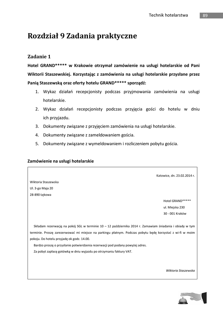 Technik hotelarstwa Rozdział 9 Zadania praktyczne Zadanie 1 Hotel GRAND***** w Krakowie otrzymał zamówienie na usługi hotelarskie od Pani Wiktorii Staszewskiej. Korzystając z zamówienia na usługi hotelarskie przysłane przez Panią Staszewską oraz oferty hotelu GRAND***** sporządź: 1. Wykaz działań recepcjonisty podczas przyjmowania zamówienia na usługi hotelarskie. 2. Wykaz działań recepcjonisty podczas przyjęcia gości do hotelu w dniu ich przyjazdu. 3. Dokumenty związane z przyjęciem zamówienia na usługi hotelarskie. 4. Dokumenty związane z zameldowaniem gościa. 5. Dokumenty związane z wymeldowaniem i rozliczeniem pobytu gościa. Zamówienie na usługi hotelarskie Katowice, dn. 23.02.2014 r. Wiktoria Staszewska Ul. 3-go Maja 20 28-890 Łękowa Hotel GRAND***** ul. Miejska 230 30 - 001 Kraków Składam rezerwację na pokój SGL w terminie 10 – 12 października 2014 r. Zamawiam śniadania i obiady w tym terminie. Proszę zarezerwować mi miejsce na parkingu płatnym. Podczas pobytu będę korzystać z wi-fi w moim pokoju. Do hotelu przyjadę ok godz. 14.00. Bardzo proszę o przysłanie potwierdzenia rezerwacji pod podany powyżej adres. Za pobyt zapłacę gotówką w dniu wyjazdu po otrzymaniu faktury VAT. Wiktoria Staszewska 89