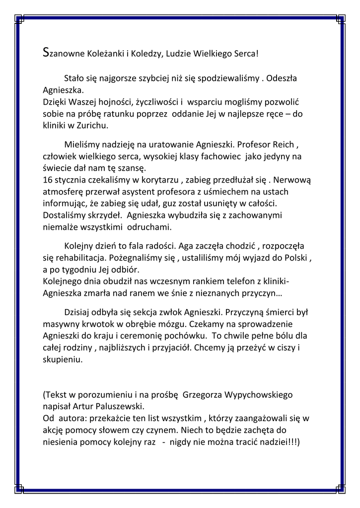 Szanowne Koleżanki i Koledzy, Ludzie Wielkiego Serca! Stało się najgorsze szybciej niż się spodziewaliśmy . Odeszła Agnieszka. Dzięki Waszej hojności, życzliwości i wsparciu mogliśmy pozwolić sobie na próbę ratunku poprzez oddanie Jej w najlepsze ręce – do kliniki w Zurichu. Mieliśmy nadzieję na uratowanie Agnieszki. Profesor Reich , człowiek wielkiego serca, wysokiej klasy fachowiec jako jedyny na świecie dał nam tę szansę. 16 stycznia czekaliśmy w korytarzu , zabieg przedłużał się . Nerwową atmosferę przerwał asystent profesora z uśmiechem na ustach informując, że zabieg się udał, guz został usunięty w całości. Dostaliśmy skrzydeł. Agnieszka wybudziła się z zachowanymi niemalże wszystkimi odruchami. Kolejny dzień to fala radości. Aga zaczęła chodzić , rozpoczęła się rehabilitacja. Pożegnaliśmy się , ustaliliśmy mój wyjazd do Polski , a po tygodniu Jej odbiór. Kolejnego dnia obudził nas wczesnym rankiem telefon z klinikiAgnieszka zmarła nad ranem we śnie z nieznanych przyczyn… Dzisiaj odbyła się sekcja zwłok Agnieszki. Przyczyną śmierci był masywny krwotok w obrębie mózgu. Czekamy na sprowadzenie Agnieszki do kraju i ceremonię pochówku. To chwile pełne bólu dla całej rodziny , najbliższych i przyjaciół. Chcemy ją przeżyć w ciszy i skupieniu. (Tekst w porozumieniu i na prośbę Grzegorza Wypychowskiego napisał Artur Paluszewski. Od autora: przekażcie ten list wszystkim , którzy zaangażowali się w akcję pomocy słowem czy czynem. Niech to będzie zachęta do niesienia pomocy kolejny raz - nigdy nie można tracić nadziei!!!)