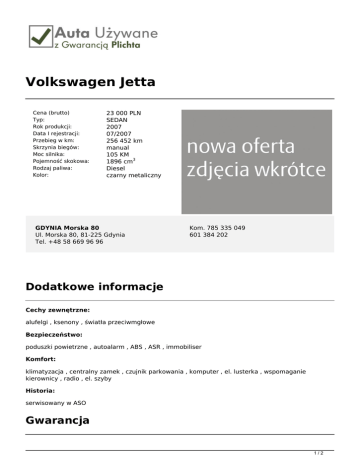 Volkswagen Jetta Cena (brutto) Typ: Rok produkcji: Data I rejestracji: Przebieg w km: Skrzynia biegów: Moc silnika: Pojemność skokowa: Rodzaj paliwa: Kolor: 23 000 PLN SEDAN 2007 07/2007 256 452 km manual 105 KM 1896 cm3 Diesel czarny metaliczny GDYNIA Morska 80 Ul. Morska 80, 81-225 Gdynia Tel. +48 58 669 96 96 Kom. 785 335 049 601 384 202 Dodatkowe informacje Cechy zewnętrzne: alufelgi , ksenony , światła przeciwmgłowe Bezpieczeństwo: poduszki powietrzne , autoalarm , ABS , ASR , immobiliser Komfort: klimatyzacja , centralny zamek , czujnik parkowania , komputer , el. lusterka , wspomaganie kierownicy , radio , el. szyby Historia: serwisowany w ASO Gwarancja 1/2 Szanowni Państwo, Pragniemy Państwa poinformować, iż firma Plichta – Autoryzowany Dealer Škoda Auto prowadzi skup oraz sprzedaż samochodów używanych wszystkich marek, oferując także samochody używane z gwarancją objęte programem „Auta używane z Gwarancją Plichta”. W ramach programu „Auta Używane z Gwarancją Plichta ” każdy Klient otrzymuje atrakcyjny pakiet zniżek pozwalający zoptymalizować koszty eksploatacji samochodu: -50% na serwis klimatyzacji -50% na ustawienie zbieżności -50% na kosmetykę auta -50% na ścieżkę diagnostyczną -25% na wymiany oleju -25% na zakup opon + 5zł na sezon za hotelowanie opon -15% na części i akcesoria Oferujemy również kompleksową obsługę w zakresie finansowania i ubezpieczenia: - kredyty już od 4,99% - leasingi i kredyty bez zaświadczeń - uproszczone procedury – decyzja już od 30 min. - atrakcyjne pakiety AC/OC/NW/ASS wiodących firm ubezpieczeniowych Możliwość pozostawienia dotychczas użytkowanego auta w rozliczeniu – BEZPŁATNA WYCENA!!! Zapraszamy wszystkich Klientów na jazdę próbną wybranym autem. Numer oferty: B 183 Informacja nie stanowi oferty w rozumieniu art. 66 KC. Podane dane mają charakter wyłącznie informacyjny. 2/2 Powered by TCPDF (www.tcpdf.org)