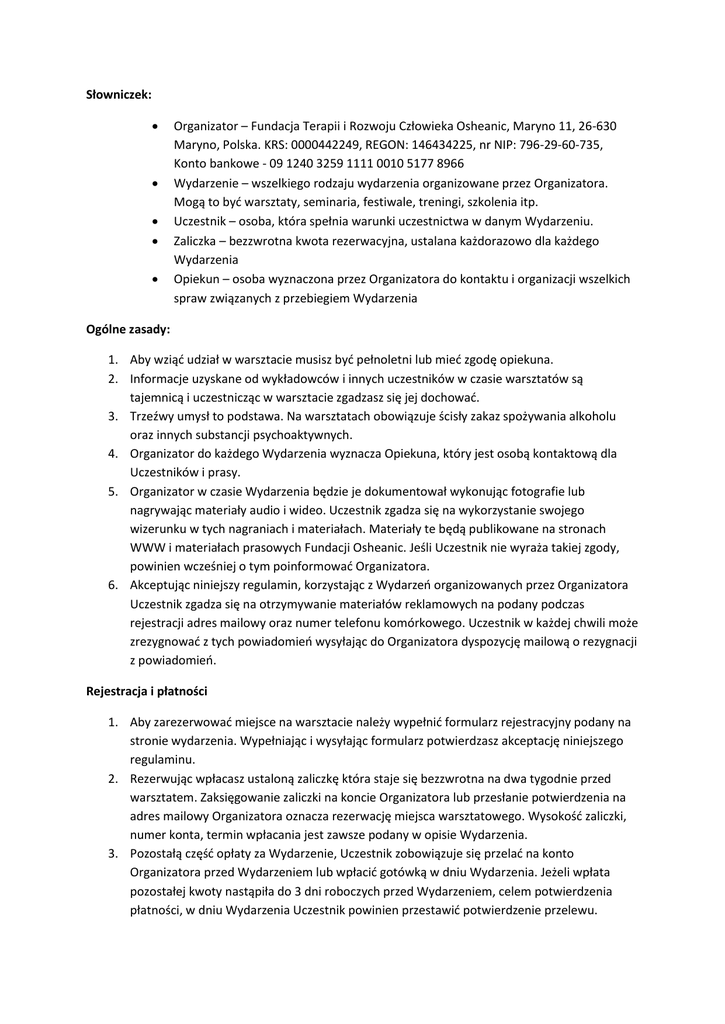 Słowniczek: Organizator – Fundacja Terapii i Rozwoju Człowieka Osheanic, Maryno 11, 26-630 Maryno, Polska. KRS: 0000442249, REGON: 146434225, nr NIP: 796-29-60-735, Konto bankowe - 09 1240 3259 1111 0010 5177 8966 Wydarzenie – wszelkiego rodzaju wydarzenia organizowane przez Organizatora. Mogą to być warsztaty, seminaria, festiwale, treningi, szkolenia itp. Uczestnik – osoba, która spełnia warunki uczestnictwa w danym Wydarzeniu. Zaliczka – bezzwrotna kwota rezerwacyjna, ustalana każdorazowo dla każdego Wydarzenia Opiekun – osoba wyznaczona przez Organizatora do kontaktu i organizacji wszelkich spraw związanych z przebiegiem Wydarzenia Ogólne zasady: 1. Aby wziąć udział w warsztacie musisz być pełnoletni lub mieć zgodę opiekuna. 2. Informacje uzyskane od wykładowców i innych uczestników w czasie warsztatów są tajemnicą i uczestnicząc w warsztacie zgadzasz się jej dochować. 3. Trzeźwy umysł to podstawa. Na warsztatach obowiązuje ścisły zakaz spożywania alkoholu oraz innych substancji psychoaktywnych. 4. Organizator do każdego Wydarzenia wyznacza Opiekuna, który jest osobą kontaktową dla Uczestników i prasy. 5. Organizator w czasie Wydarzenia będzie je dokumentował wykonując fotografie lub nagrywając materiały audio i wideo. Uczestnik zgadza się na wykorzystanie swojego wizerunku w tych nagraniach i materiałach. Materiały te będą publikowane na stronach WWW i materiałach prasowych Fundacji Osheanic. Jeśli Uczestnik nie wyraża takiej zgody, powinien wcześniej o tym poinformować Organizatora. 6. Akceptując niniejszy regulamin, korzystając z Wydarzeń organizowanych przez Organizatora Uczestnik zgadza się na otrzymywanie materiałów reklamowych na podany podczas rejestracji adres mailowy oraz numer telefonu komórkowego. Uczestnik w każdej chwili może zrezygnować z tych powiadomień wysyłając do Organizatora dyspozycję mailową o rezygnacji z powiadomień. Rejestracja i płatności 1. Aby zarezerwować miejsce na warsztacie należy wypełnić formularz rejestracyjny podany na stronie wydarzenia. Wypełniając i wysyłając formularz potwierdzasz akceptację niniejszego regulaminu. 2. Rezerwując wpłacasz ustaloną zaliczkę która staje się bezzwrotna na dwa tygodnie przed warsztatem. Zaksięgowanie zaliczki na koncie Organizatora lub przesłanie potwierdzenia na adres mailowy Organizatora oznacza rezerwację miejsca warsztatowego. Wysokość zaliczki, numer konta, termin wpłacania jest zawsze podany w opisie Wydarzenia. 3. Pozostałą część opłaty za Wydarzenie, Uczestnik zobowiązuje się przelać na konto Organizatora przed Wydarzeniem lub wpłacić gotówką w dniu Wydarzenia. Jeżeli wpłata pozostałej kwoty nastąpiła do 3 dni roboczych przed Wydarzeniem, celem potwierdzenia płatności, w dniu Wydarzenia Uczestnik powinien przestawić potwierdzenie przelewu. 4. Opłata za warsztat nie podlega zmianom, nawet jeśli Uczestnik samodzielnie zrezygnuje z części Wydarzenia. 5. Wpłacając zaliczkę należy podać swoje dane kontaktowe. 6. Zaliczka nie podlega zwrotowi na dwa tygodnie przed warsztatem, chyba, że Wydarzenie nie odbędzie się z winy Organizatora. Postanowienia końcowe 1. Organizator dokłada wszelkich starań, aby Wydarzenie odbyło się w możliwie jak najlepszych warunkach. Nie ponosi jednakowoż żadnej odpowiedzialności za skutki, wiedzę i jej wykorzystanie przez Uczestnika. 2. Wydarzenia są organizowane w celach informacyjnych. Zaproszeni Wykładowcy i Trenerzy biorą odpowiedzialność za swoje Wykłady i wiedzę, którą przekazują.
